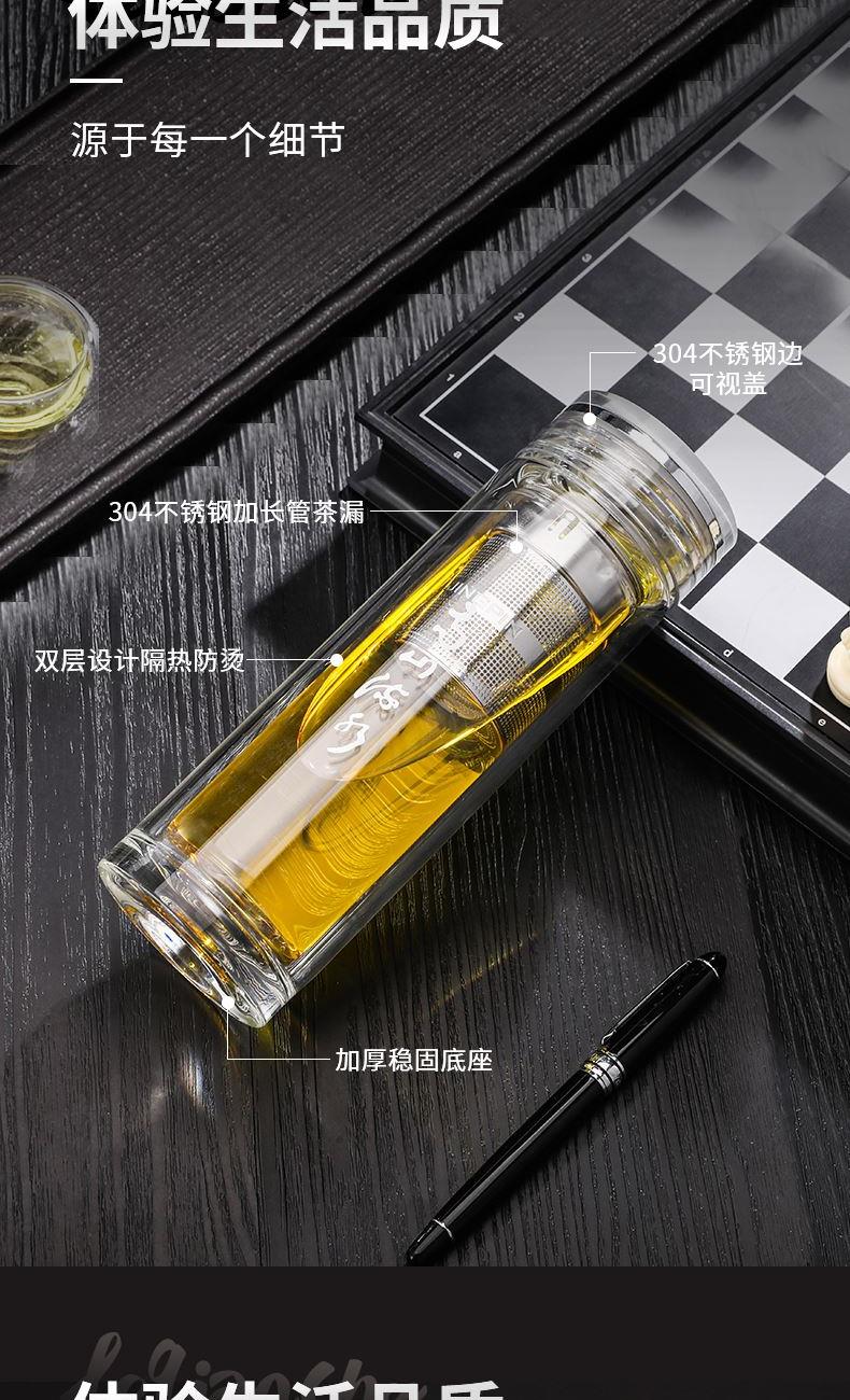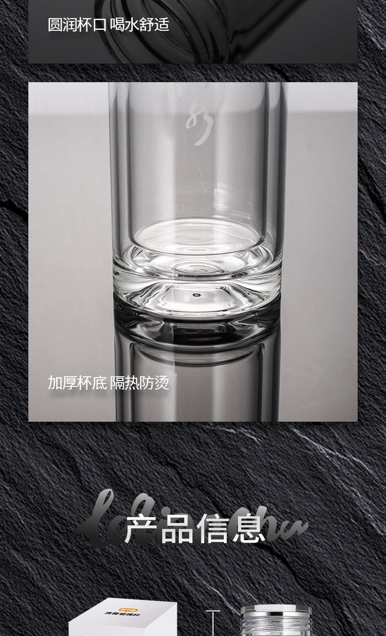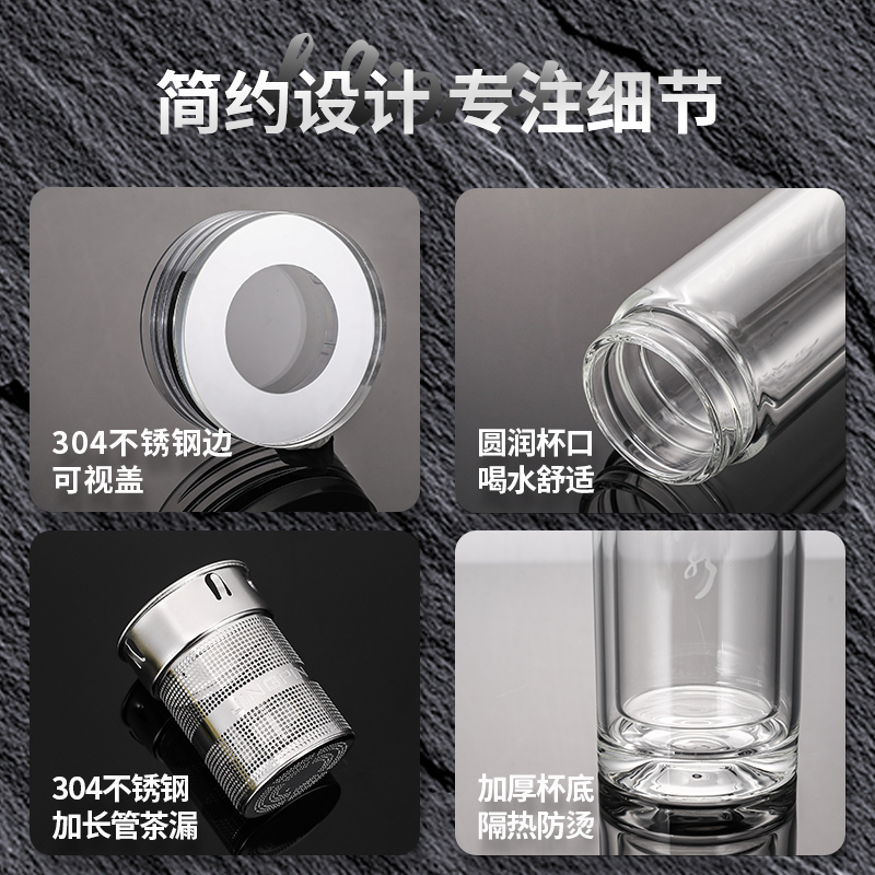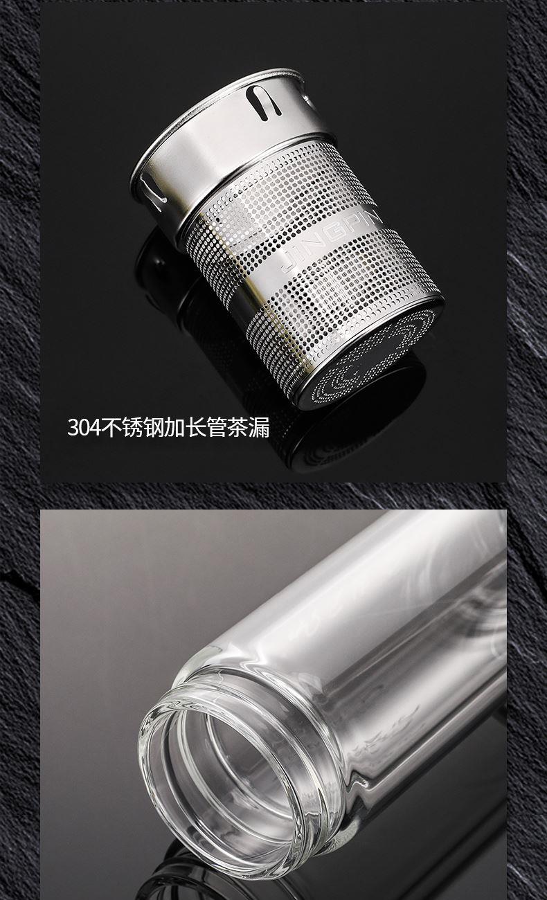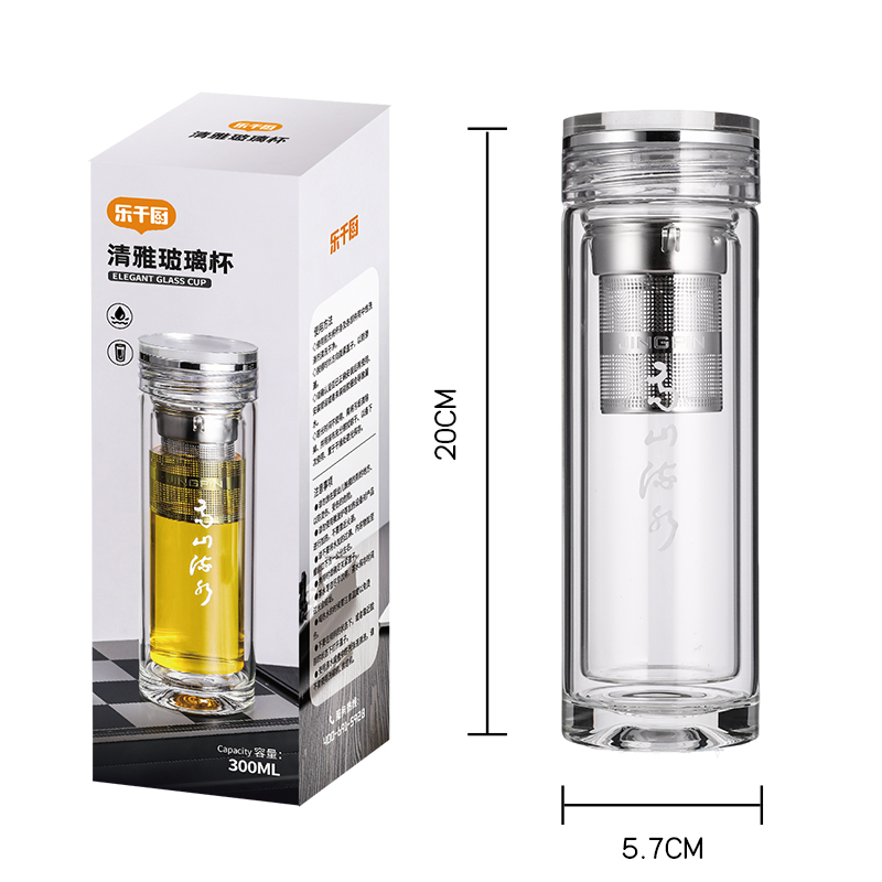 材 质:高硼硅玻璃 容 量:300ml 彩盒尺寸:6.9*6.9*21cm 1. 双层高硼硅玻璃材质,经800℃高温烧制,环保无有害物质,双层设计隔热防烫 2. 304不锈钢边可视盖,可拧开投茶,操作简单便捷 3. 304不锈钢加长管茶漏,轻提即实现茶水分离,茶汤清澈无茶渣