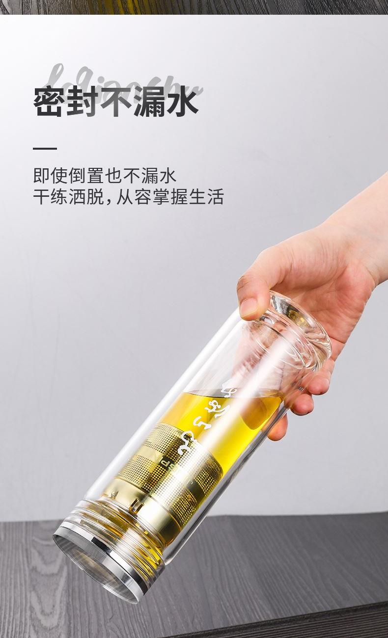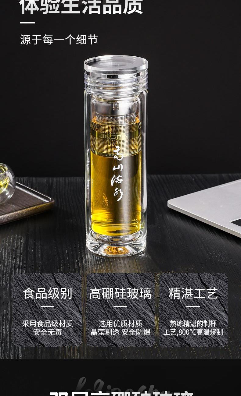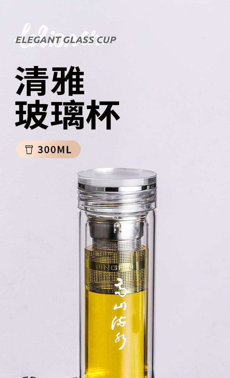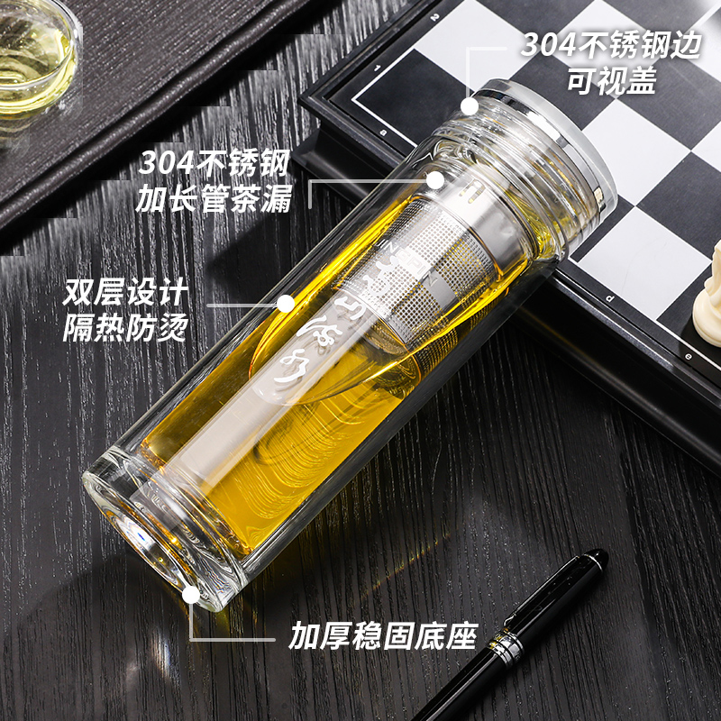 材 质:高硼硅玻璃 容 量:300ml 彩盒尺寸:6.9*6.9*21cm 1. 双层高硼硅玻璃材质,经800℃高温烧制,环保无有害物质,双层设计隔热防烫 2. 304不锈钢边可视盖,可拧开投茶,操作简单便捷 3. 304不锈钢加长管茶漏,轻提即实现茶水分离,茶汤清澈无茶渣