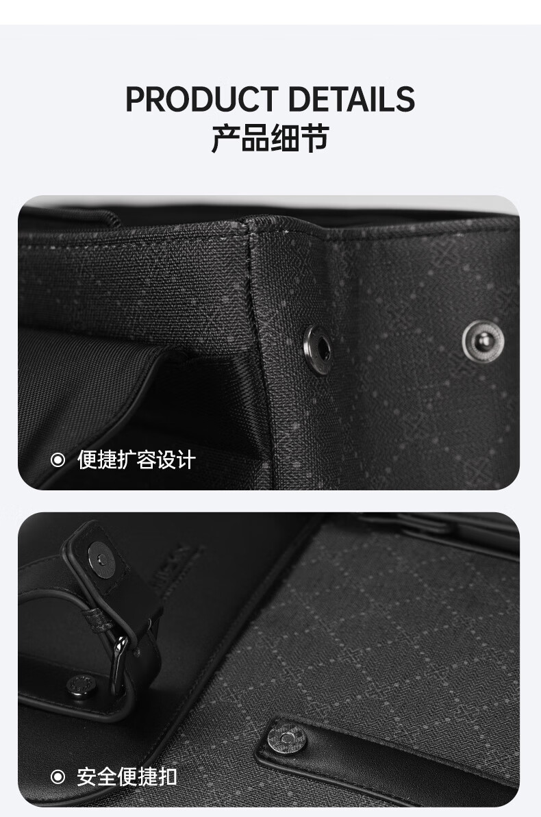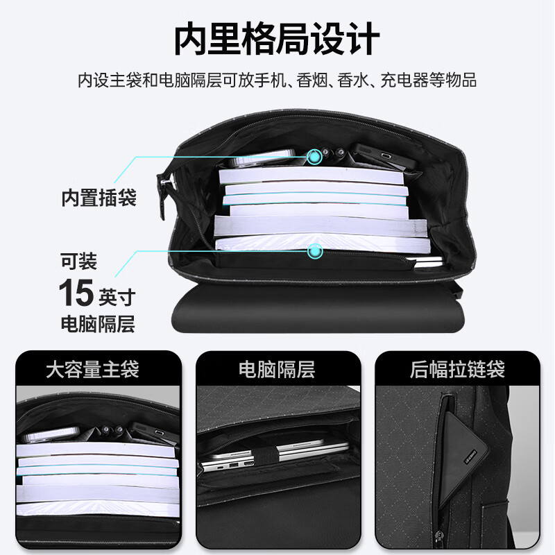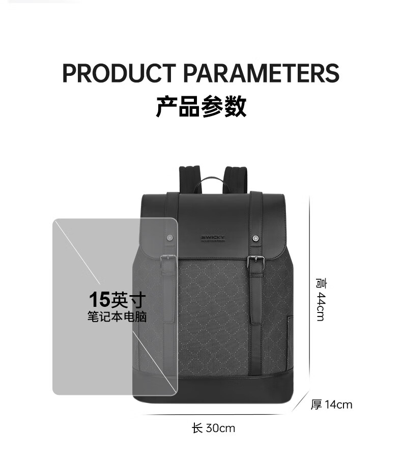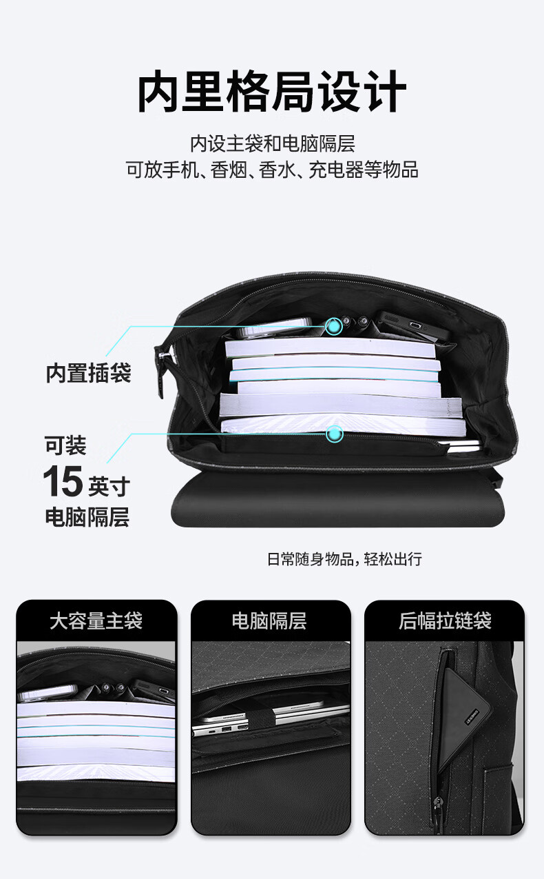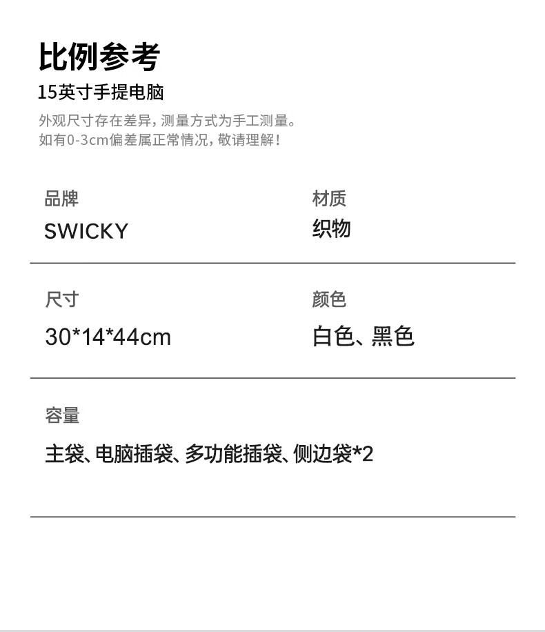 型 号:88176 尺 寸:140*300*440(MM) 材 质:织物 颜 色:黑色/白色 重 量:1.0KG .超大容量设计可放15.6寸电脑; 3.主袋内加厚电脑隔层; 4.磁吸闭合设计.