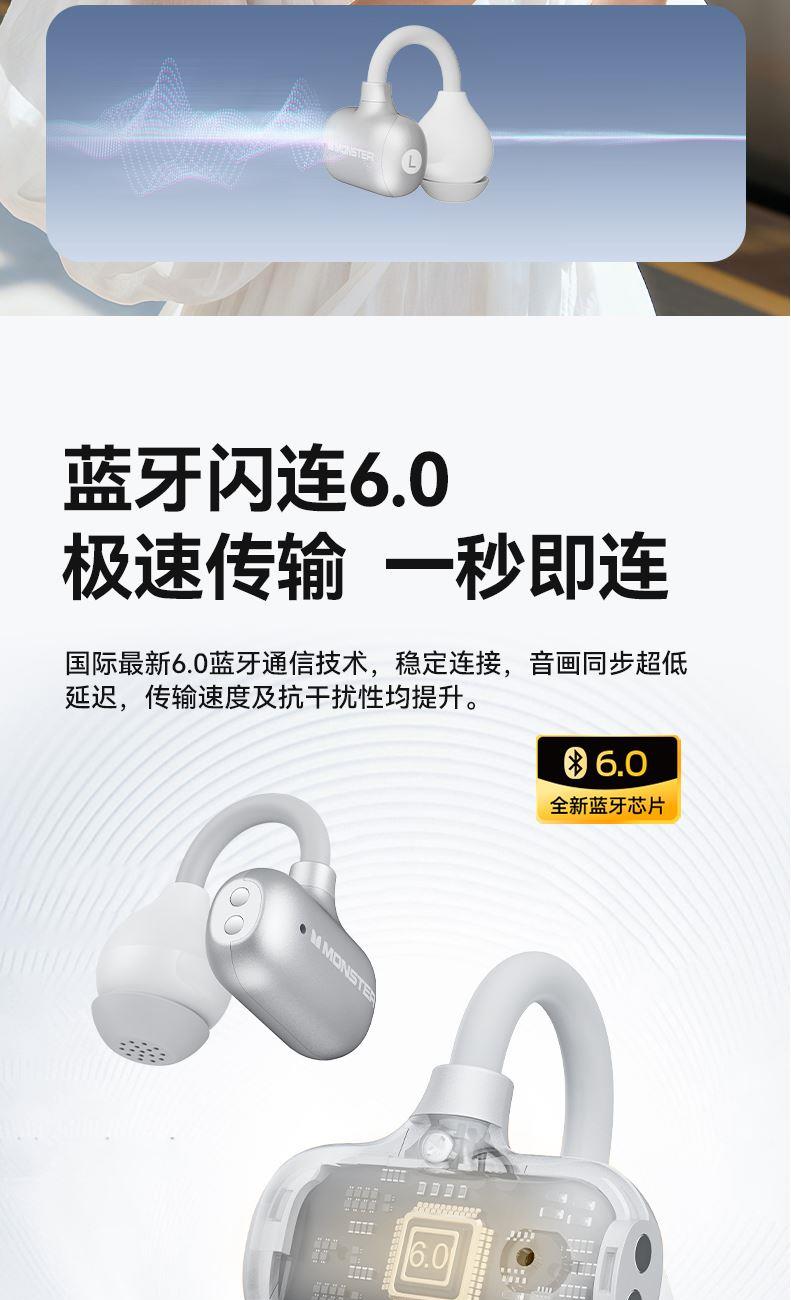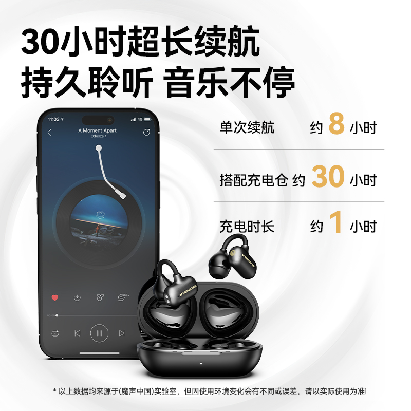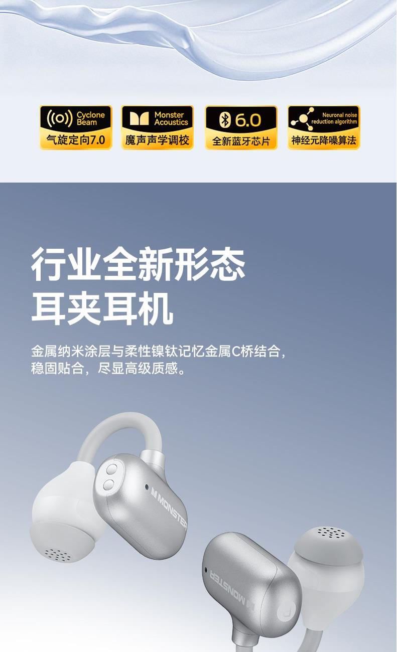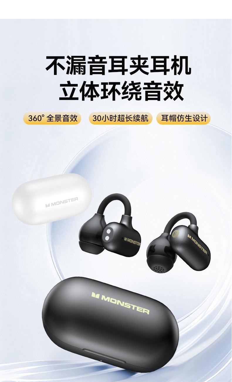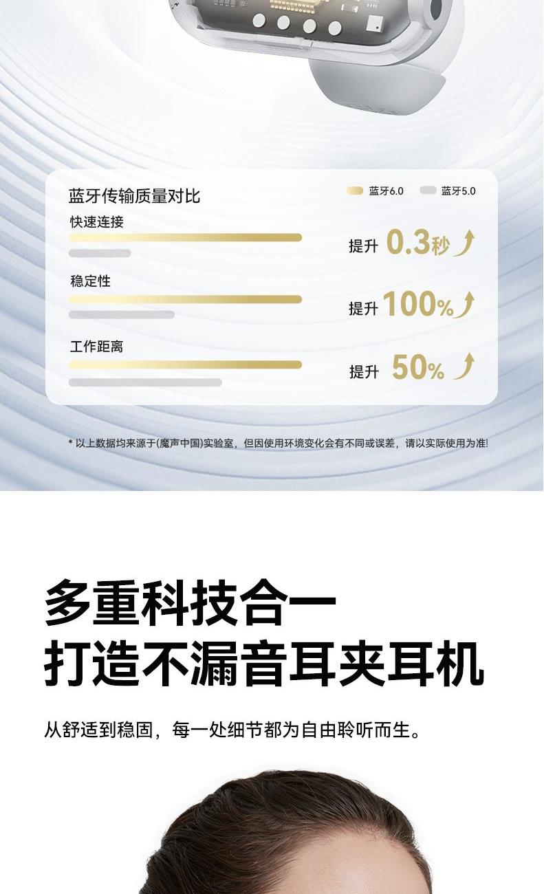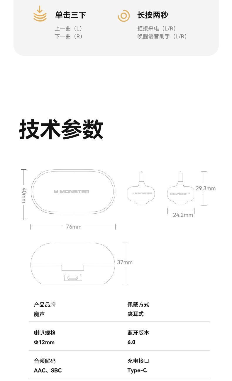 佩戴方式:夹耳式 喇叭规格:Ф12mm 蓝牙版本:6.0 音频解码:AAC、SBC 充电接口:Type-C 续航时间:30h 产品尺寸: L76xW37xH40mm(充电仓) L24.2xH29.3mm(耳机) 卖点: 魔声在46年的耕耘中获得了全球的认可,获全球大奖无数,以及很多音乐、体育和名人的支持。 • 纯正魔声HIFI级无损音质 • 蓝牙6.0技术,更快更稳更省 • 30h超长续航 • 气旋定向传音,耳帽仿生涉及,不漏音保护隐私 • 5.3g柔软舒适,天生轻盈,零感佩戴 • ENC通话降噪,分离人声和环境噪音,有效适应不同通话场景