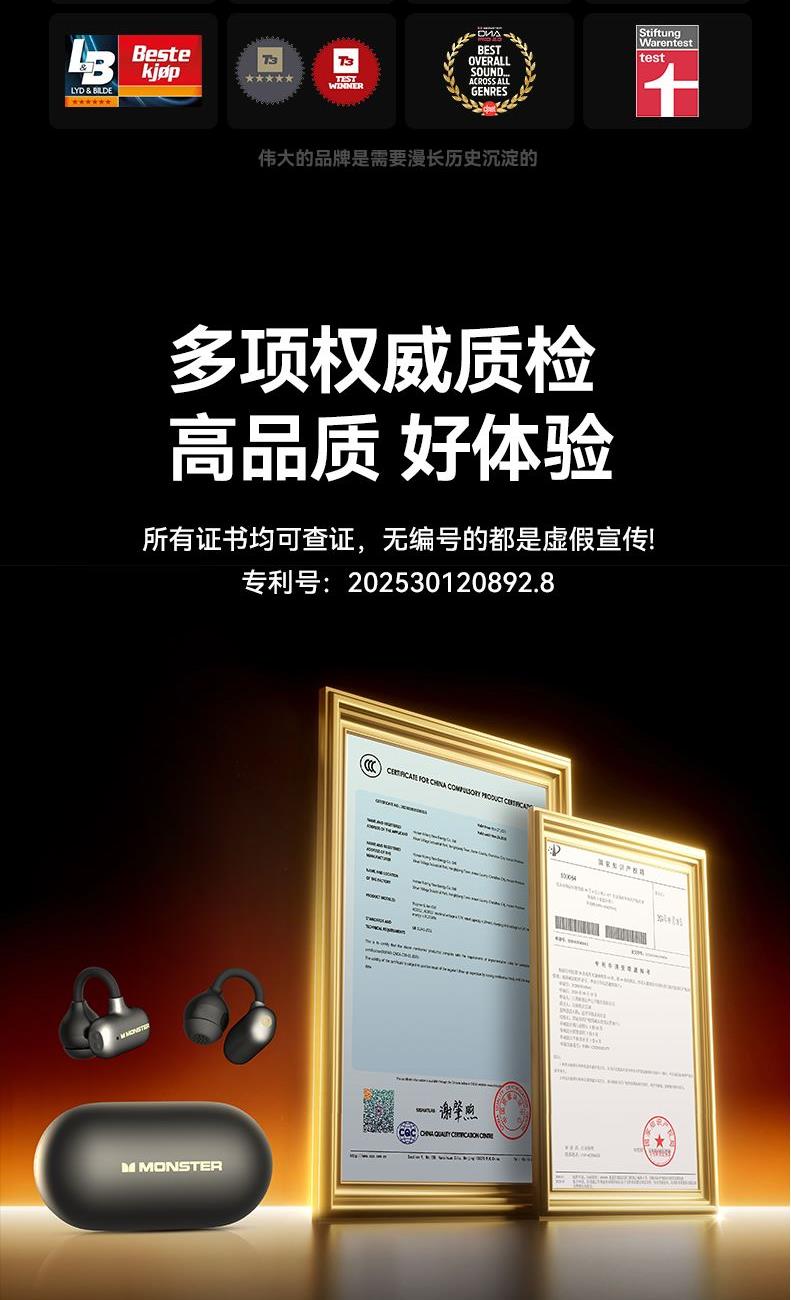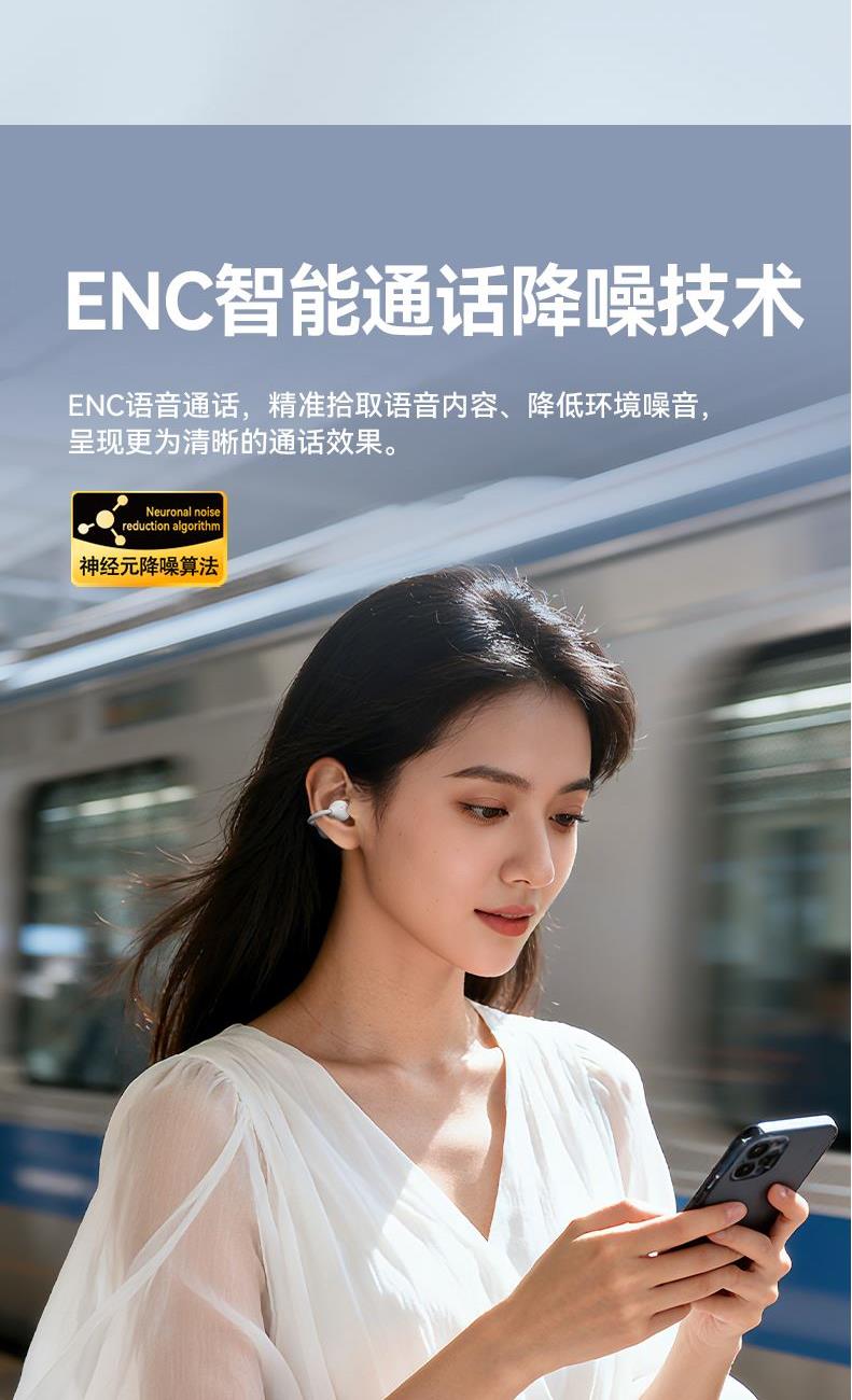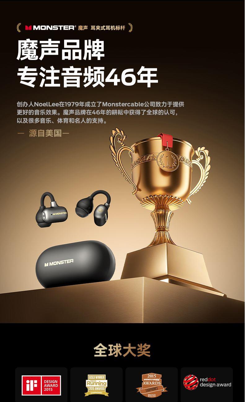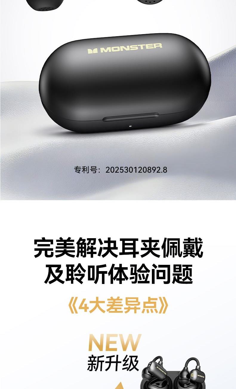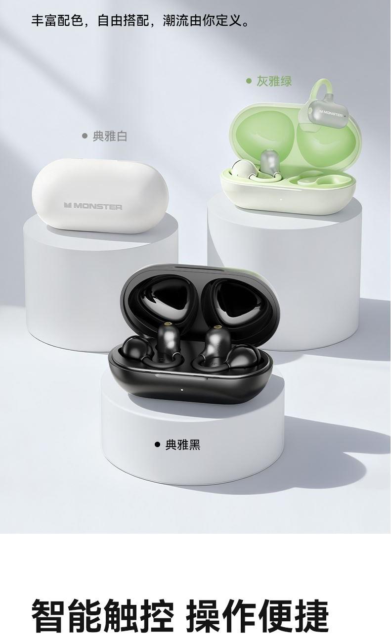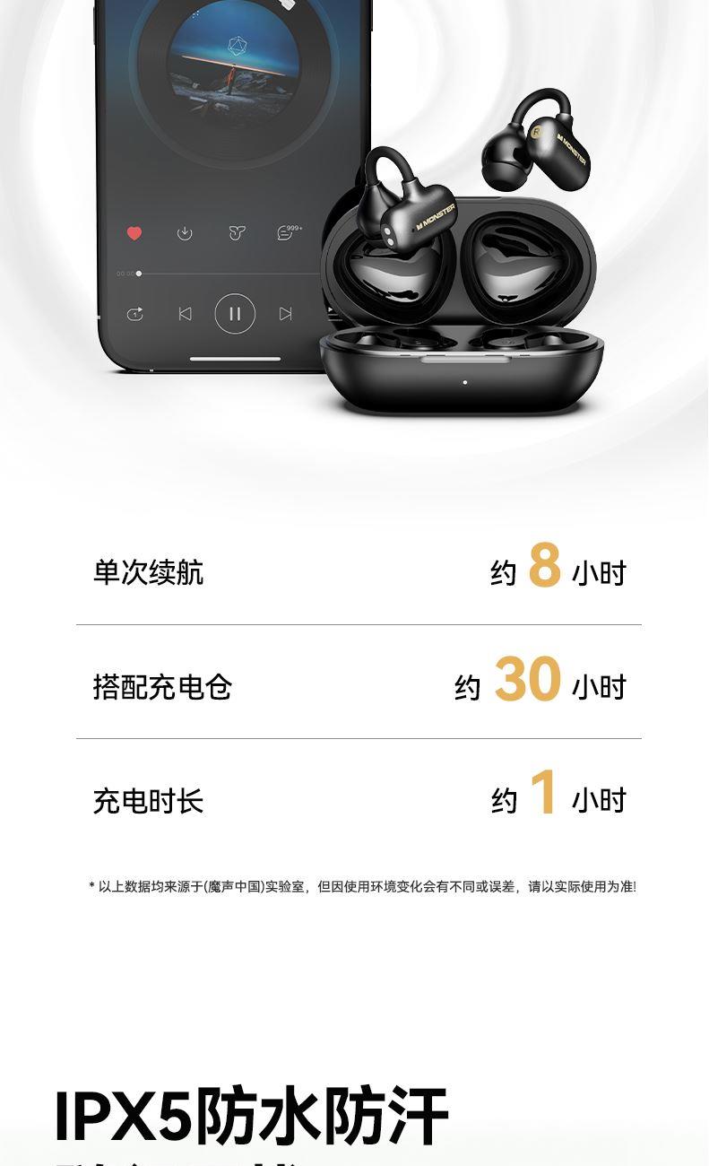 佩戴方式:夹耳式 喇叭规格:Ф12mm 蓝牙版本:6.0 音频解码:AAC、SBC 充电接口:Type-C 续航时间:30h 产品尺寸: L76xW37xH40mm(充电仓) L24.2xH29.3mm(耳机) 卖点: 魔声在46年的耕耘中获得了全球的认可,获全球大奖无数,以及很多音乐、体育和名人的支持。 • 纯正魔声HIFI级无损音质 • 蓝牙6.0技术,更快更稳更省 • 30h超长续航 • 气旋定向传音,耳帽仿生涉及,不漏音保护隐私 • 5.3g柔软舒适,天生轻盈,零感佩戴 • ENC通话降噪,分离人声和环境噪音,有效适应不同通话场景