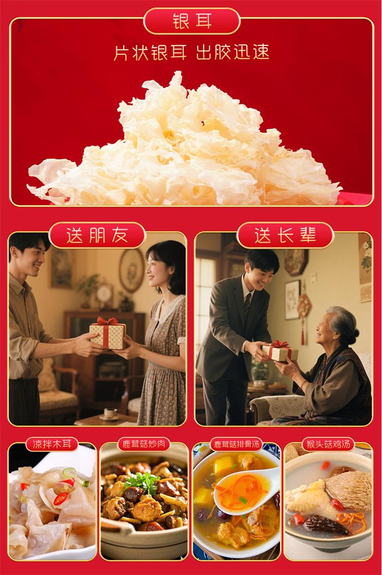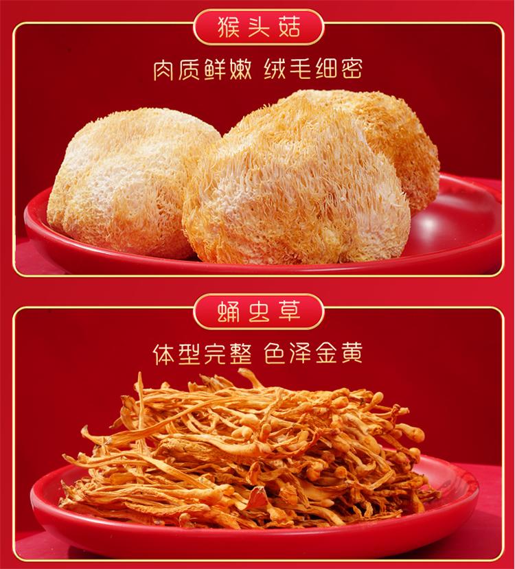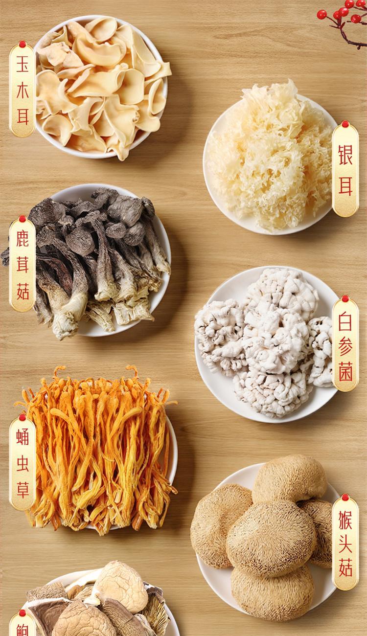 玉木耳75g 鹿茸菇50g 鲍鱼菇40g 白参菌50g 蛹虫草70g 猴头菇50g 银耳(片状)30g