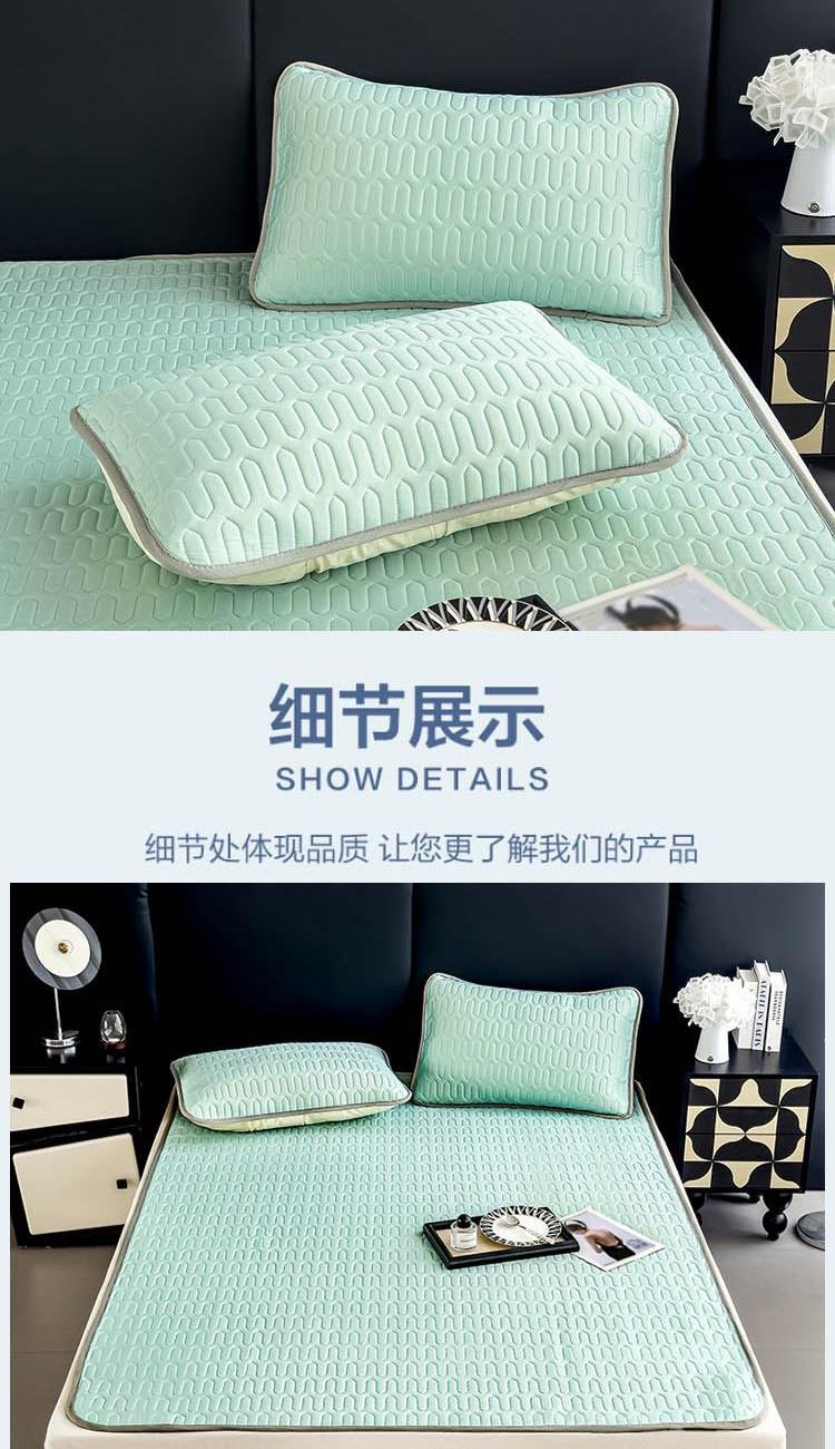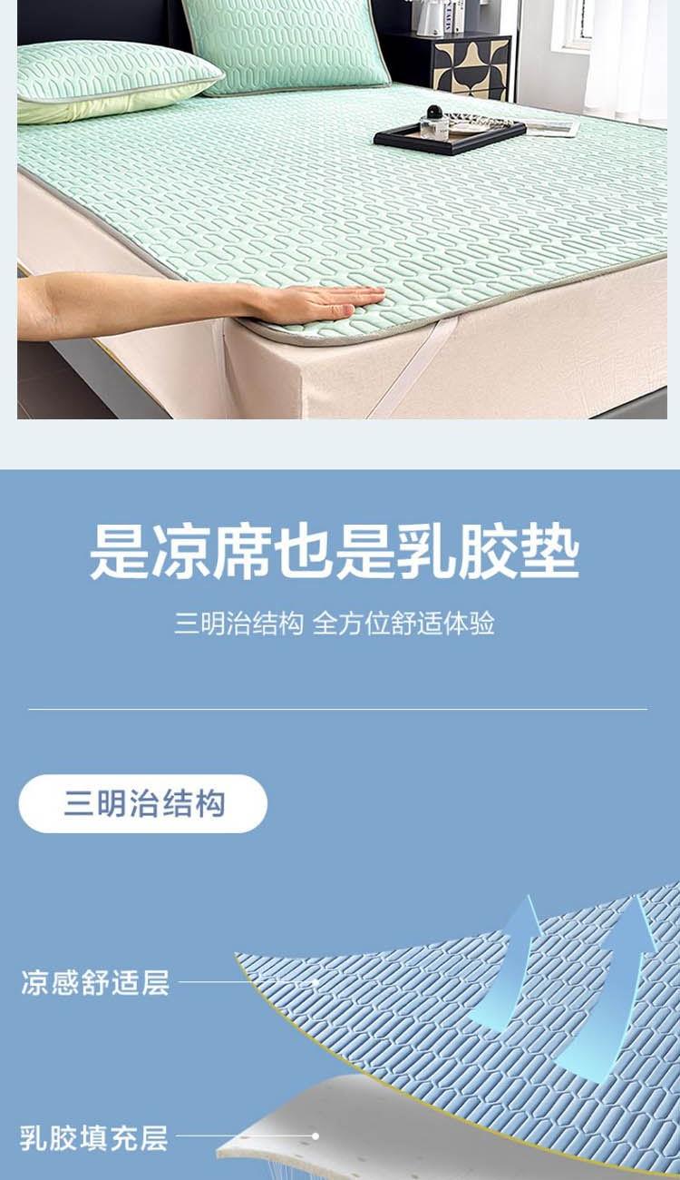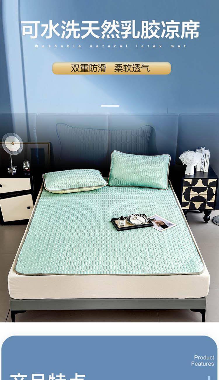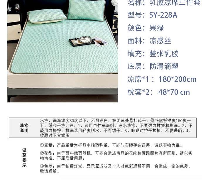 颜色:果绿 面料:凉感丝 填充:整张乳胶 底层:防滑滴塑 凉席*1 :180*200cm 枕套*2: 48*74 cm 包装方式:无纺布袋 包装尺寸: 480*360*120mm 卖点: 1、这是一款纯天然面料,舒适,冰感,防螨,整张乳胶,不会变型! 2、可水洗或轻柔机洗 乳胶保护舒适有支撑,释放90%骨骼压力,翻身无感知。呵护脊椎,促进睡眠舒适。