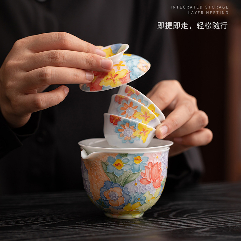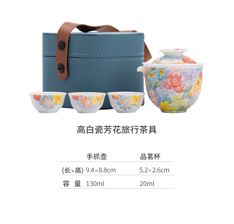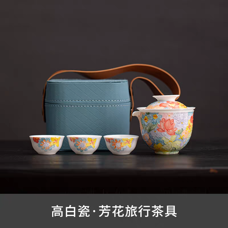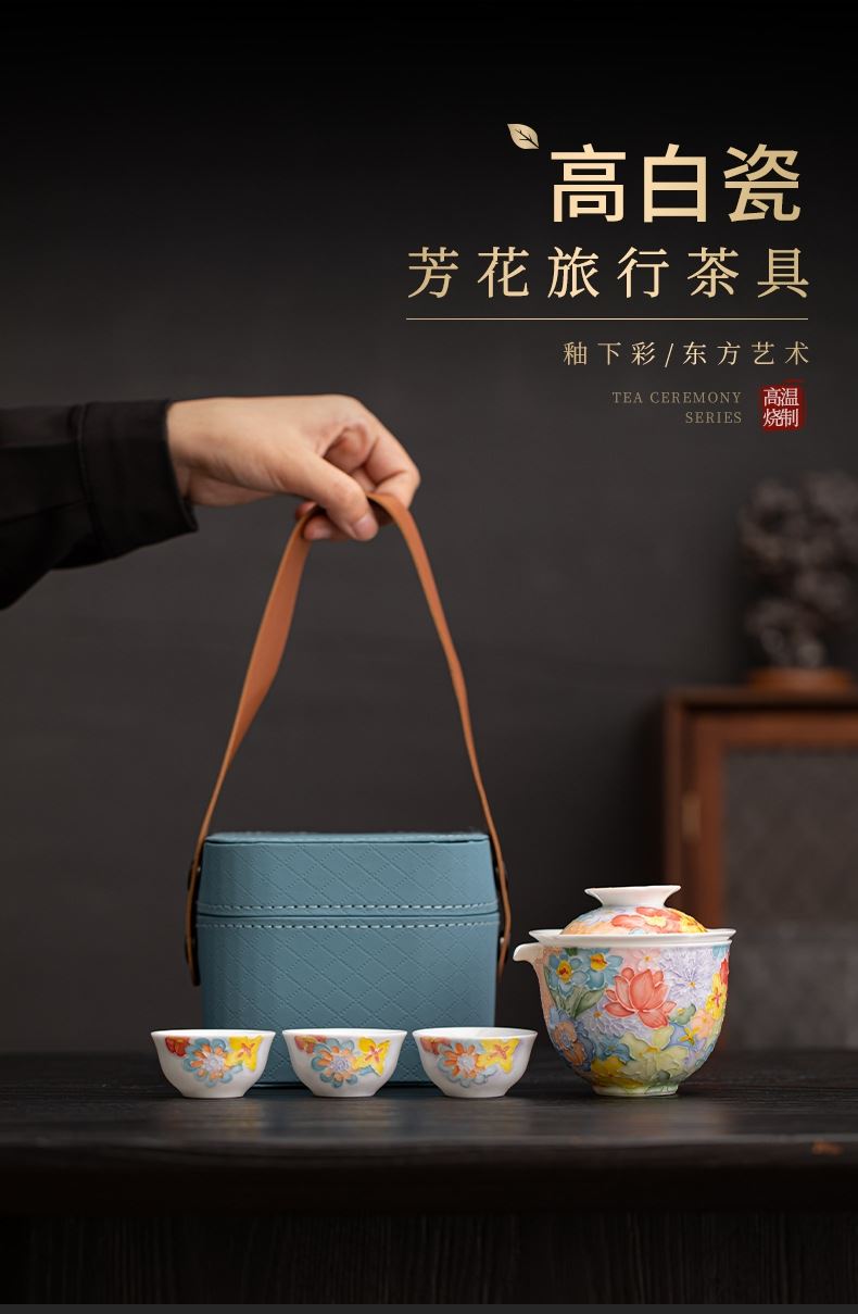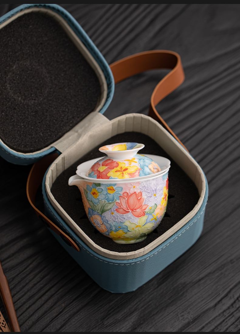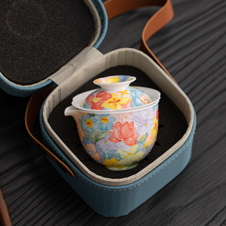 尾桥下窑手绘万花满彩釉下旅行茶具套装便携商务会议伴手礼赠品