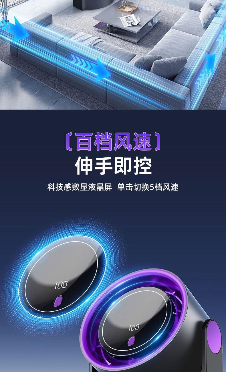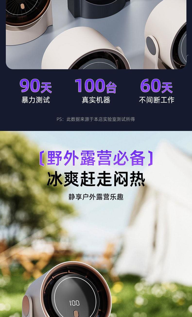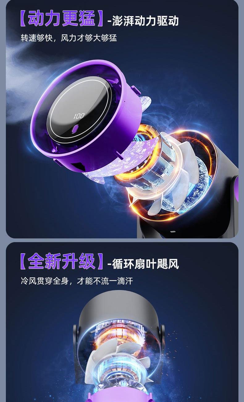 产品颜色:灰紫色/米白色 电机类型:无刷电机 额定电压:5V 2A 外壳工艺:ABS 噪音:36dB(A)以下 是否内置电池:内置电池 内置电池容量:1200mAh 包装体积:16*9.8*18.5cm 产品净重:0.35kg 续航时间:1-3h(含) 电源方式:USB 有无数显:有 操作方式:普通按钮 1、全新升级100档调速,科技感数显和按键交互,单击切换,5档风速,模式满足日常使用 2、冰感引擎+蝶翼四叶扇 热风进冷风出 3、多角度送风,上下可手动调,支持俯仰角360°调节