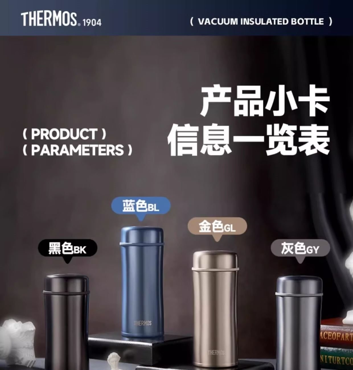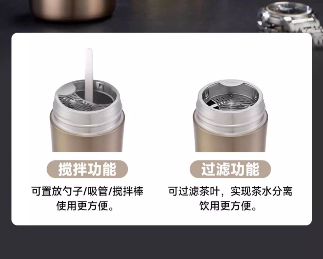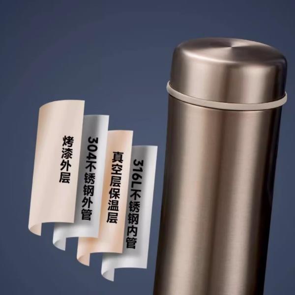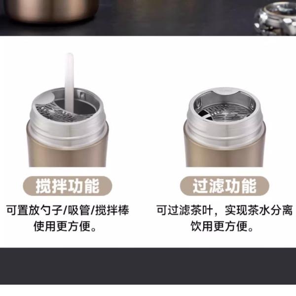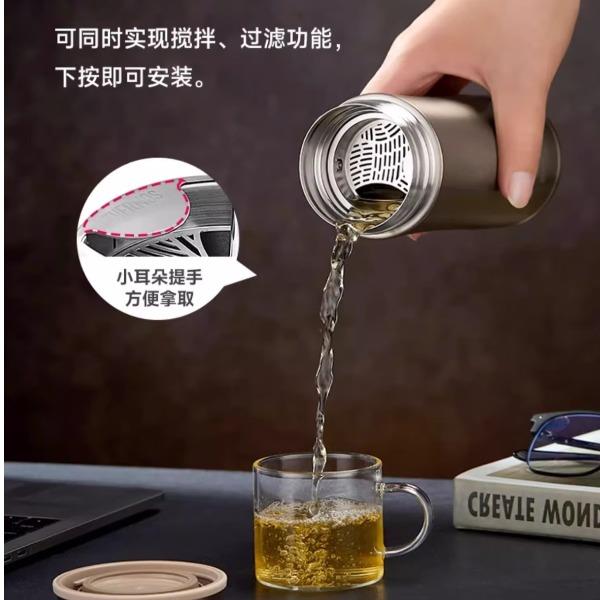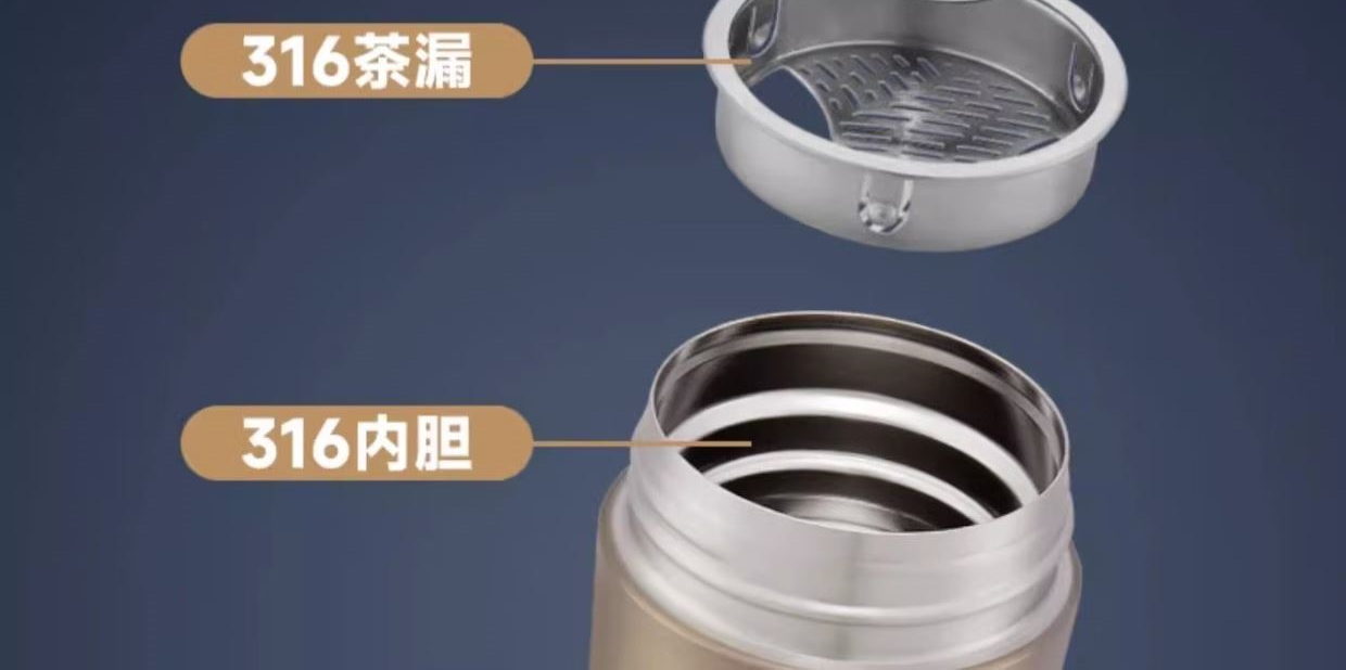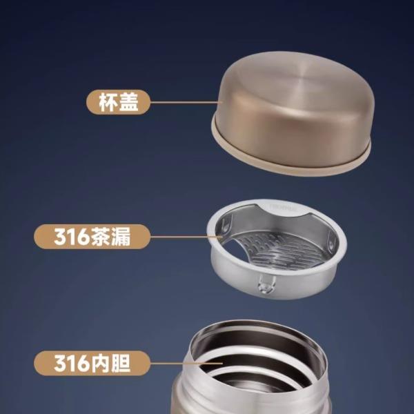 颜 色:金色GL/蓝色BL/黑灰色GY/纯黑BK 容 量:400ml 保温效力:61°C以上(6小时) 保冷效力:12°C以下(6小时) 外管材质:304不锈钢 内管材质:316L不锈钢 茶隔材质:316L不锈钢 密封圈:硅橡胶