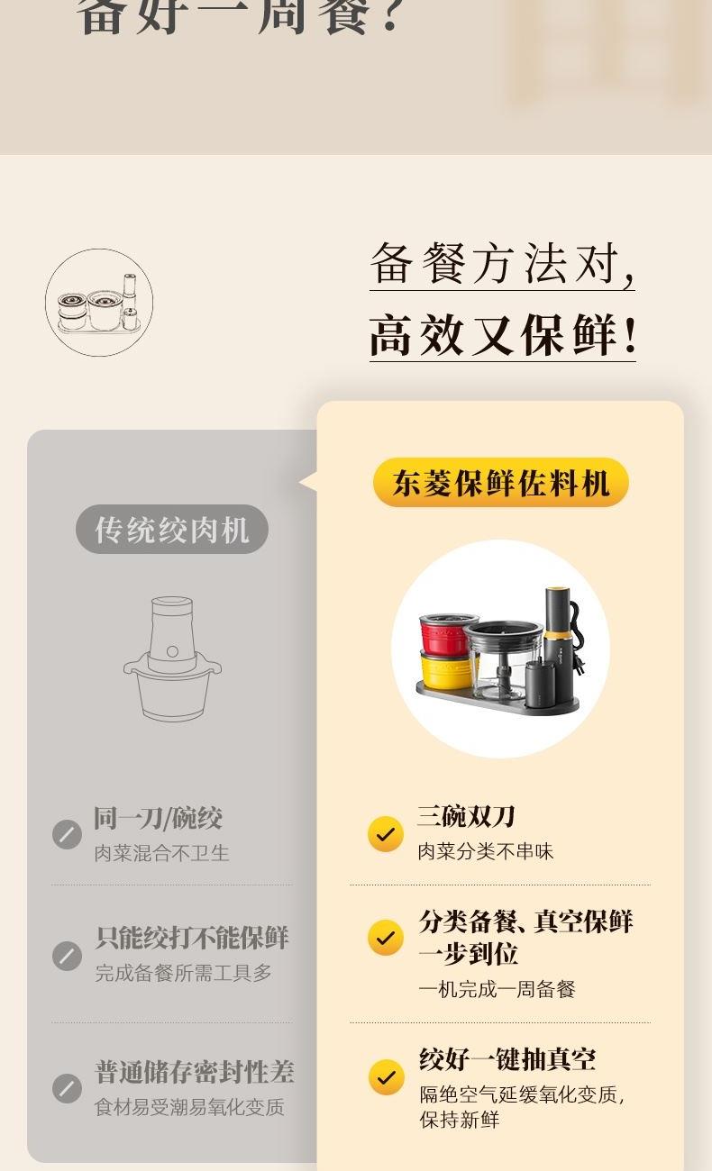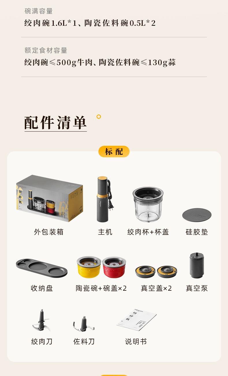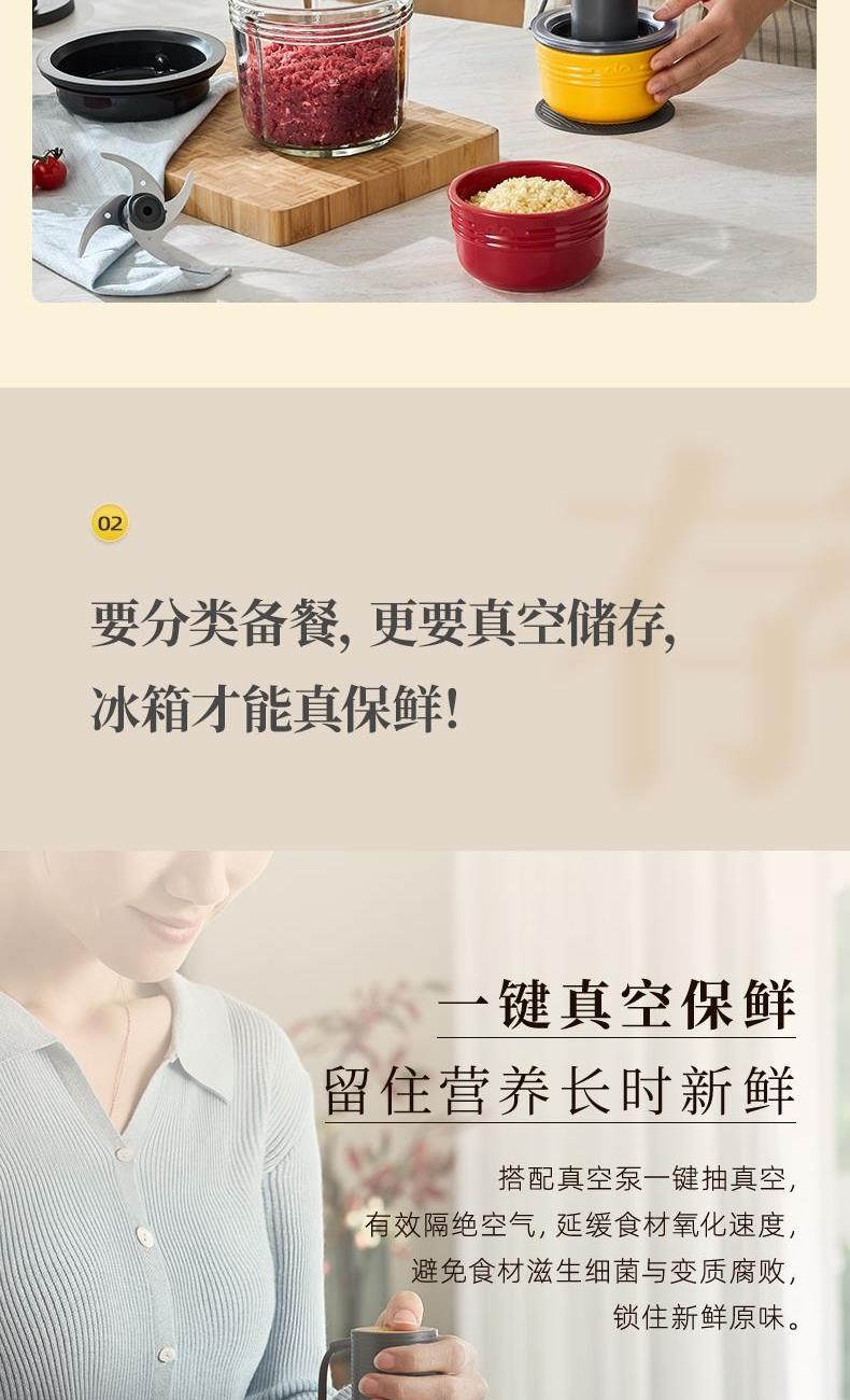 容 量 : 1.6L+0.5L+10个真空袋 功 率 : 400W 毛 重 : 4.08kg 真 空 吸 力: 50-60KPa 产 品 尺 寸: 384*160*230mm 包 装 尺 寸: 448*204*218mm 1.三碗双刀分类备料保鲜一步到位 2.一键抽真空精 确保鲜,计时存储更清晰 3.一机满足全家肉馅、辅食、真空保鲜 4.特设收纳座,配件摆放不凌乱