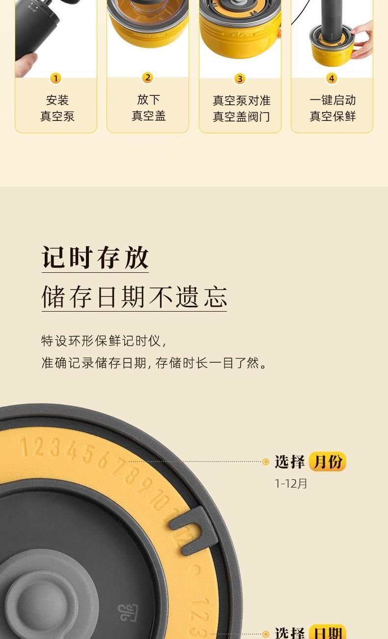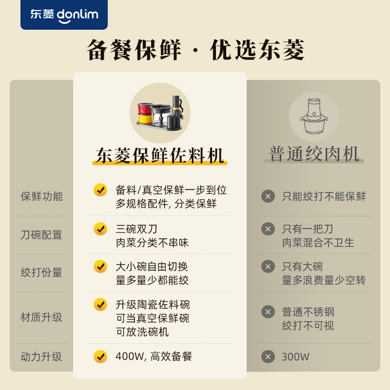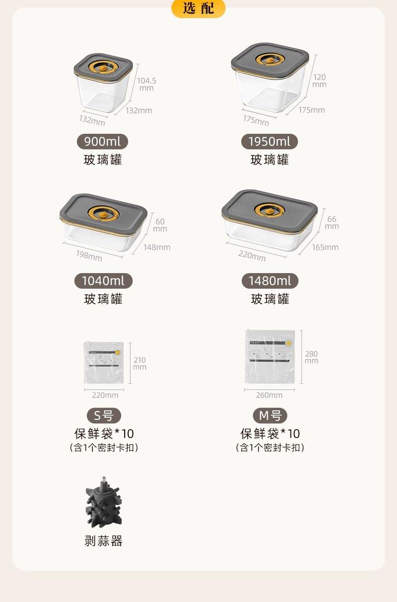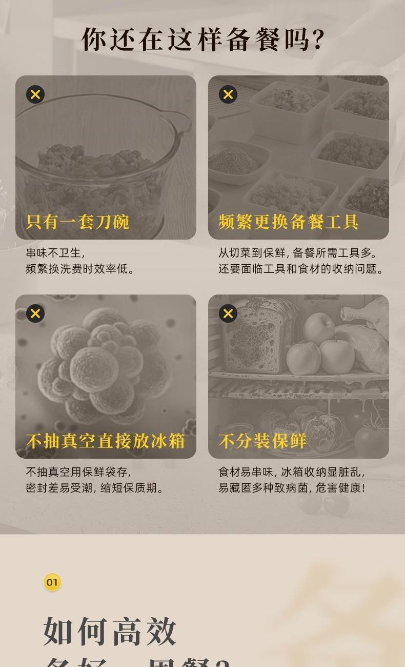 容 量 : 1.6L+0.5L+10个真空袋 功 率 : 400W 毛 重 : 4.08kg 真 空 吸 力: 50-60KPa 产 品 尺 寸: 384*160*230mm 包 装 尺 寸: 448*204*218mm 1.三碗双刀分类备料保鲜一步到位 2.一键抽真空精 确保鲜,计时存储更清晰 3.一机满足全家肉馅、辅食、真空保鲜 4.特设收纳座,配件摆放不凌乱