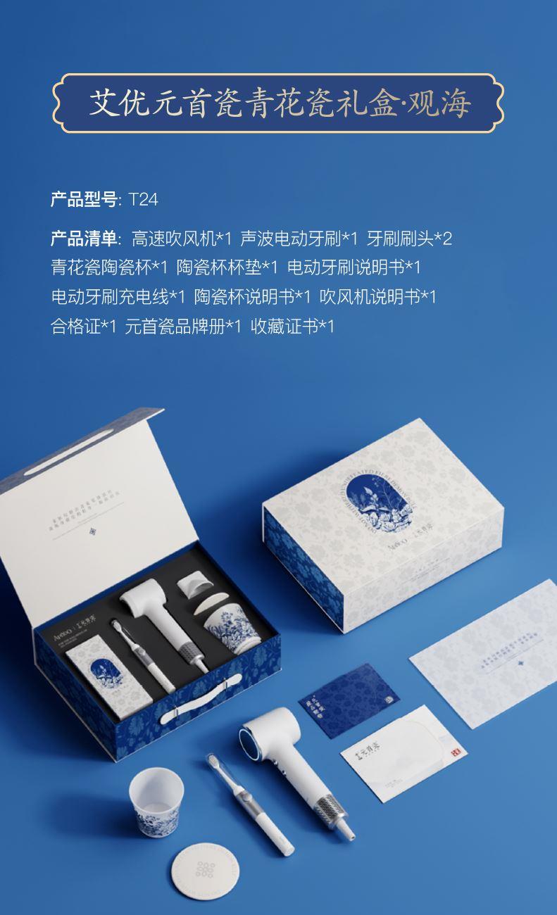 产品型号:T24 配置:高速吹风机*1 声波电动牙刷*1 牙刷刷头*2青花瓷陶瓷杯*1 陶瓷杯杯垫*1 电动牙刷说明书*1电动牙刷充电线*1 陶瓷杯说明书*1 吹风机说明书*1合格证*1 元首瓷册*1 收藏证书*1