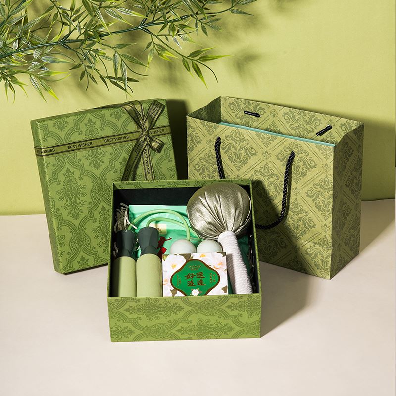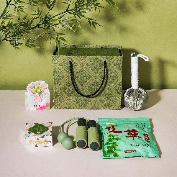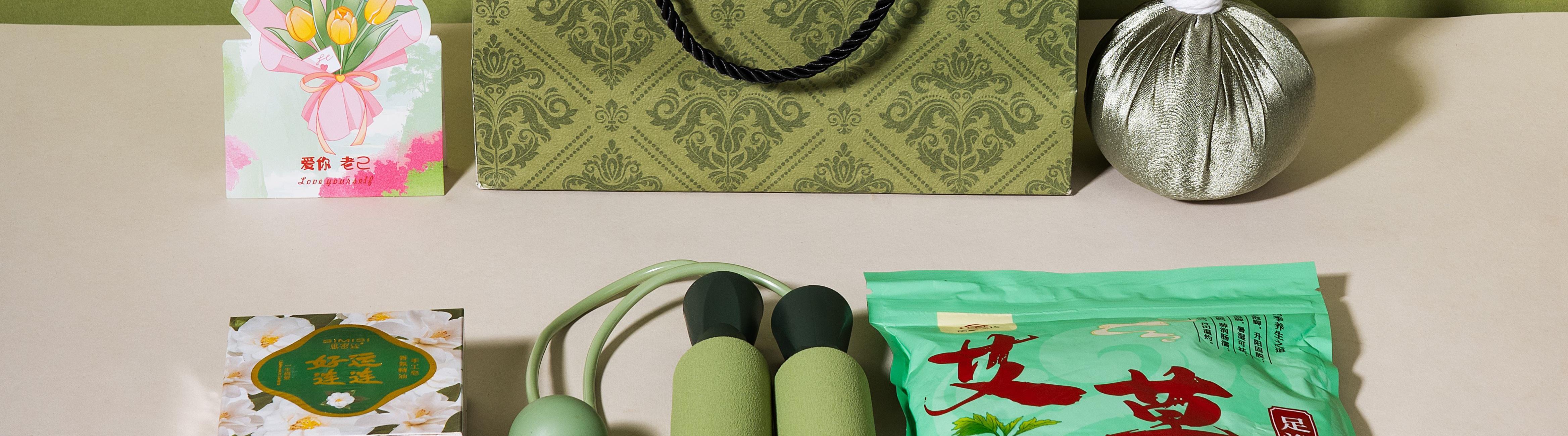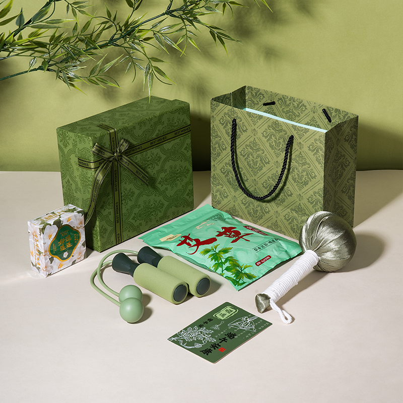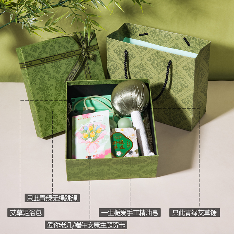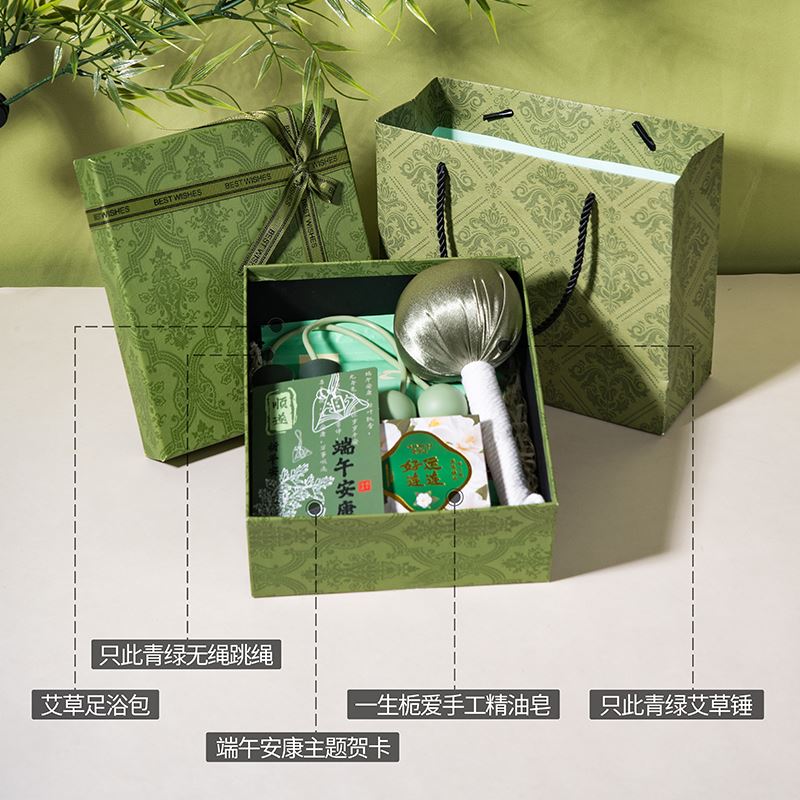 1、精品绿色国潮风礼盒,搭配同风格手提袋,大气有质感,适合商务、福利、礼赠渠道。 2、全民健身季,养生减脂两不误,祛湿、舒缓、运动、护理一套配齐。 3、只此青绿艾草锤搭配无绳跳绳,一动一养,轻松燃脂、舒缓身心。 4、一生栀爱手工精油皂 + 艾草足浴包,从头到脚细致呵护,健康又精致。 5、可根据客户需求选配爱你老几/端午安康主题贺卡,满满的仪式感和情绪价值。