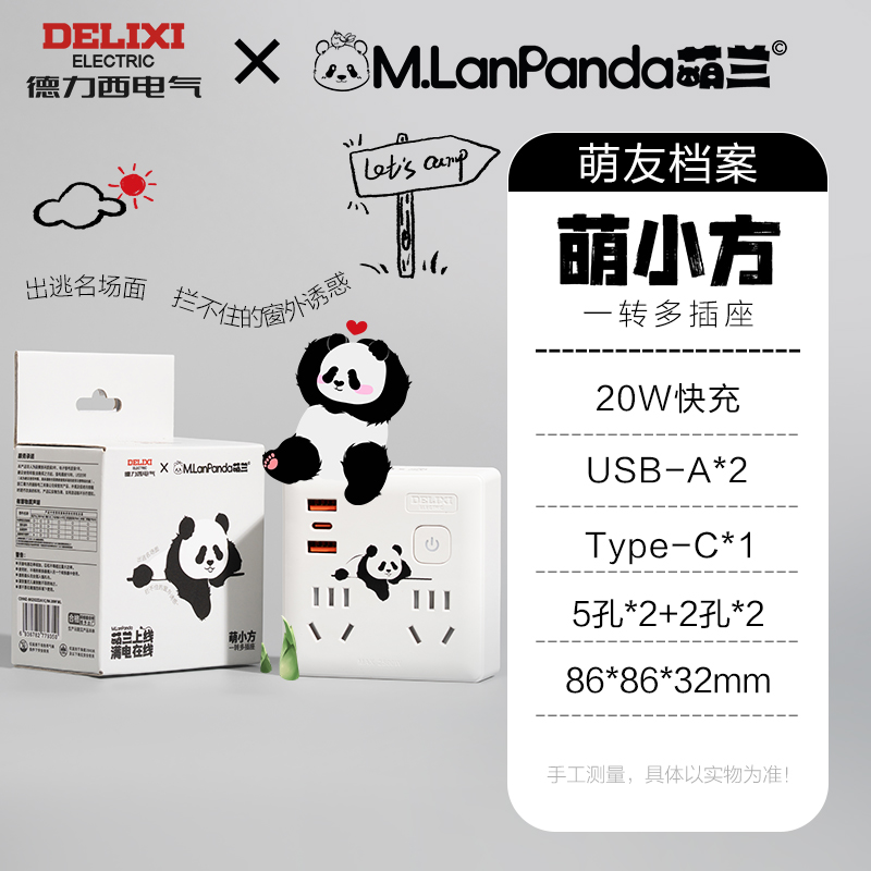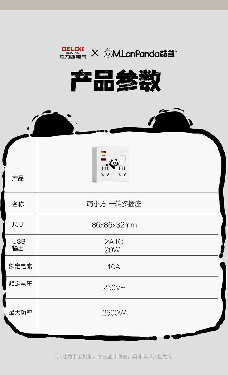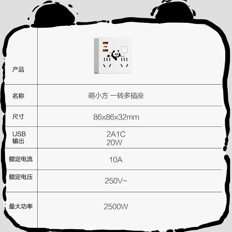 产品型号:CD98Z-BK2X2Z2A1C/86 20W 产品尺寸:86*86*32mm 包装尺寸:150*120*60mm 产品毛重:0.12kg USB-C口快充协议:PD 额定电流:10A 额定电压:250V 产品材质:PP 产品位数:总控、两位五孔、两位两孔、2USB、1type-c、无线 总控2位5孔+2位2孔+2A1C、10A 250V~,纸盒包装,萌小方,白色