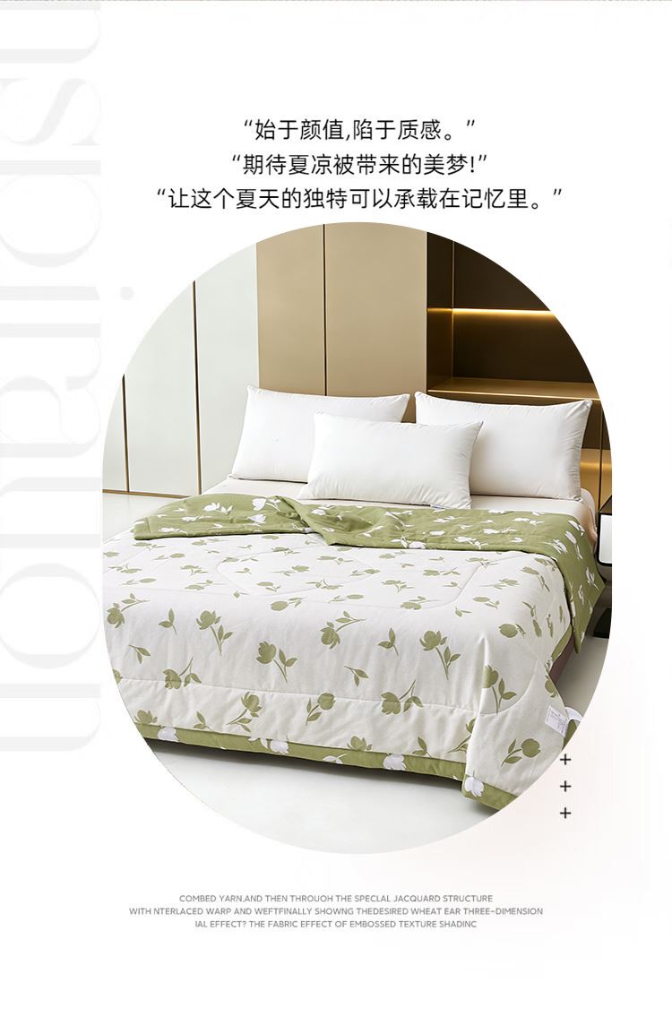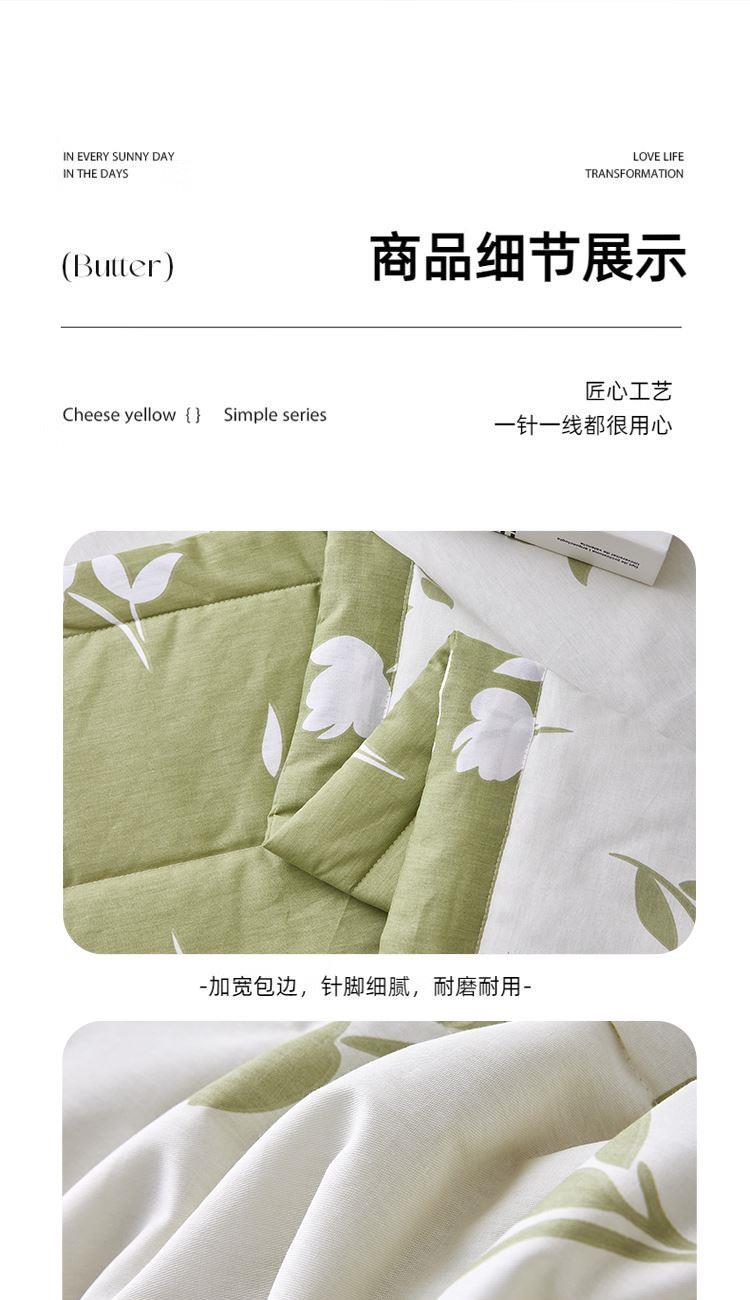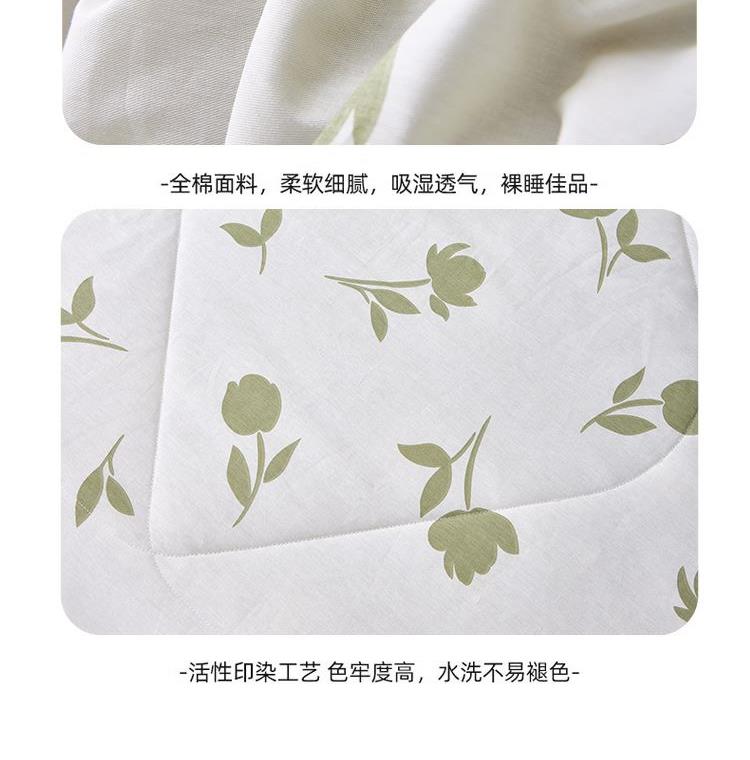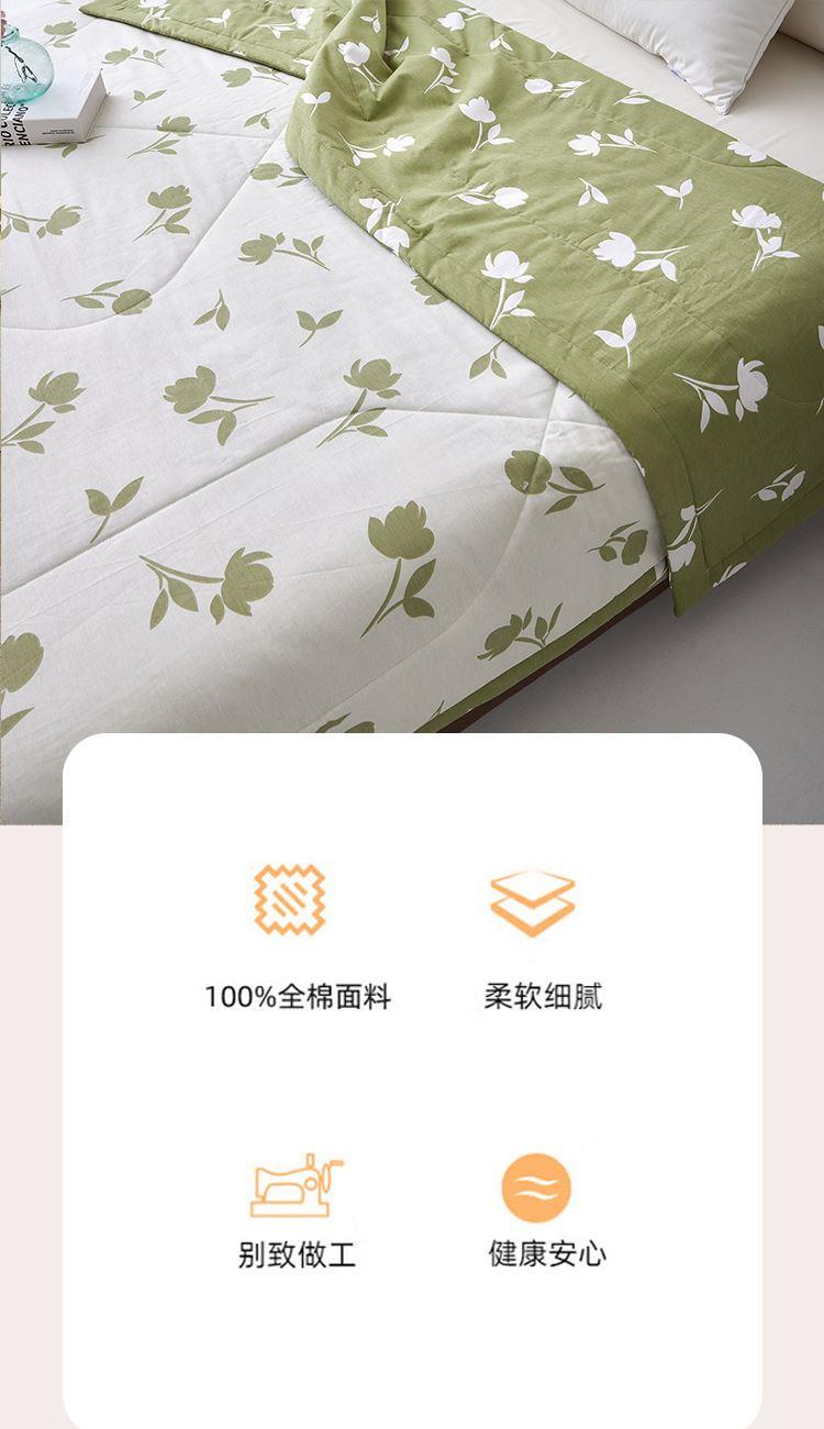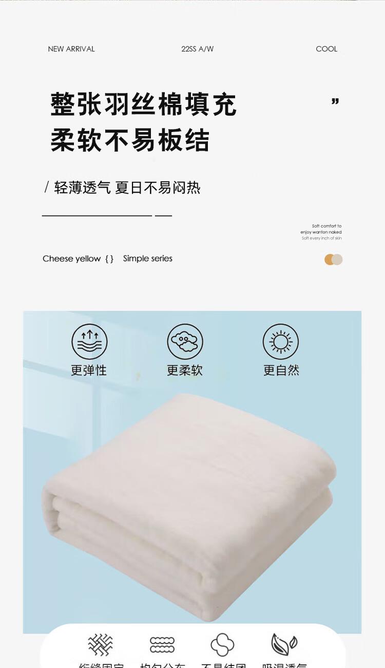 规格:150*200cm 面料:全棉 填充:羽丝棉 重量:1100g 执行标准:GB/T22796-2021 安全类别:GB18401-2010 B类 1.纯棉材质:采用优质棉花,柔软亲肤,透气性好,适合敏感肌肤,提供舒适的睡眠体验。 2.高透气性:棉纤维结构疏松,空气流通顺畅,避免闷热。
