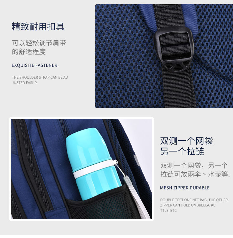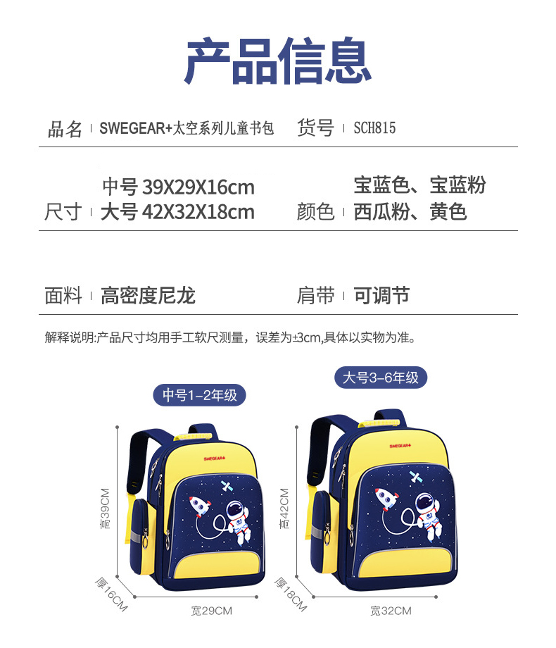 货号:SCH815 规格:39*29*16(中号)/42*32*18CM(大号) 颜色: 粉色/蓝色/黄色/蓝粉 ★主面料:防泼水尼龙,里料涤纶 ★双向防滑拉片,方便拿取、放置物品 ★S型厚实的肩带设计,珍珠棉填充,减震透气 ★内部丰富的隔层,便于清晰放置各类日常物品 ★轻量化面料,多色可选;多口袋设计 ★肩带安全警示条;平衡胸扣