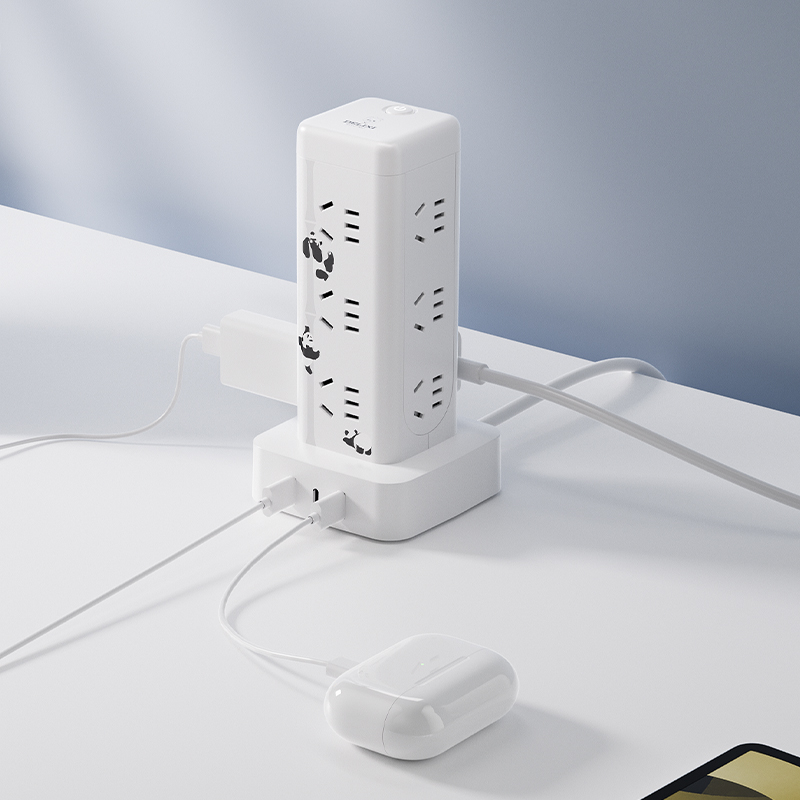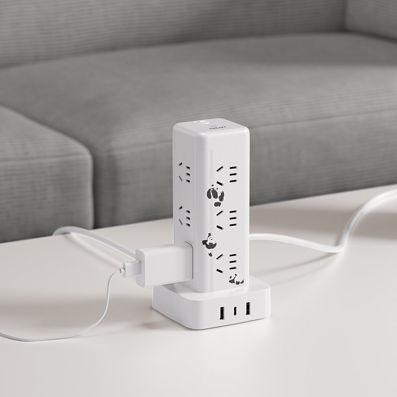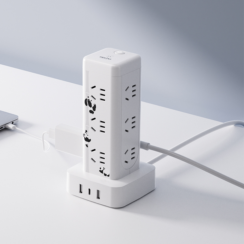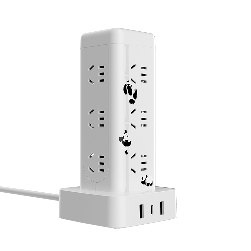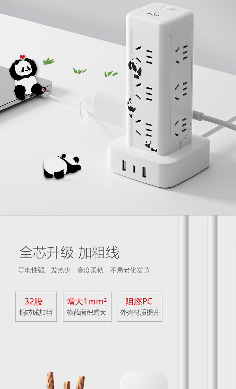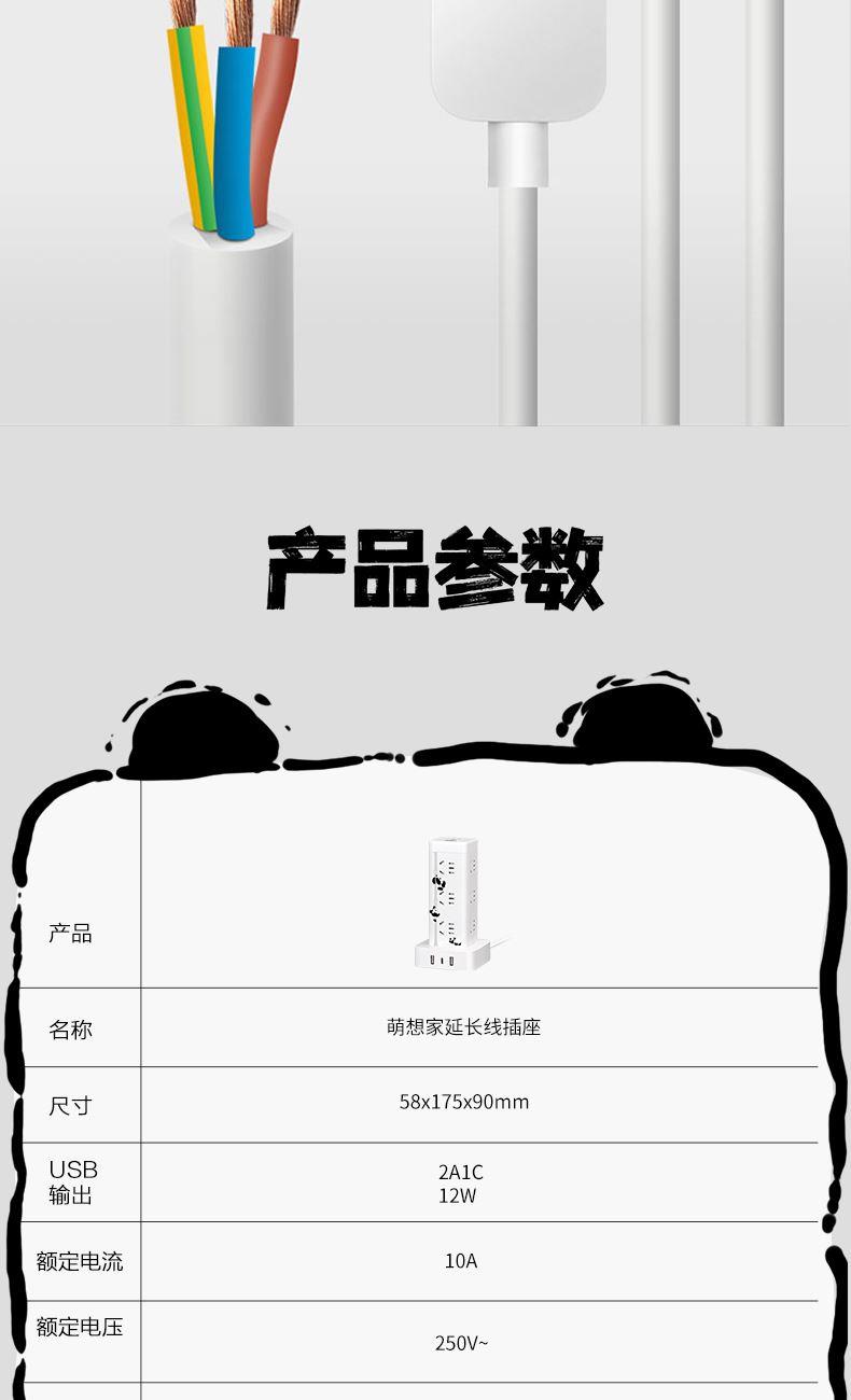 产品型号:CD98H-DK12X2A1CG ML 产品尺寸:90*58*175mm 包装尺寸:135*95*185mm 产品全长:1.7m 产品材料 :PC材料 额定电流:10A 额定电压:250V 产品重量:0.58kg 产品位数:12位五孔、2USB、1type-c、有线 2A1C插口 USB输出:5V-3.1A 十二位五孔总控开关+2A1C带过载,萌想家,桌面立式延长线插座 1.7M