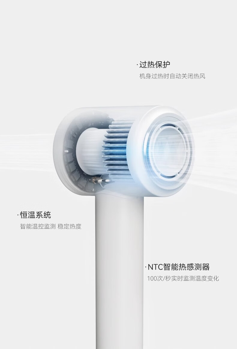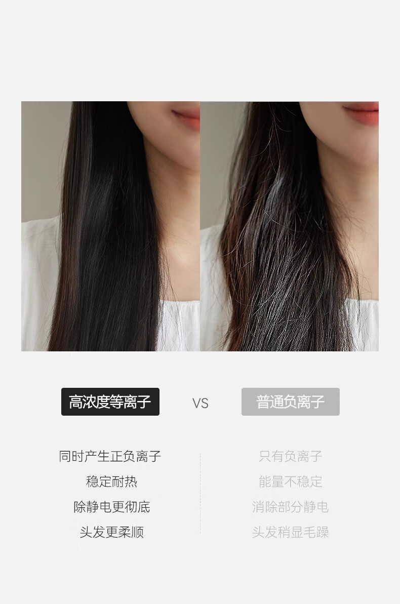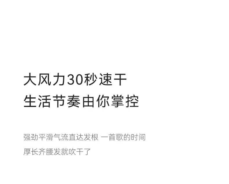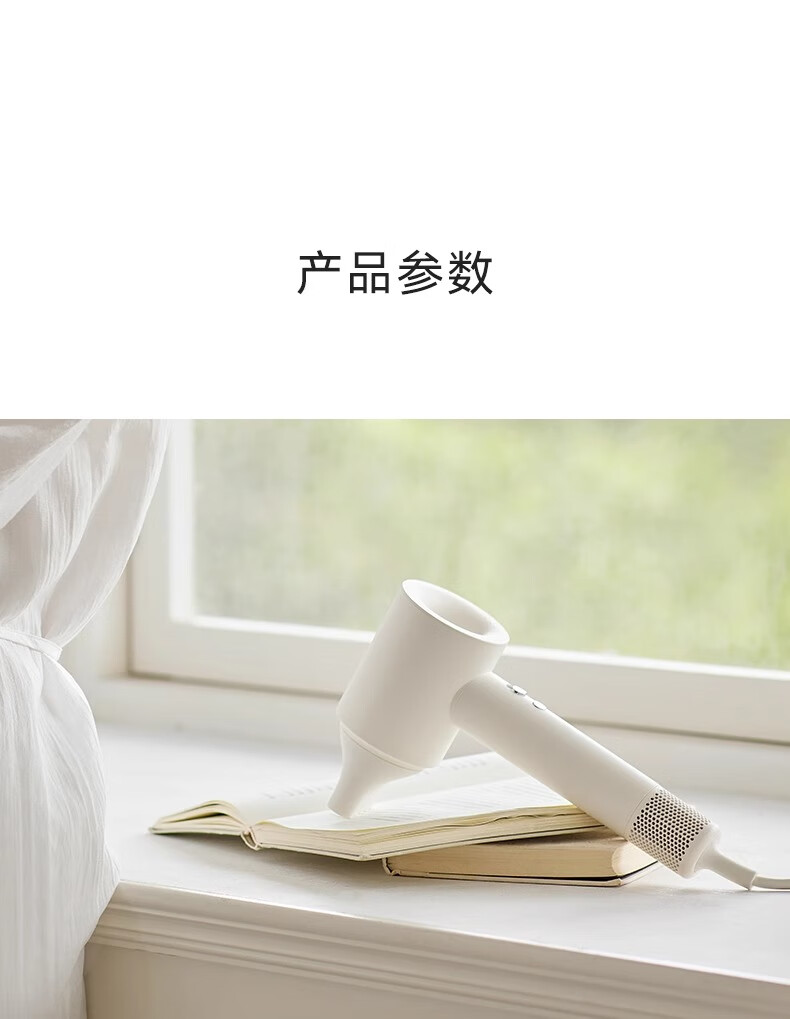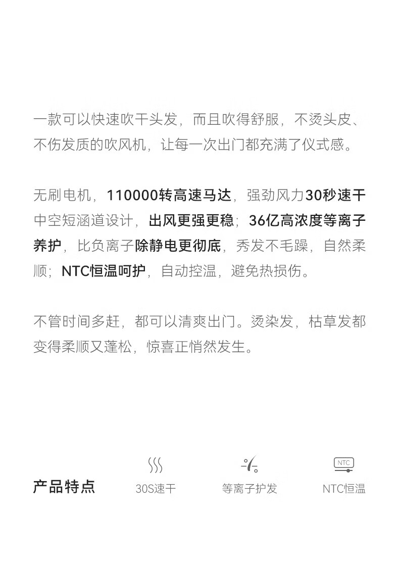 颜色:陶白 重量:0.4kg 额定功率:1300W 产品尺寸:245x73x96mm 包装尺寸:360*150*89mm 条码 : 6977735713199 1. 无刷电机,110000转高速马达,强劲风力30秒速干; 2. 中空短涵道设计,出风更强更稳; 3. 36亿高浓度等离子养护,比负离子除静电更有效,秀发不毛躁,自然柔顺; 4. NTC恒温呵护,自动控温,避免热损伤。