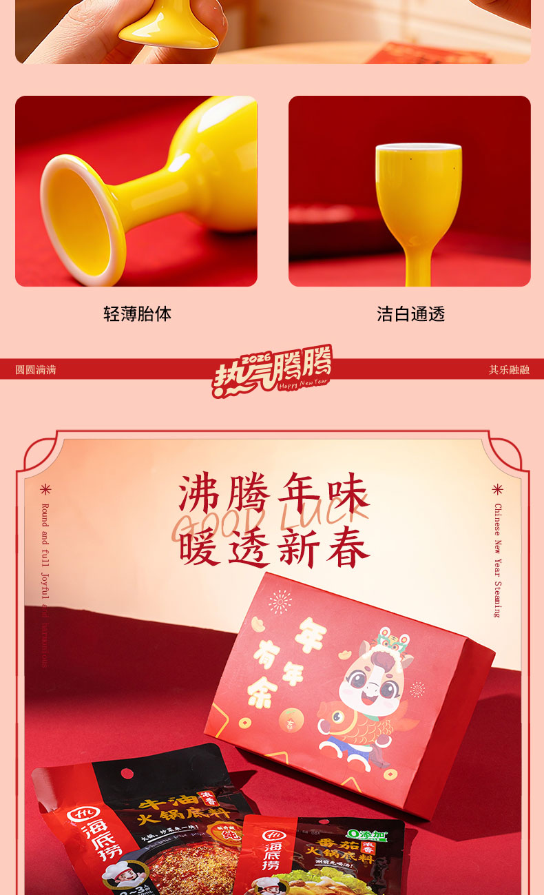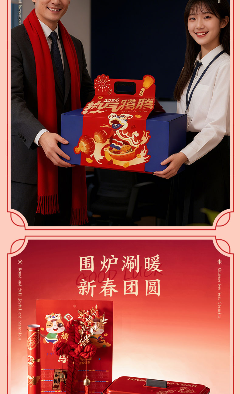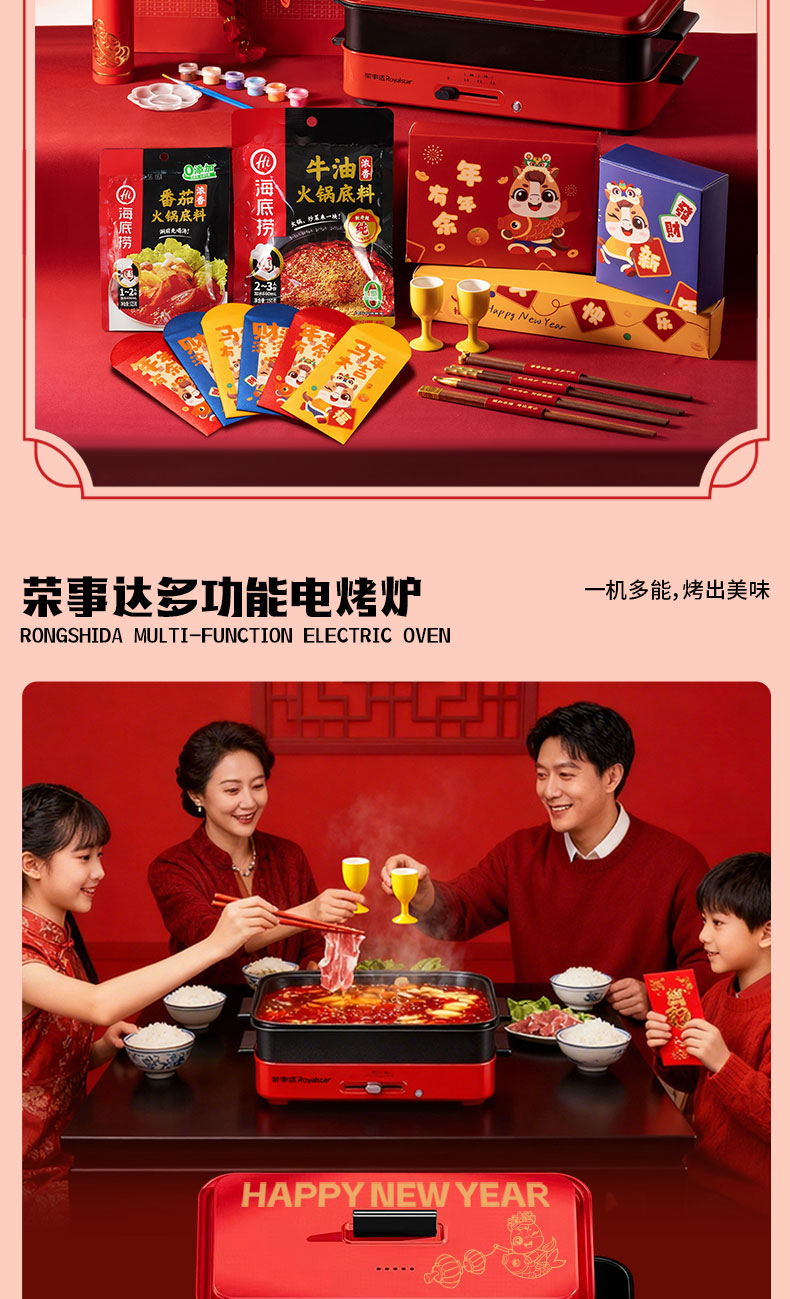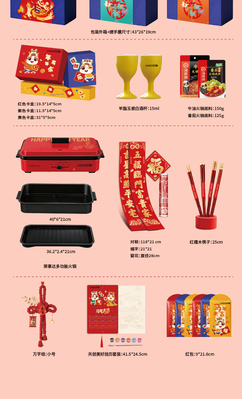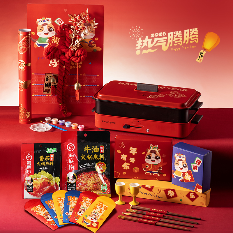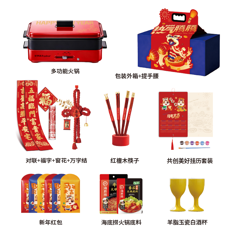 1.外箱:43*19*28.5cm 2.多功能双层电火炉 3.对联、福字、窗花*2 4.共绘美好 挂历 5.DIY颜料*1 6.底捞火锅底料*2种口味(番茄125G、牛油底料150G 7.羊脂玉瓷白酒杯*2 8.红檀木筷子*4双 9.财源滚滚 红包*6