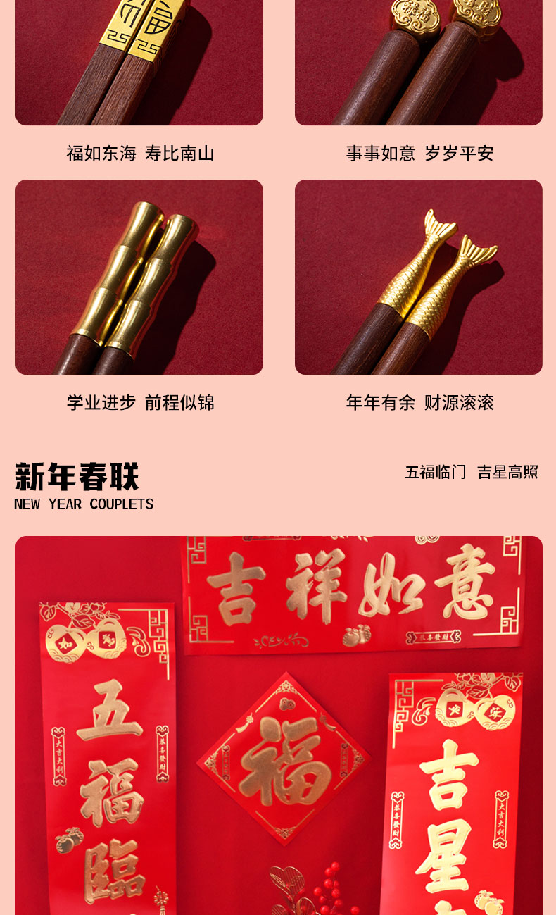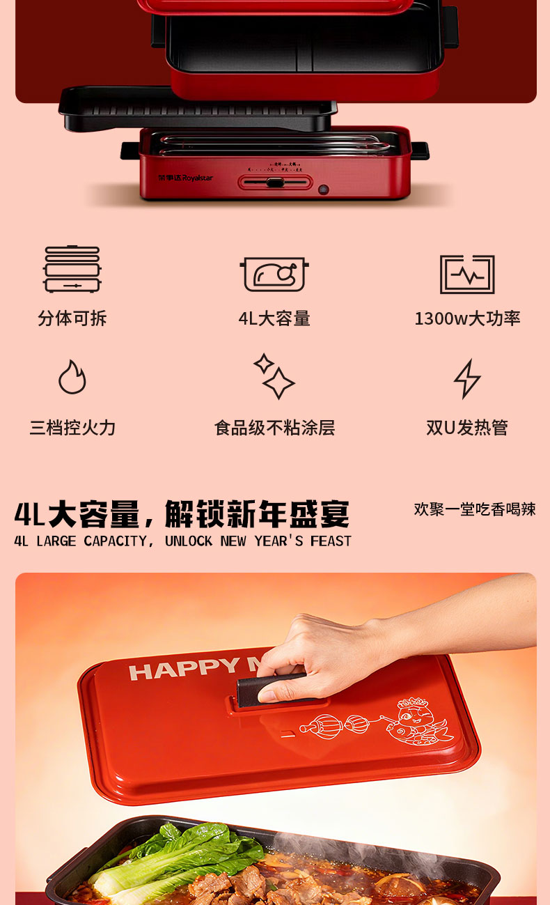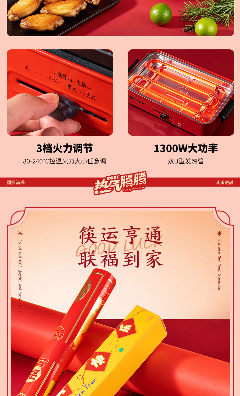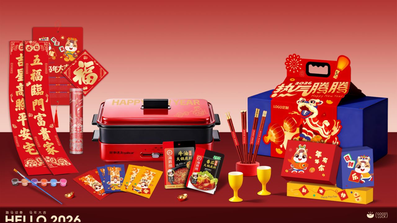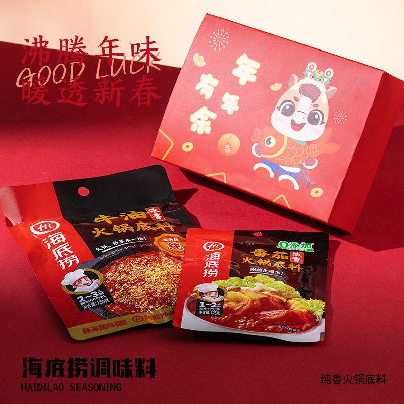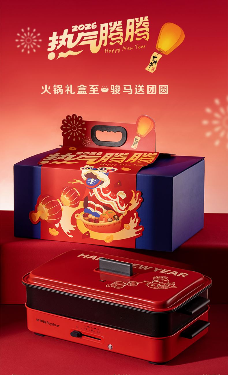 1.外箱:43*19*28.5cm 2.多功能双层电火炉 3.对联、福字、窗花*2 4.共绘美好 挂历 5.DIY颜料*1 6.底捞火锅底料*2种口味(番茄125G、牛油底料150G 7.羊脂玉瓷白酒杯*2 8.红檀木筷子*4双 9.财源滚滚 红包*6