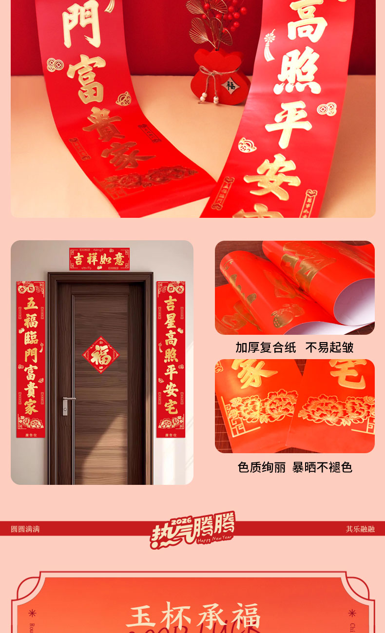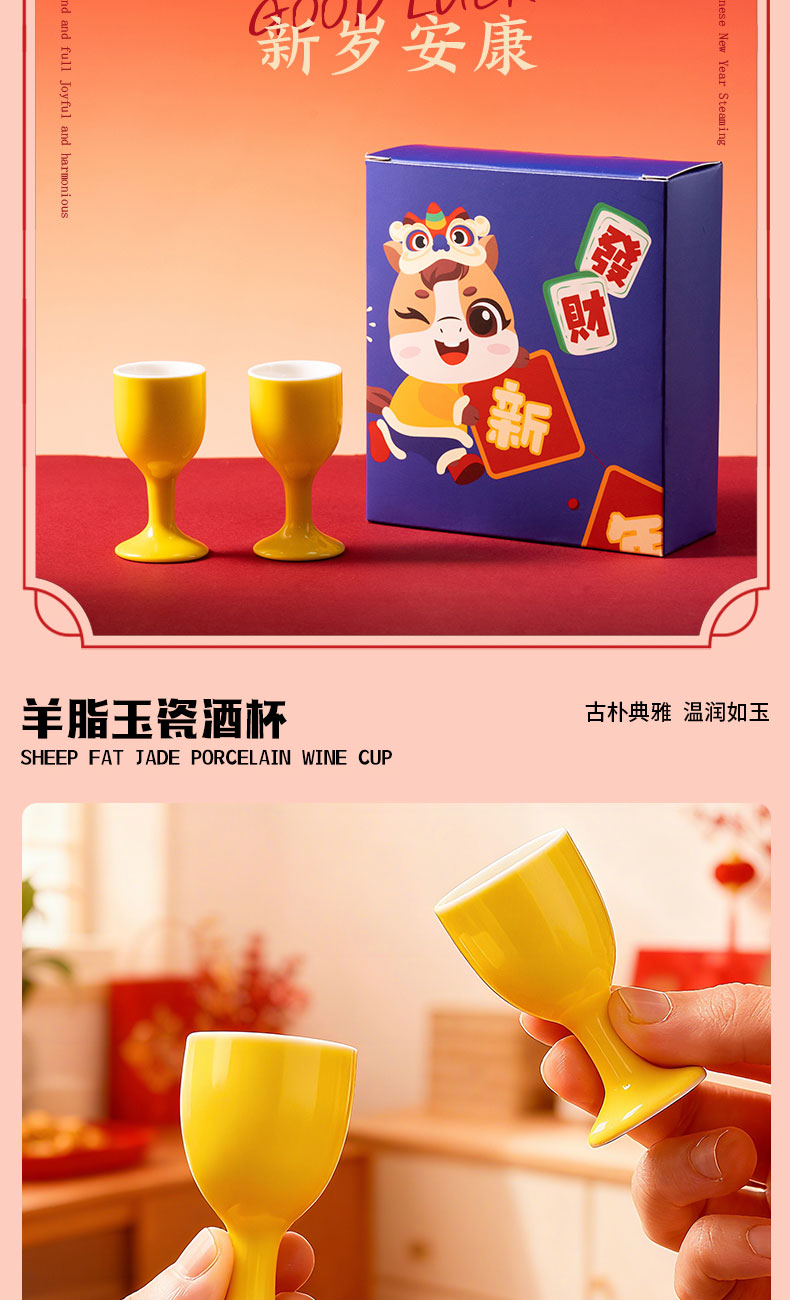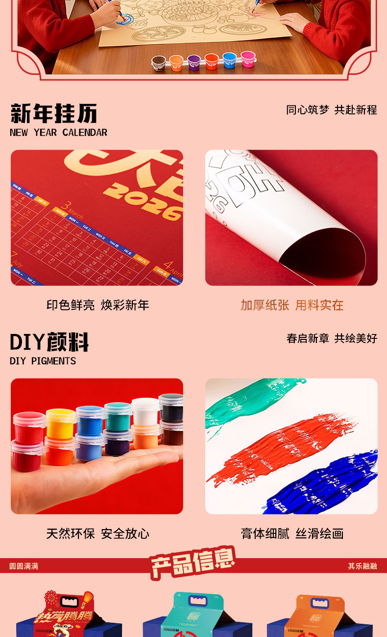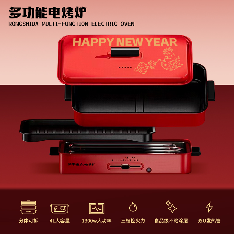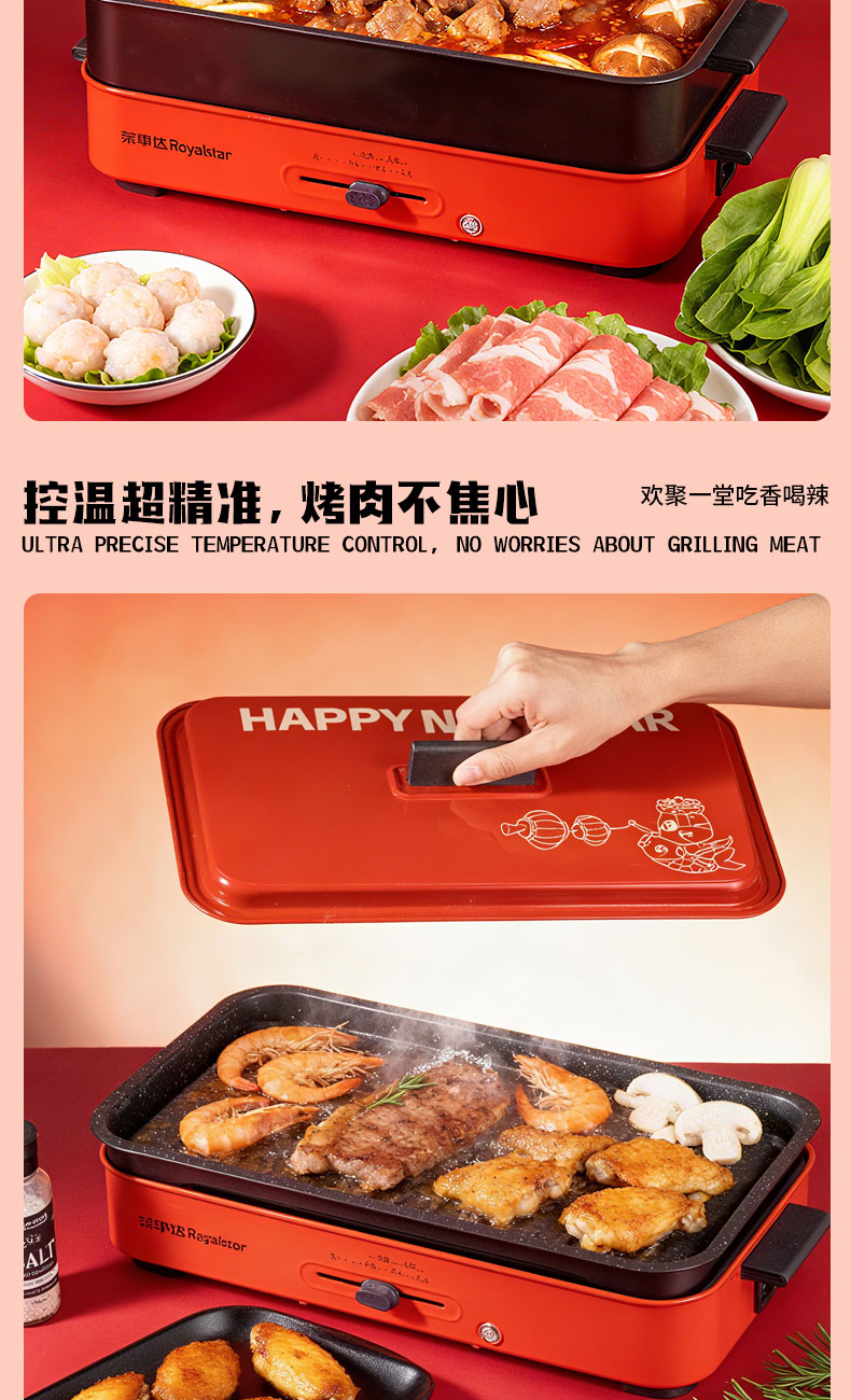 1.外箱:43*19*28.5cm 2.多功能双层电火炉 3.对联、福字、窗花*2 4.共绘美好 挂历 5.DIY颜料*1 6.底捞火锅底料*2种口味(番茄125G、牛油底料150G 7.羊脂玉瓷白酒杯*2 8.红檀木筷子*4双 9.财源滚滚 红包*6