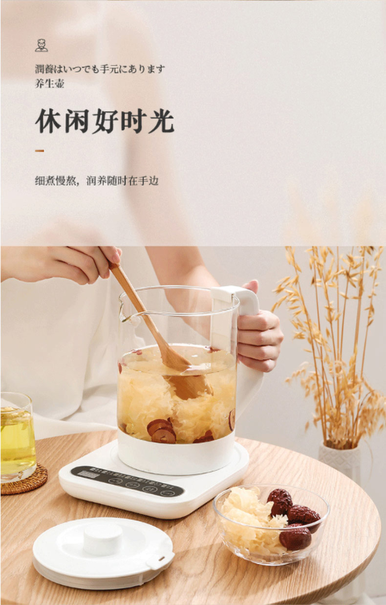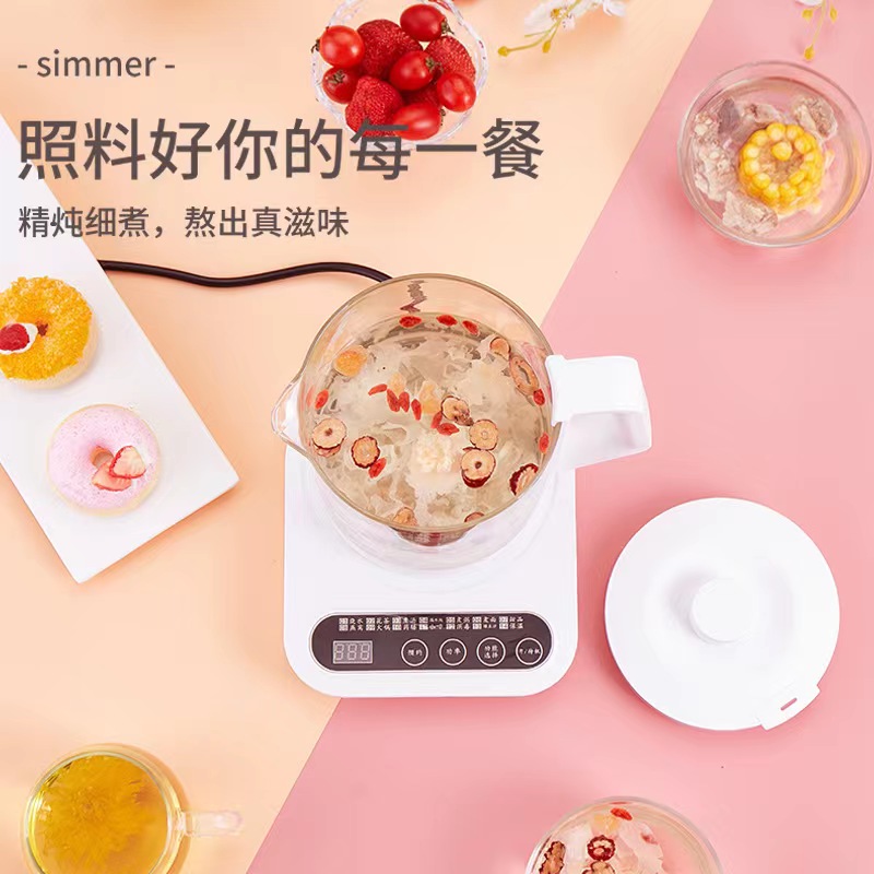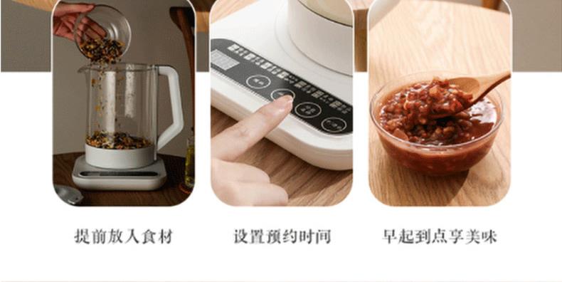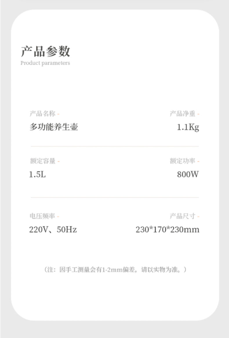 额定容量:1.5L 电压频率:220V、 50Hz 额定功率:800W 产品尺寸:230*170*230mm 七大模式一键畅用:速热、甜品、炖汤、煮粥、酸奶、药膳、养生茶全覆盖,三餐养生一壶搞定 定时预约 + 长效保温:自由设定时间,恒温锁温,享用温热美味 细火慢炖锁营养:文火慢熬萃取食材精华,口感醇厚,吃出天然健康 多功能养生:日常加热、滋补炖煮、轻食甜品、养生茶饮一机多用,满足全家膳食需求 操作简单易上手:功能分区清晰,老人小孩都会用,居家养生省心又便捷
