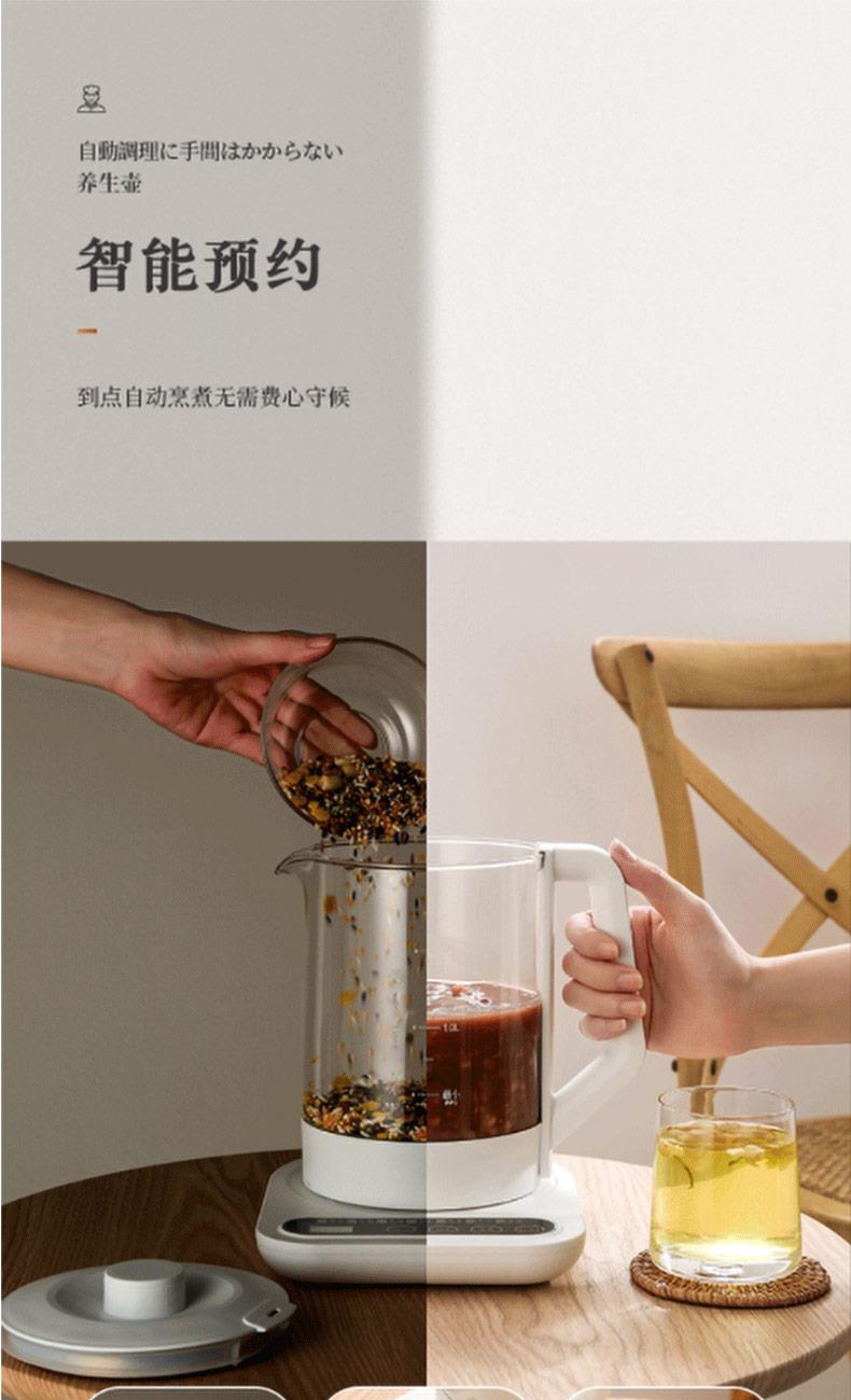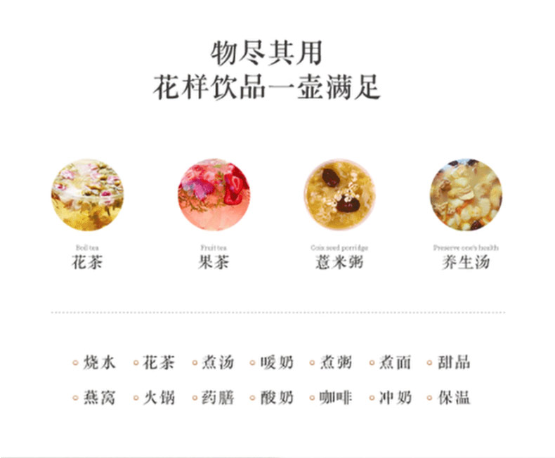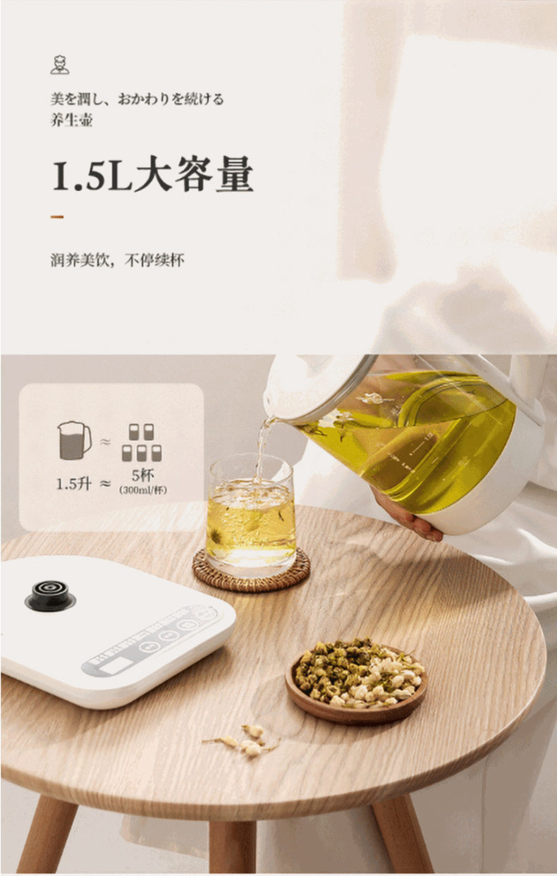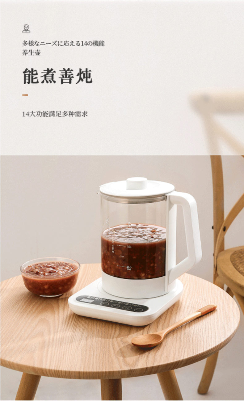 额定容量:1.5L 电压频率:220V、 50Hz 额定功率:800W 产品尺寸:230*170*230mm 七大模式一键畅用:速热、甜品、炖汤、煮粥、酸奶、药膳、养生茶全覆盖,三餐养生一壶搞定 定时预约 + 长效保温:自由设定时间,恒温锁温,享用温热美味 细火慢炖锁营养:文火慢熬萃取食材精华,口感醇厚,吃出天然健康 多功能养生:日常加热、滋补炖煮、轻食甜品、养生茶饮一机多用,满足全家膳食需求 操作简单易上手:功能分区清晰,老人小孩都会用,居家养生省心又便捷