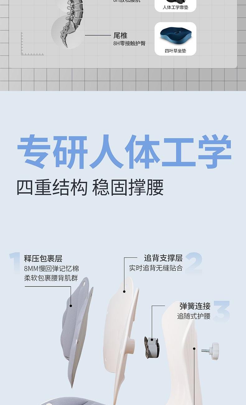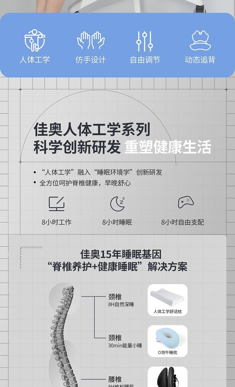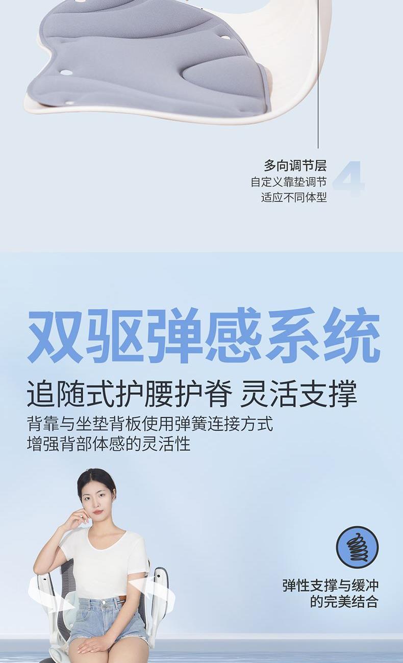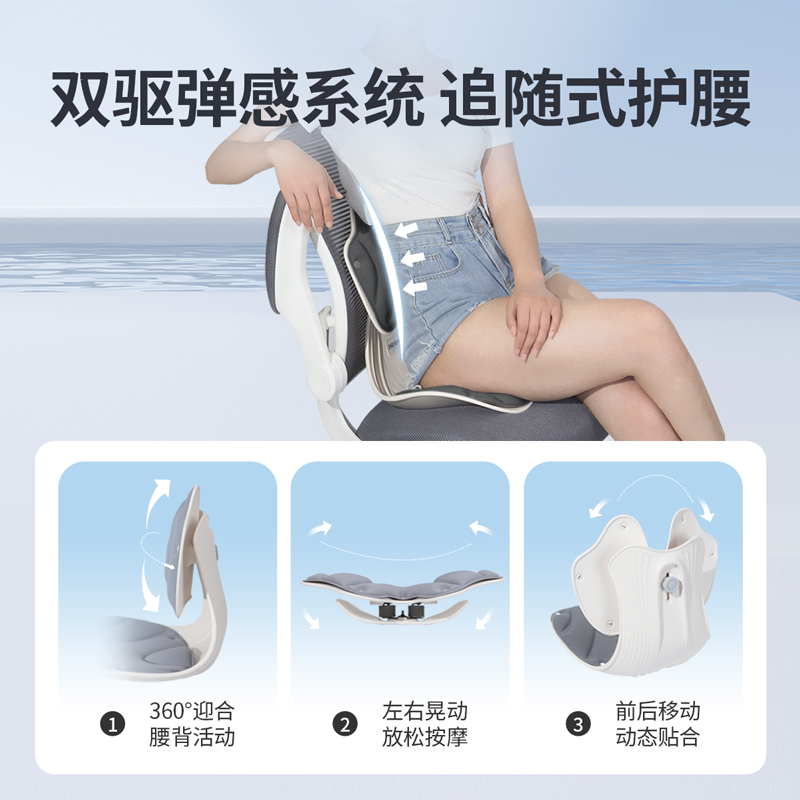 ①科学分区,贴合身体曲线 ②多挡调节,满足多样化需求 ③动态追背,随肌而动