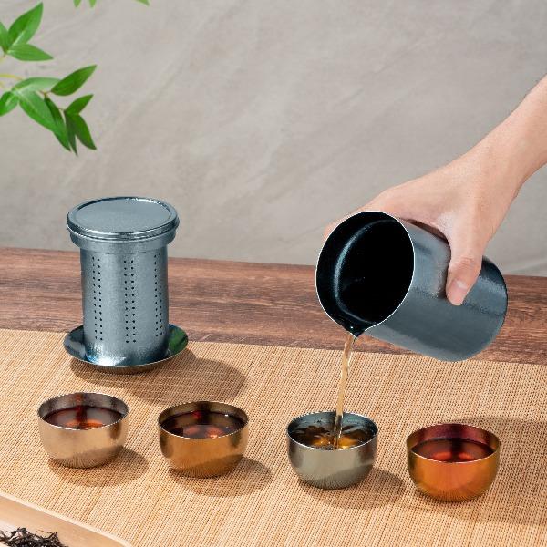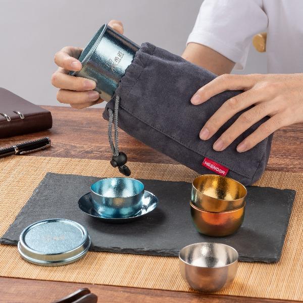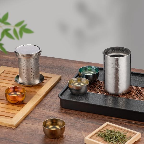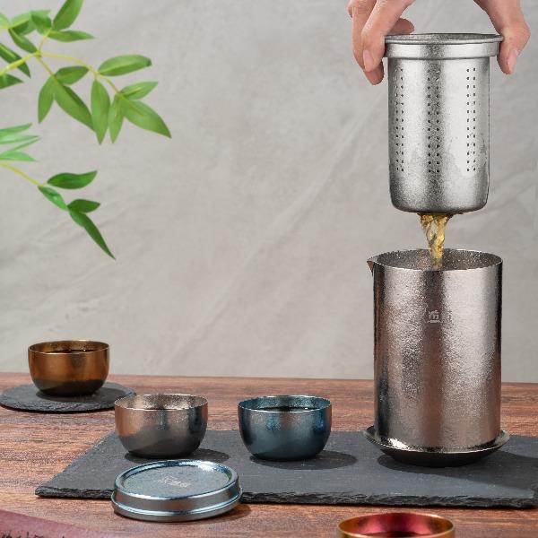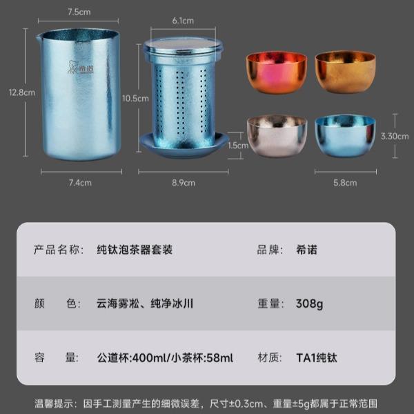 材质:钛 颜色:纯净冰川/云海雾凇 套组组成:泡茶器/钛小茶杯4个/茶托1个/可选收纳包1个 附加组件:无附件组件 容量:泡茶器400ml/小茶杯58ml 外箱尺寸 :63.5x55.0x26.8cm 毛净重:13.0/4.0 T型一体式滤网,滤茶干净 V型壶嘴,倒茶流畅,不撒漏 无喷漆,健康环保 专属收纳袋,方便携带