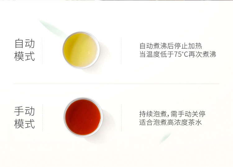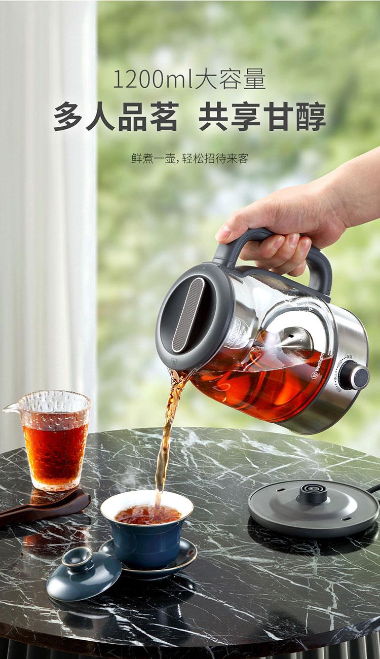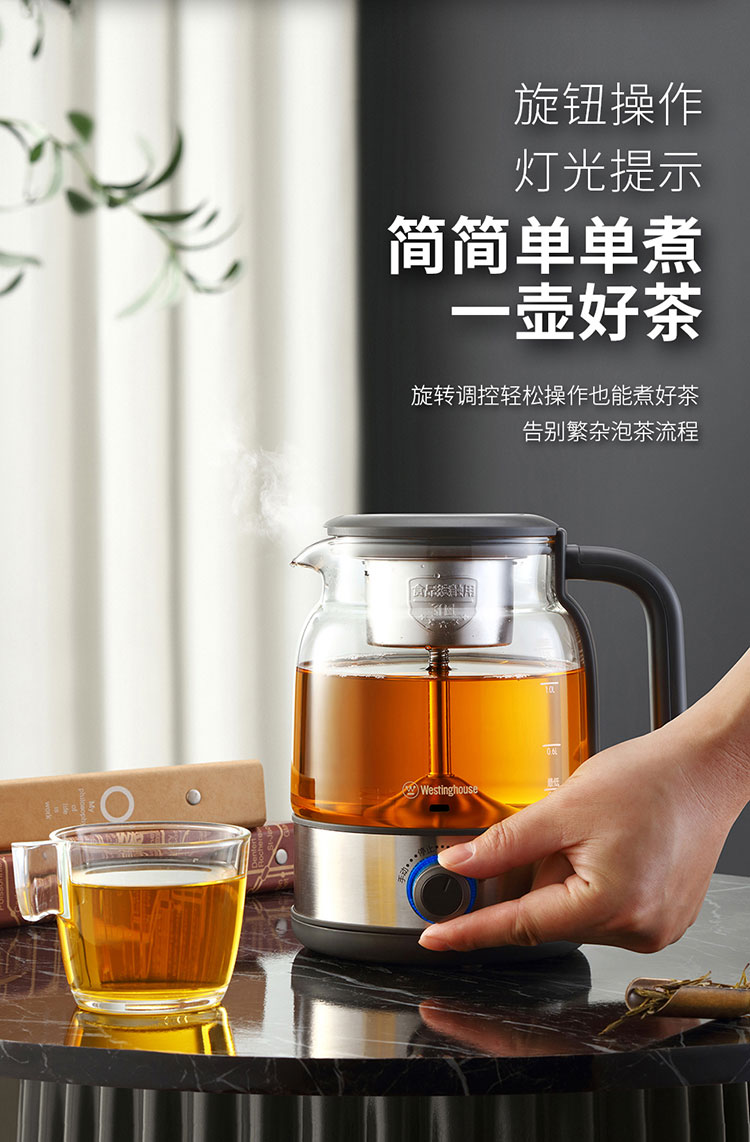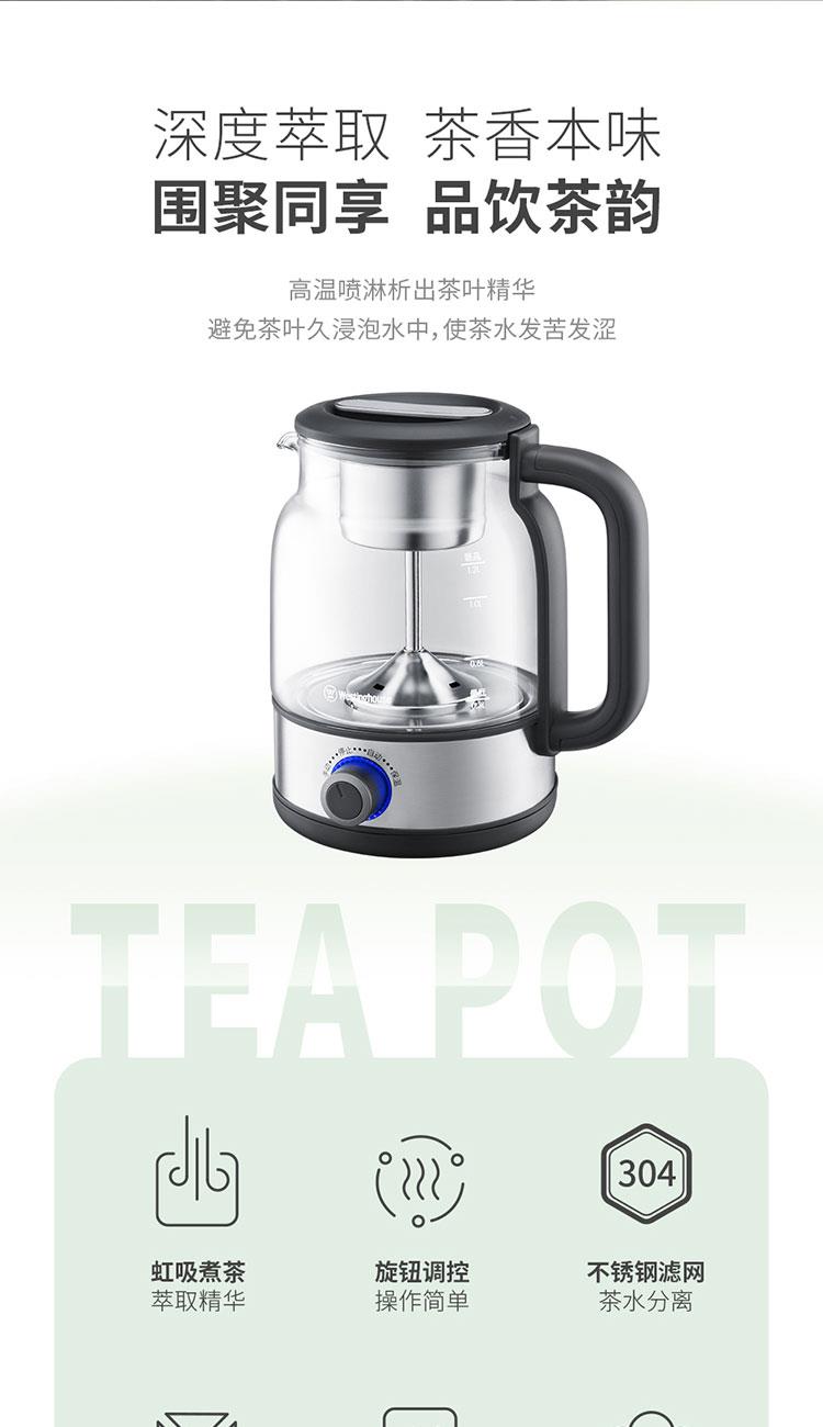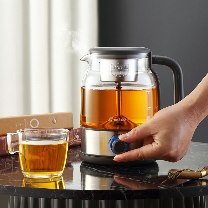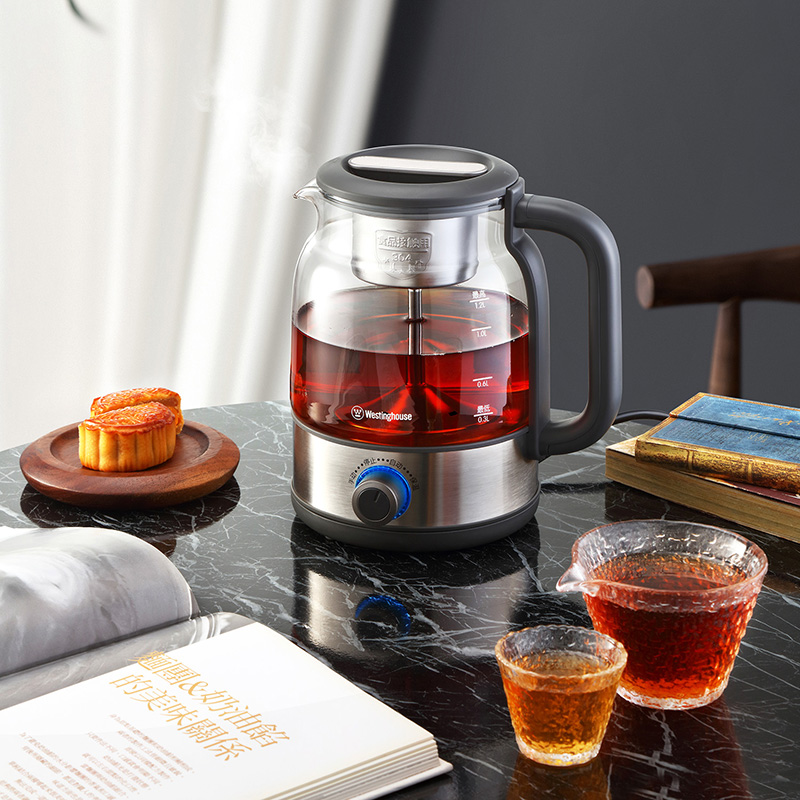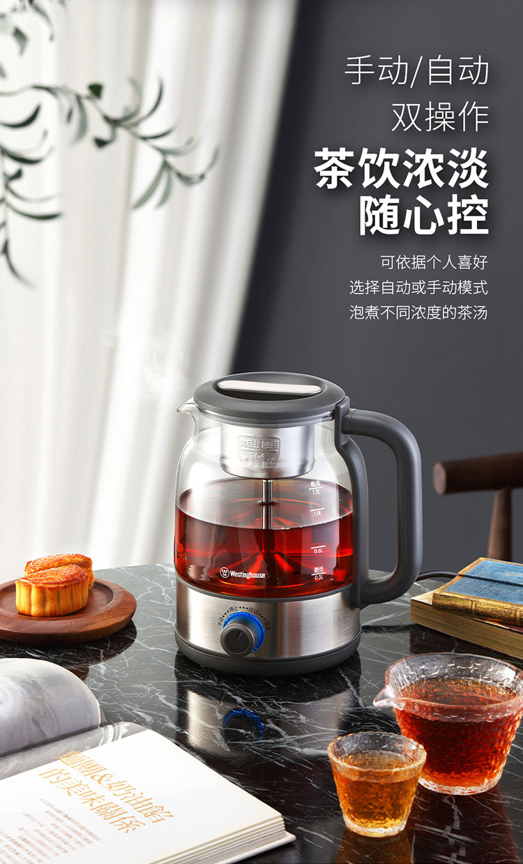 产品规格: 额定电压:220V~50Hz 额定功率:600W 额定容量:1.2L 壶身材质:高硼硅玻璃 产品颜色:不锈钢本色+黑色 操作方式:旋钮操作 产品特点: 高温喷淋煮茶,析出茶叶香醇本味; 手动、自动双操作,茶饮浓淡随心控; 1.2L大容量,多人品茗,共享甘醇; 高硼硅玻璃壶身,无惧冷热温差; 304不锈钢滤网,茶水分离,汤色清澈; 煮茶后将旋钮跳至保温,时刻享饮温热茶汤。