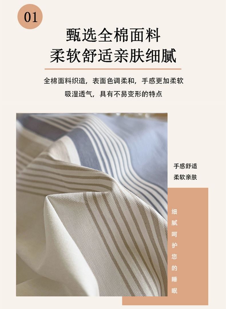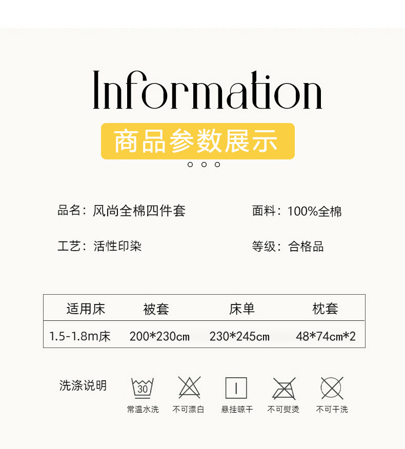 被套:200*230cm 床单:230*245cm 枕套:48*74cm*2 面料:全棉 产品特点: 全棉面料舒适、温度平衡,接受皮肤时感到柔软而不僵硬。棉纤维是天然纤维。纯棉织品与肌肤接触无任何刺激,对人体有益无害。
