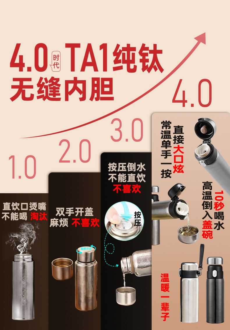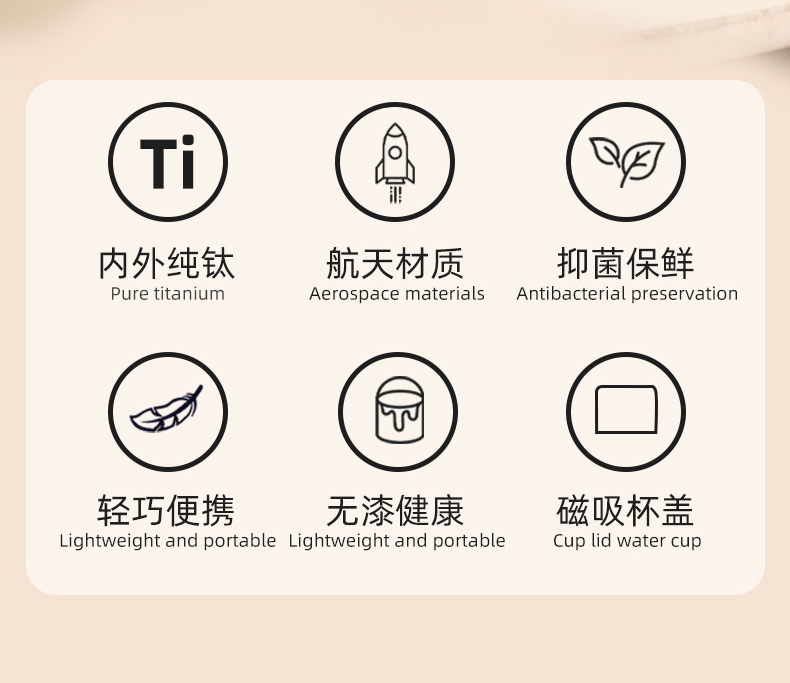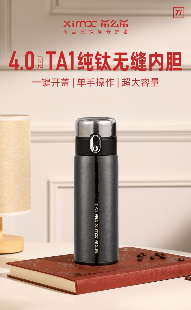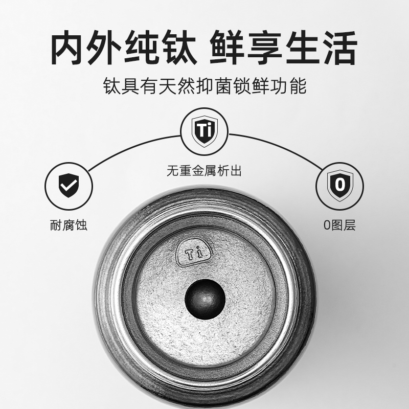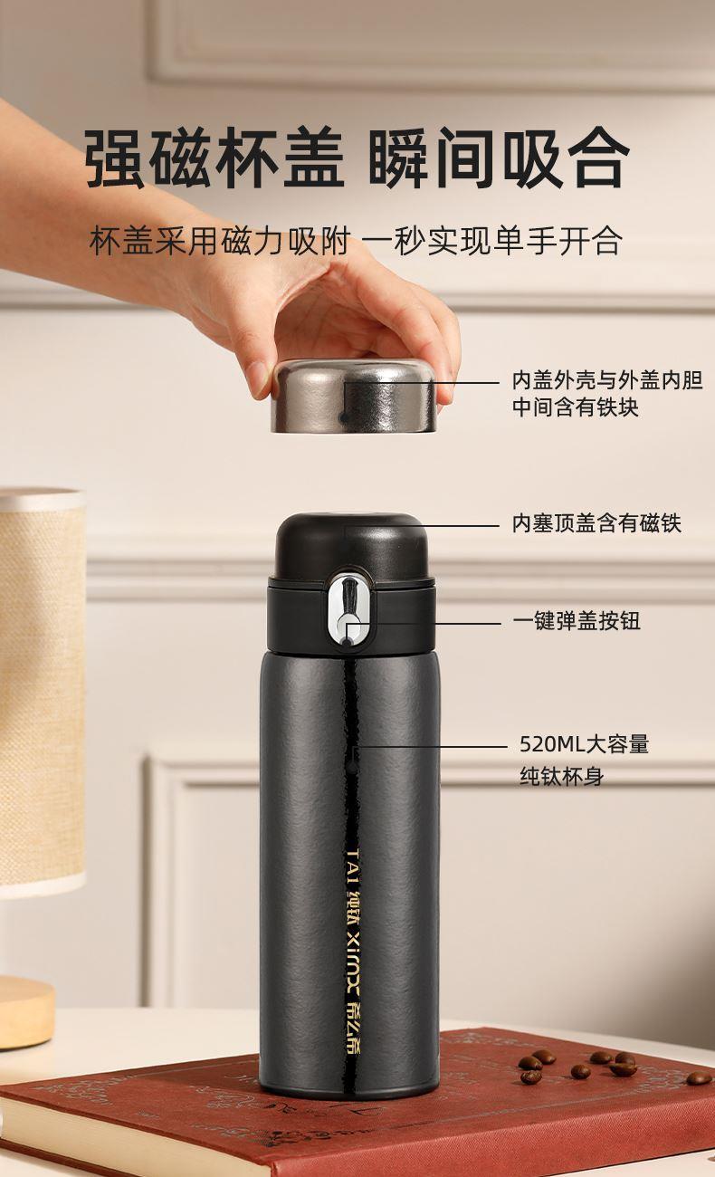 产品材质:钛 杯身样式:直身杯 产品容量:520ml 产品尺寸:65*200mm 颜色分类:本色 陨石黑 高颜值,带茶水分隔,携带方便,适用于多种场合,冰花质感,磁吸款杯盖更方便。 无重金属析出、耐酸碱、耐腐蚀、不含磁、易清洁、抑制细菌保鲜时长可5-7天,杯身外观自然成色,不使用一滴颜料,不存在掉色、“铅”超标等问题