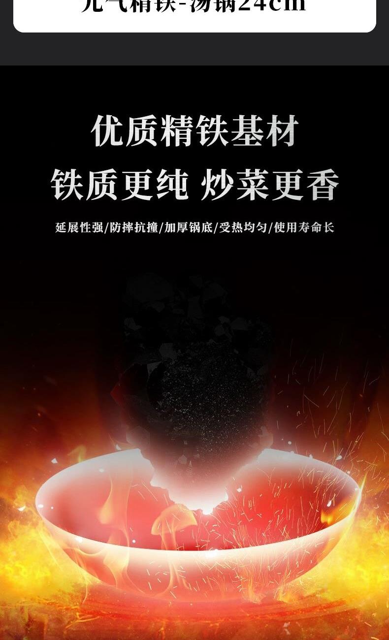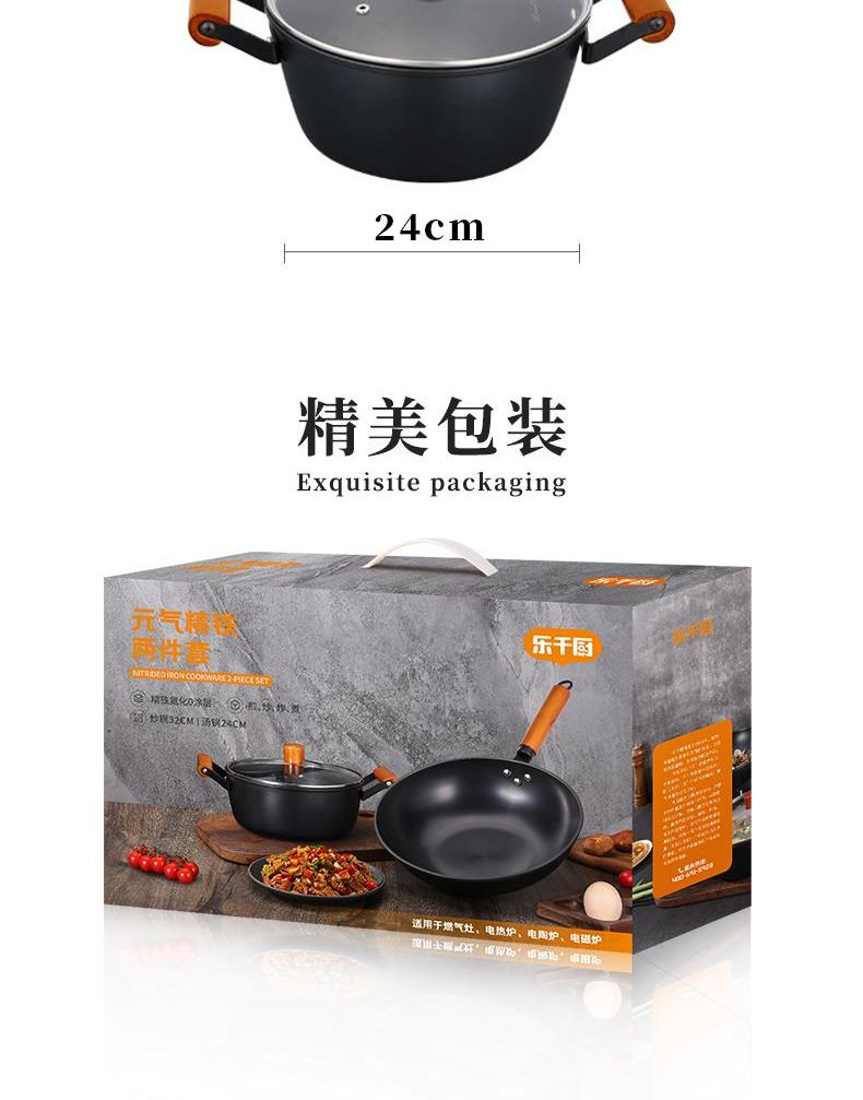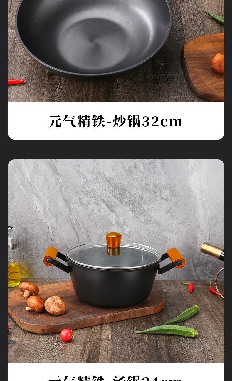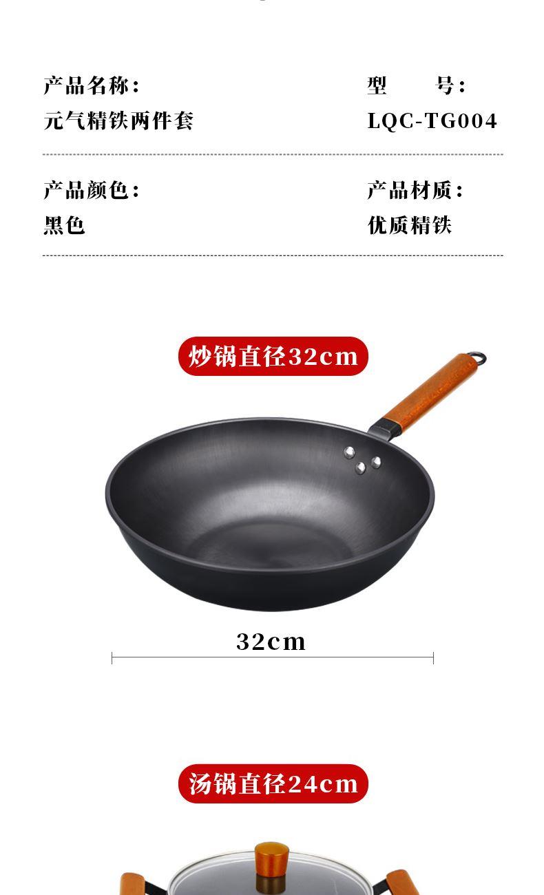 规 格:炒锅32cm 汤锅24cm 加高硼硅盖 材 质:优质精铁 装 箱 数:6pcs/箱 彩盒尺寸:L51*W13*H33.5CM 1、锅身采用高温气氨室化铁技术,无涂层,健康安全。 2、烹饪时游离出更多铁离子,长期使用可达到补铁效果 3、气氢工艺处理,在常规情况下不易生锈 4、可使用各类锅铲,铁铲、木铲、硅胶铲 5、适用燃气灶、电陶炉、电磁炉等各类灶具