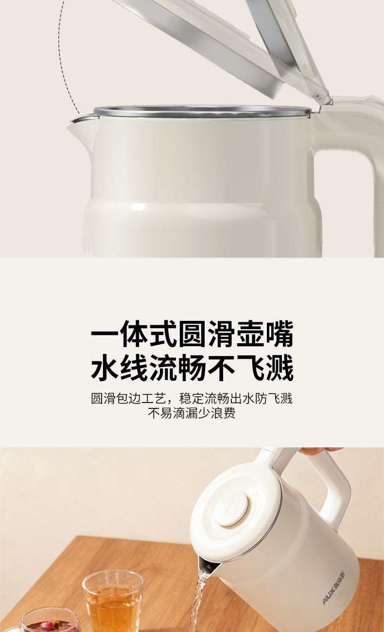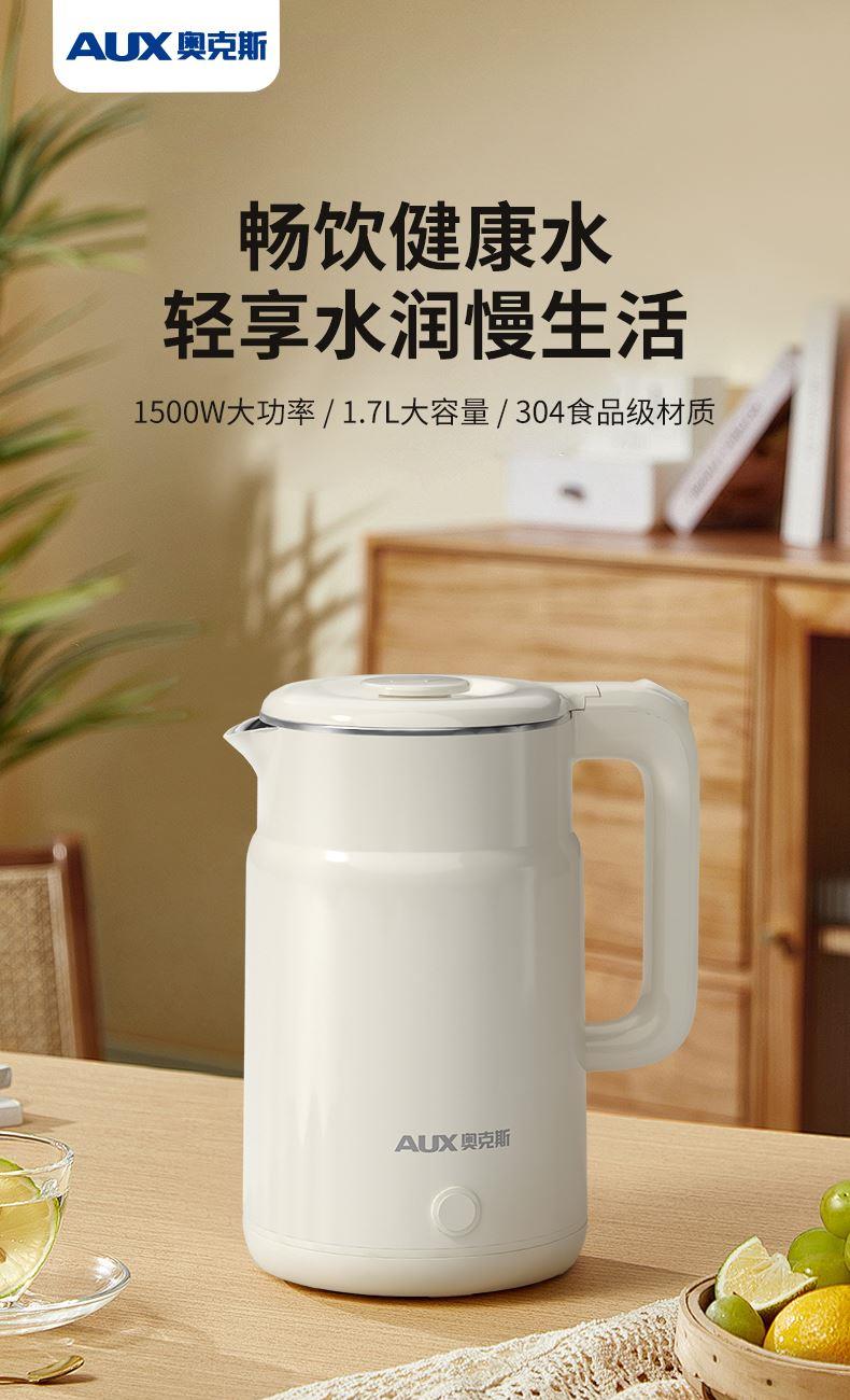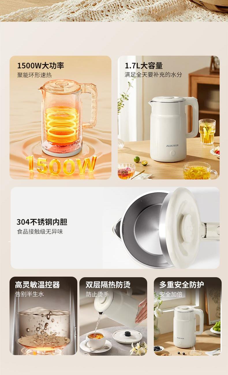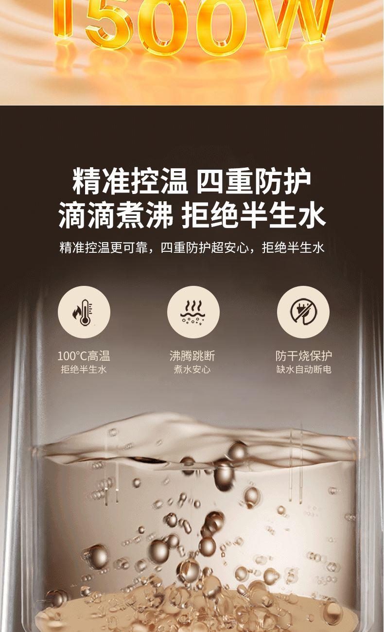 额定电压:220V~ 额定功率:1500W 额定频率:50Hz 材质:内胆材质:304不锈钢,杯盖:304不锈钢,外壳:PP 食品级304不锈钢内身,健康饮水无异味 双层隔热防烫手,给予贴心呵护 1500W聚能速热,冲泡不久等 大广角一键开盖,口径大易清洁 1.7L大容量,满足一天饮水需求