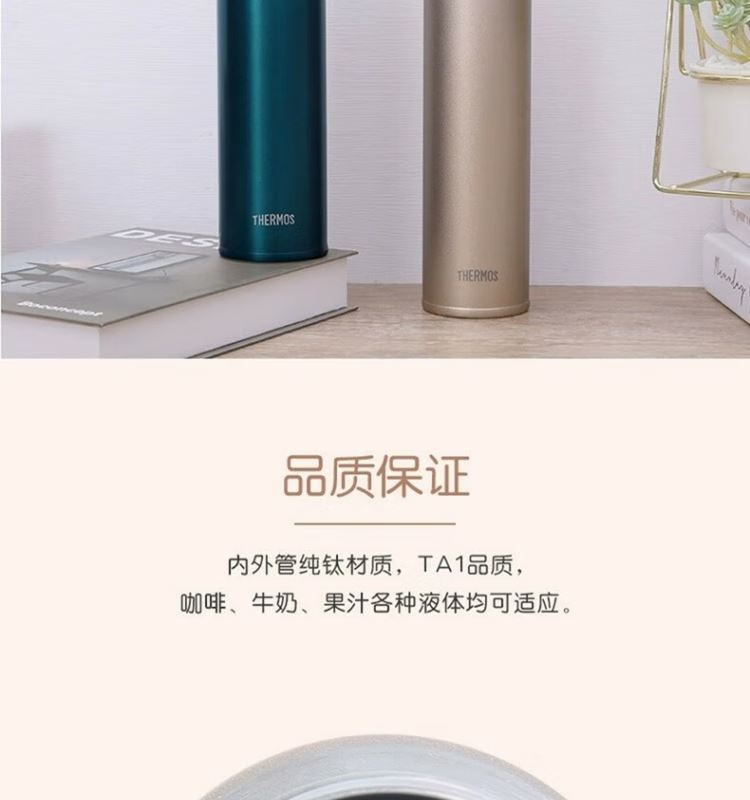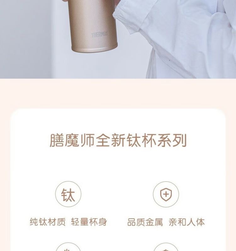 颜 色:BGD 香槟金 BL 深海蓝 GY 太空灰 容 量:400毫升 保温效力:60℃以上/6小时 保冷效力:11C以下(6小时) 外管材质:纯钛TA1(工业纯钛) 内管材质:纯钛TA1(工业纯钛) 密封圈:食品级硅胶 杯盖材质:食品级PP
