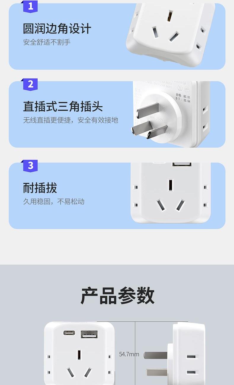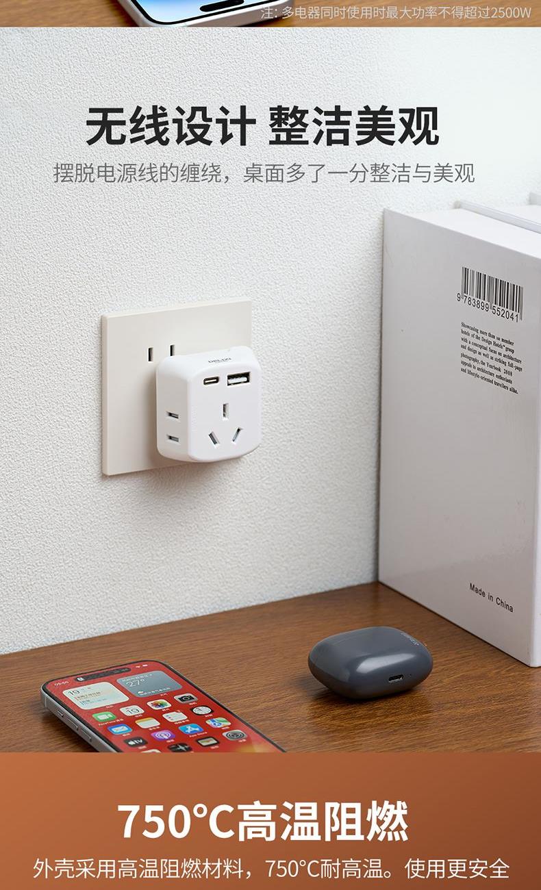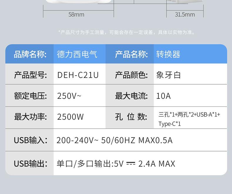 产品型号:DEH-C21U 额定电流:10A 产品颜色:象牙白 额定功率:2500W 额定电压:250V 插座尺寸:58*31.5*54.7mm USB输入:200-240V~50/60HZ MAX0.5A USB输出:单口/多口输出:5V⎓2.4A MAX 产品位数:一位三孔、两位两孔、1USB、1type-c、无线
