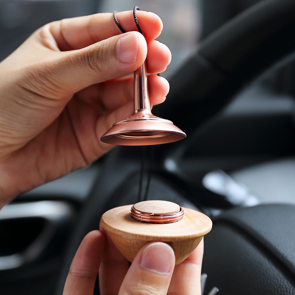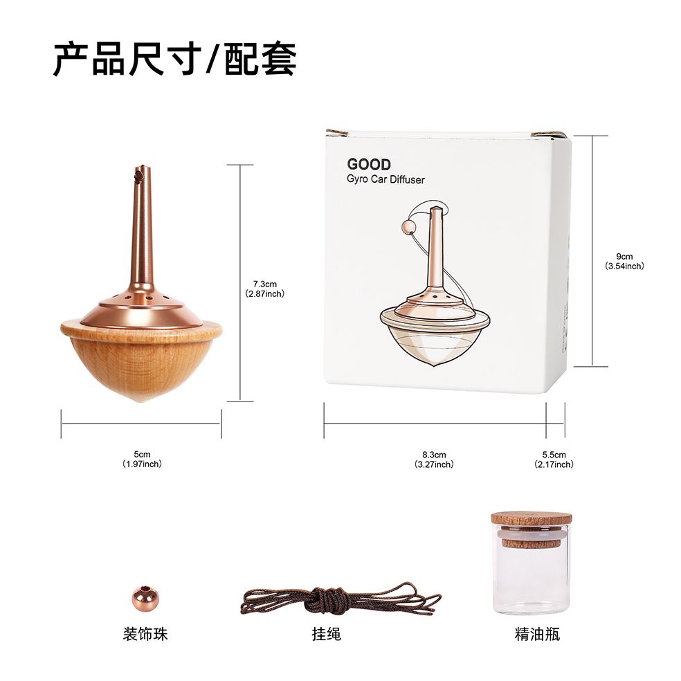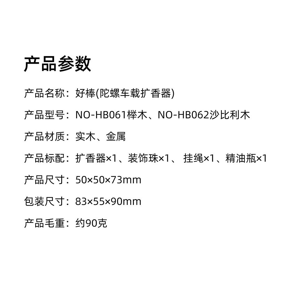 陀螺车载扩香器 产品型号:NO-HB061榉木、NO-HB062沙比利木 产品材质:实木、金属 产品标配:扩香器*1、装饰珠*1、挂绳*1、精油瓶*1 产品尺寸:50*50*73mm 包装尺寸:83*55*90mm 产品毛重:约90g