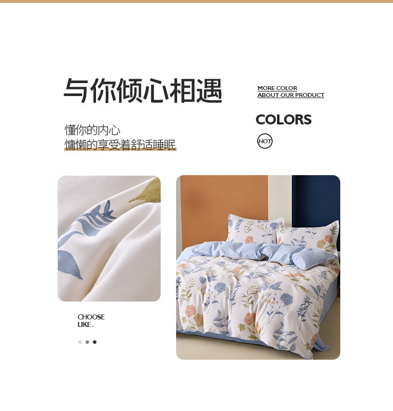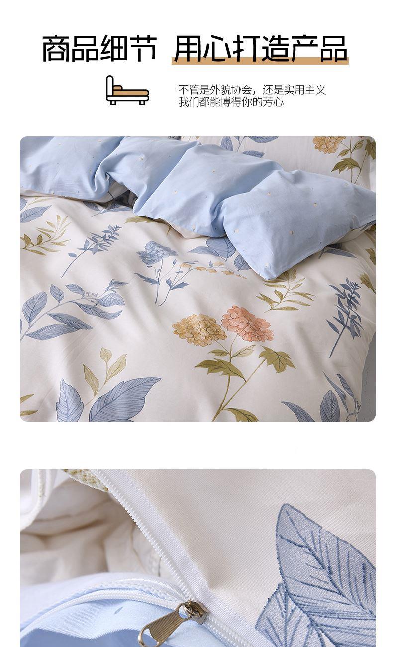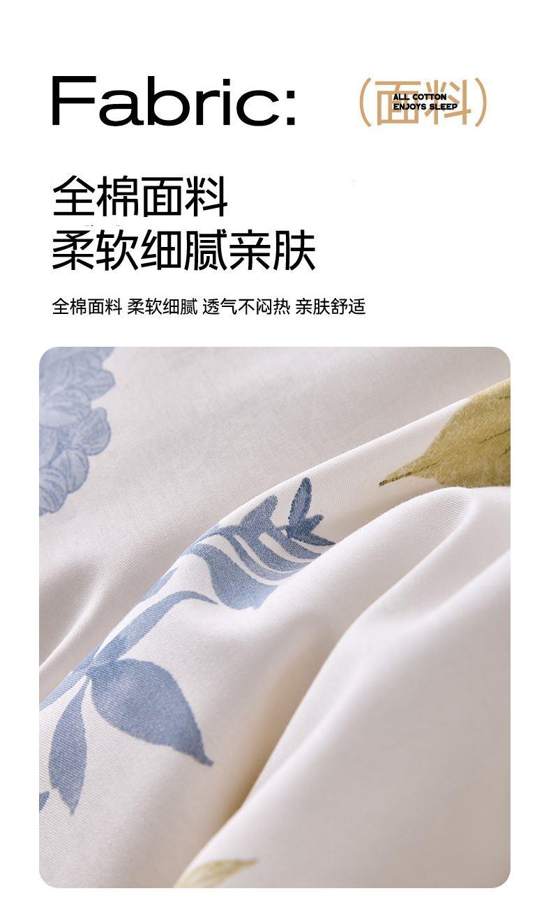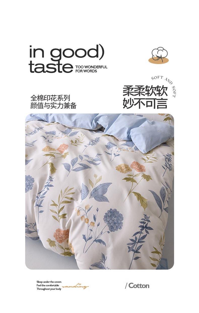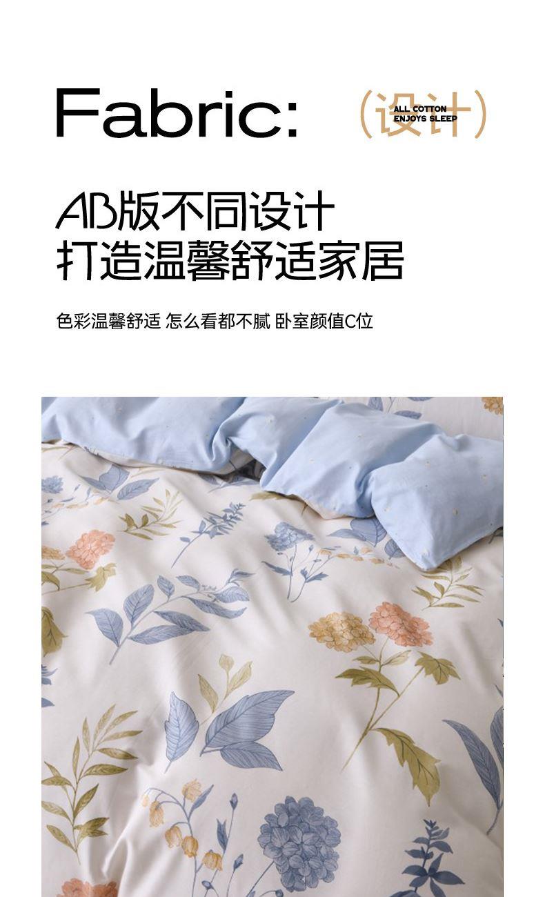 被套:200*230cm 床单:230*245cm 枕套:48*74cm*2 面料:全棉 执行标准:GB/T22796-2021 安全类别:GB18401-2010 B类 .1.臻选纯棉面料,印染工艺采用活性印染工艺,不起球,不褪色,极具柔软性,在纺纱过程中,增加了精致梳理的程序,疏去软短的纤维,剔除棉花种的杂质,以制造出平滑的纱线,让棉花更有韧性,使人感到柔软。 2.纯棉纤维具有良好的保湿型,透气性能好,使用感觉温暖。