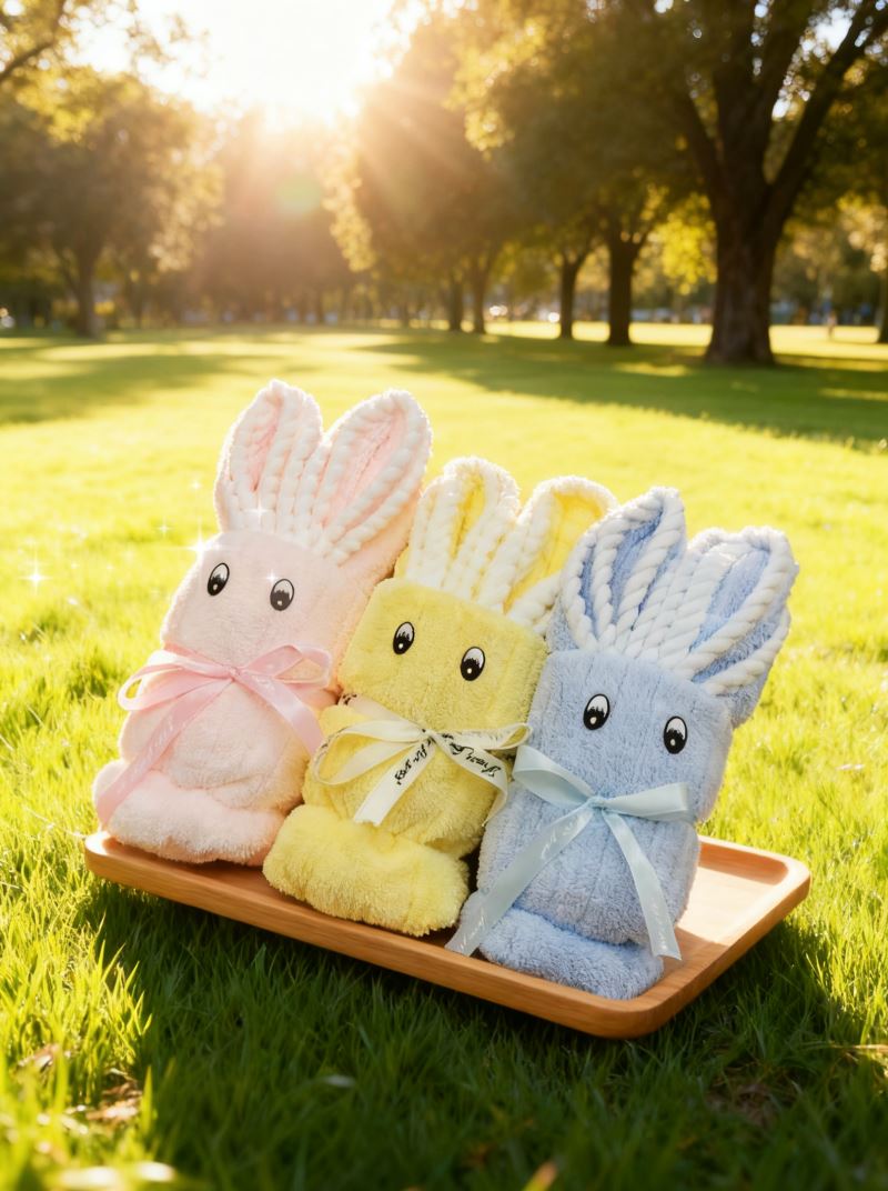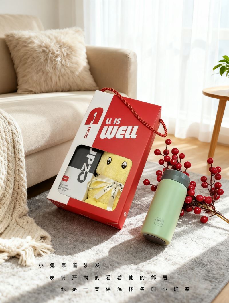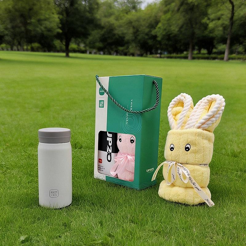 型号: A22B13 产品内容 1、 欢喜小兔毛巾×1 35*75CM 平方克重300克 精致包边工艺 2、 小确幸口袋杯×1 304内胆 PP杯盖 200毫升容量 外盒: 25×14×7cm 欢喜小兔大毛巾 升级精美包边 波浪纹面料 小确幸主题杯 设计融入祝福语 产品撞色搭配 时尚美观