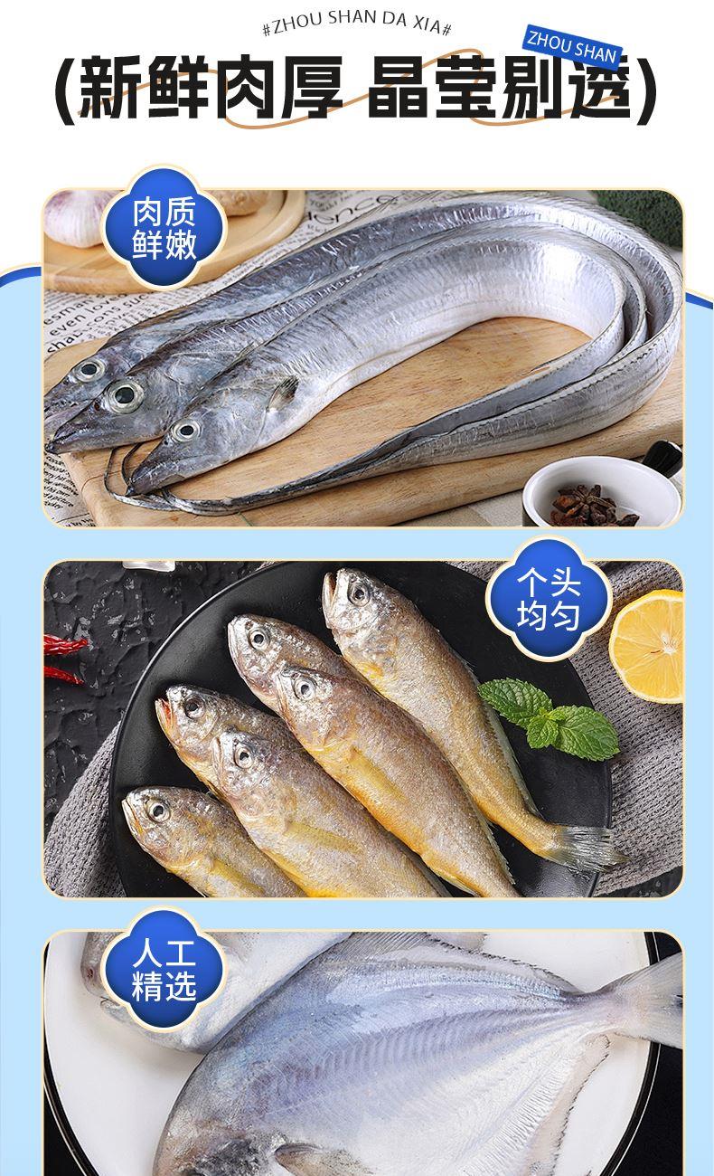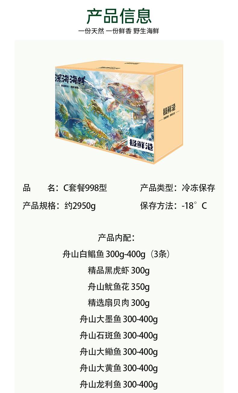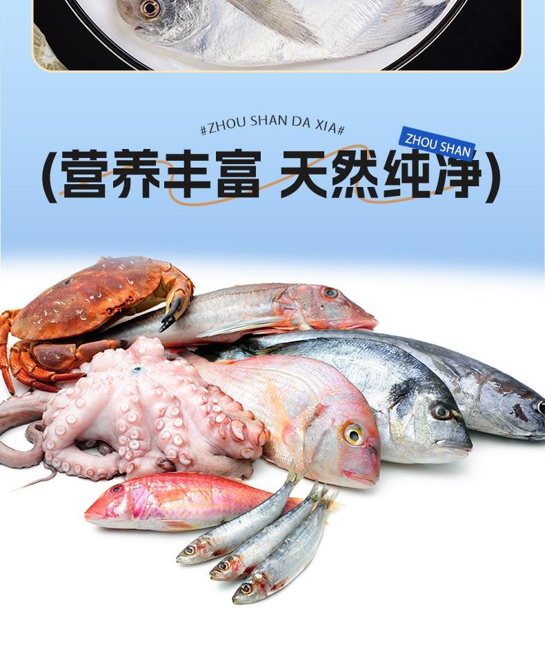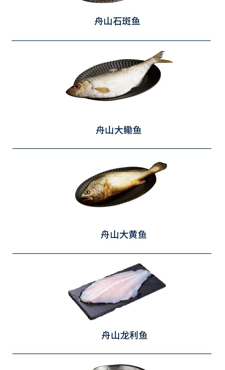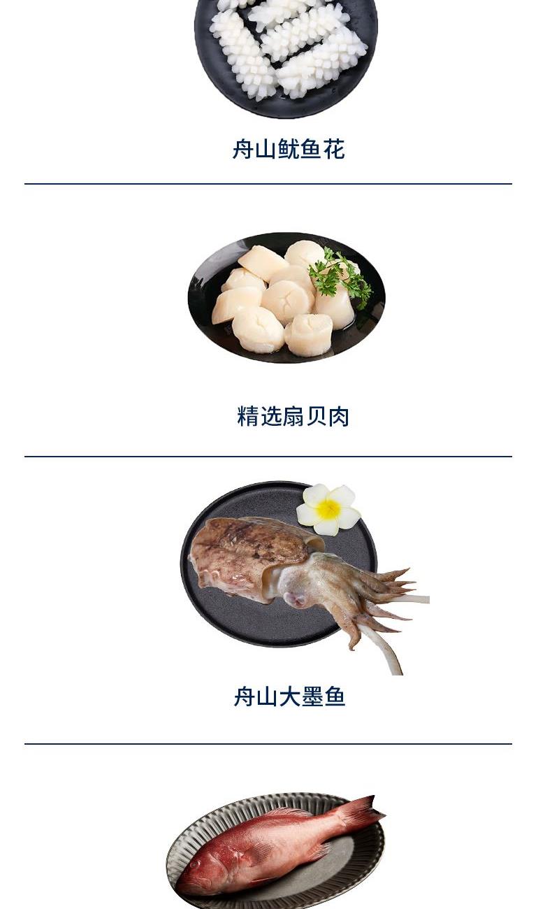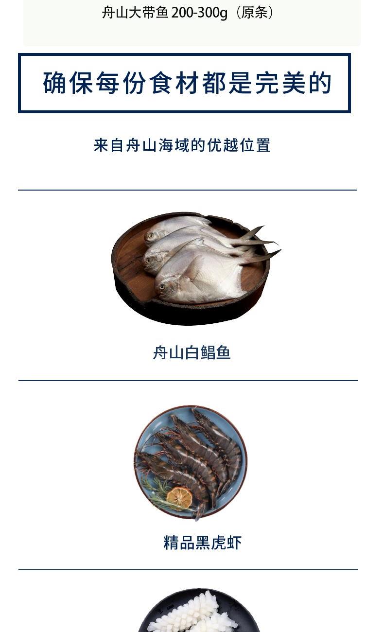 产品内配:舟山白鲳鱼300g-400g(3条)精品黑虎虾 300g舟山鱿鱼花 350g精选扇贝肉 300g舟山大墨鱼 300-400g舟山石斑鱼 300-400g舟山大鳓鱼 300-400g舟山大黄鱼 300-400g舟山龙利鱼 300-400g舟山大带鱼 200-300g(原条)