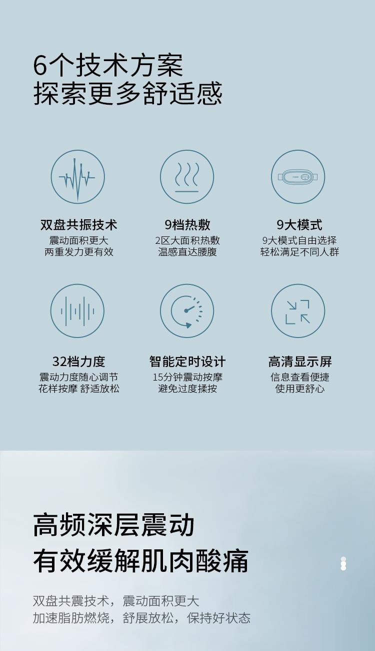 彩盒尺寸:220*125*85mm 黄包尺寸:225*130*90mm 外箱尺寸:550*310*510mm 包装材料:彩盒+邮购盒 69码:6977778242786 额定输入:5V⎓ 工作电压:3.7V⎓ 额定功率:10Wf材质:ABS > 根据人体工程学设计,美观舒适 > 内设15分钟定时自动关机功能 > 采用PI发热技术、9档发热、9个模式、32档力度调节,可根据自身来选择
