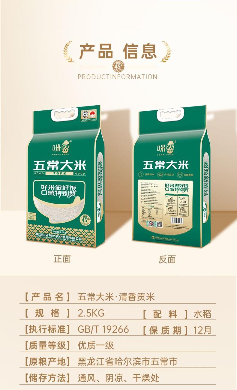产 品 : 五常大米-清香贡米2.5kg 执行标准 : GB/T 19266 保 质 期 :12个月 产 地 : 黑龙江省五常市 箱 规 :8*2.5kg