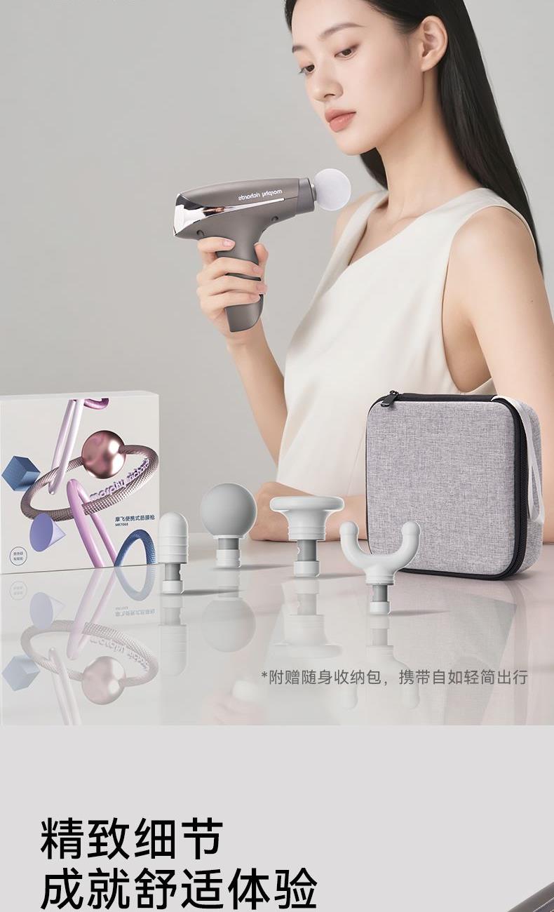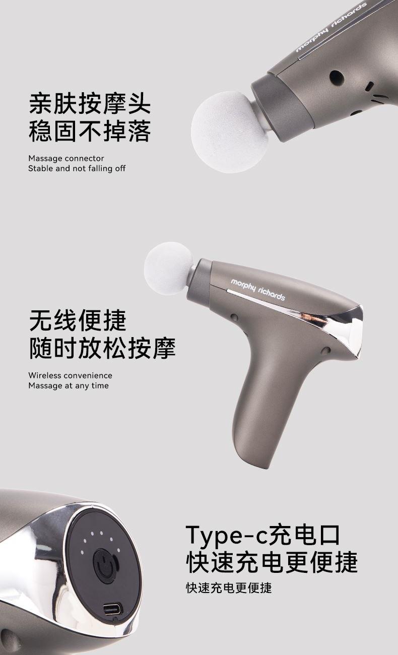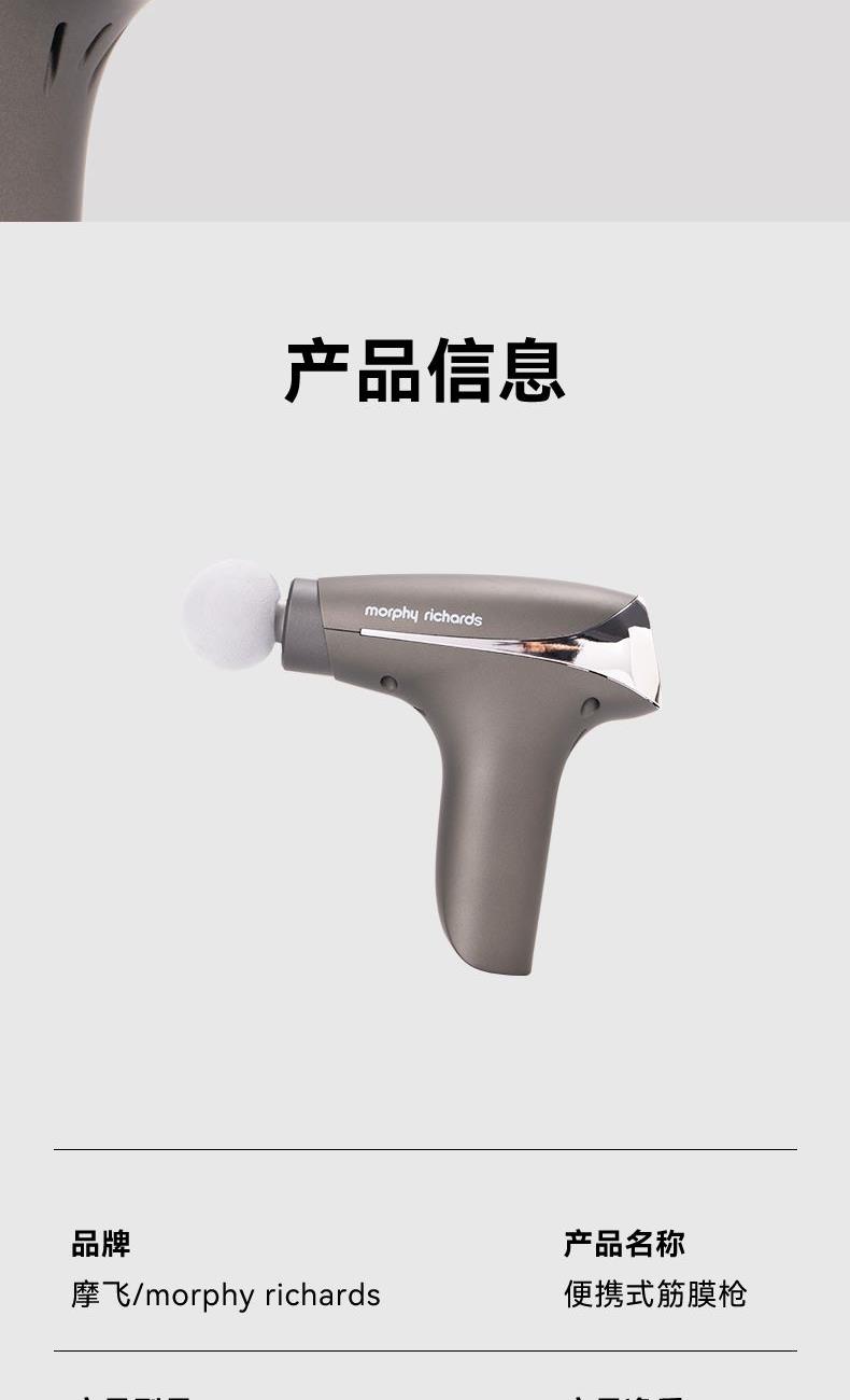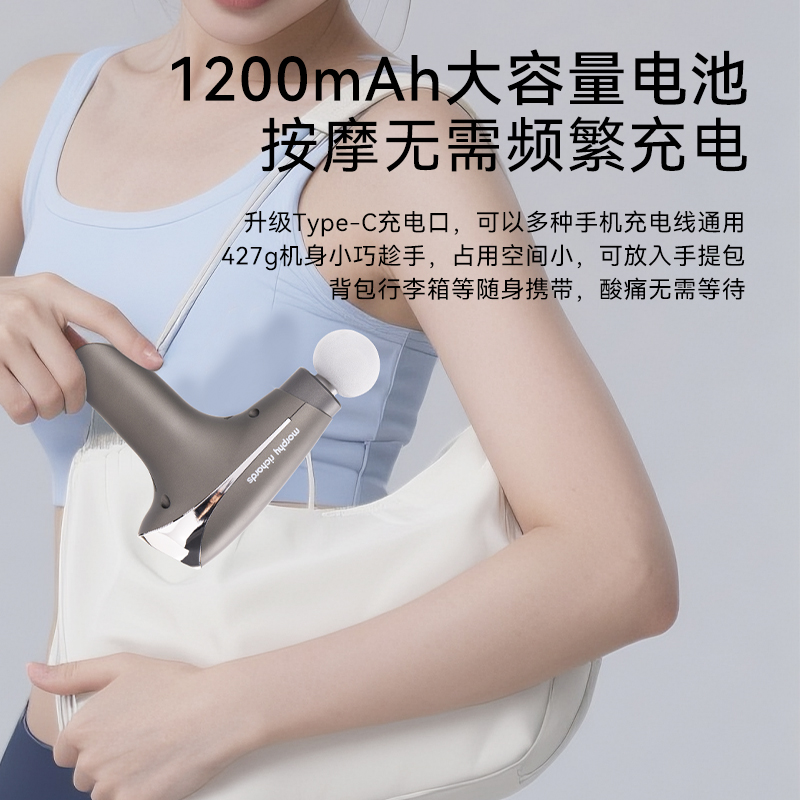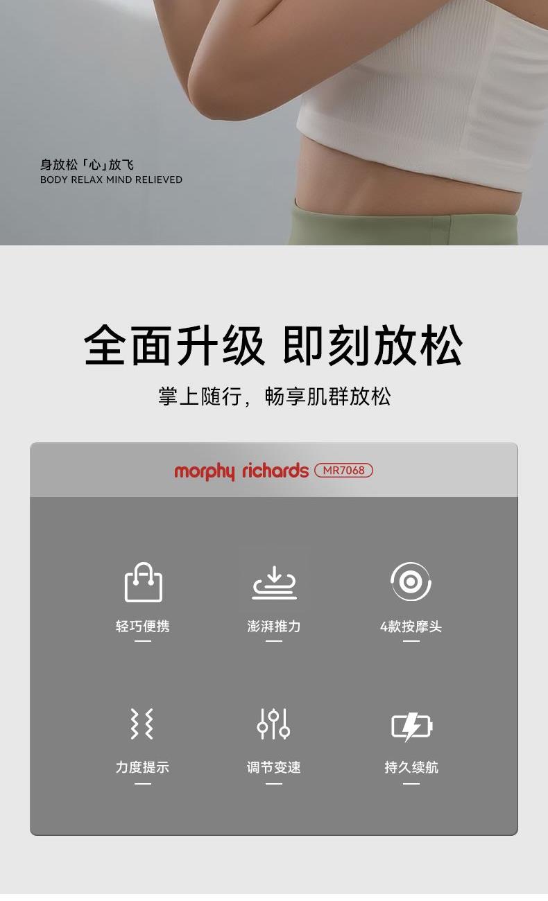 型号 MR7068 产地 浙江金华 净重 427g 毛重 约700g 包装尺寸 21X9X19cm(彩盒) 大箱尺寸 50x44.5X41.5cm 续航: ≈3h 充电时间:2.5小时±0.5小时 充电电压:DC 5V2A 功率:30w 工作电压:7.4V 充电接口:Type-C 电池容量:1200毫安 执行标准:GB31241-2014 配件 主机,按摩头*4,收纳包,充电线 卖点:一件操控、6挡力度调节,满足多样人群需求 30W澎湃动力,直达深层,深入六层肌群 细腻磨砂手感,400g小巧便携 4款高品质按摩头,针对性解决疲劳 45分贝下静音工作 1200mAh锂电池,超长续航