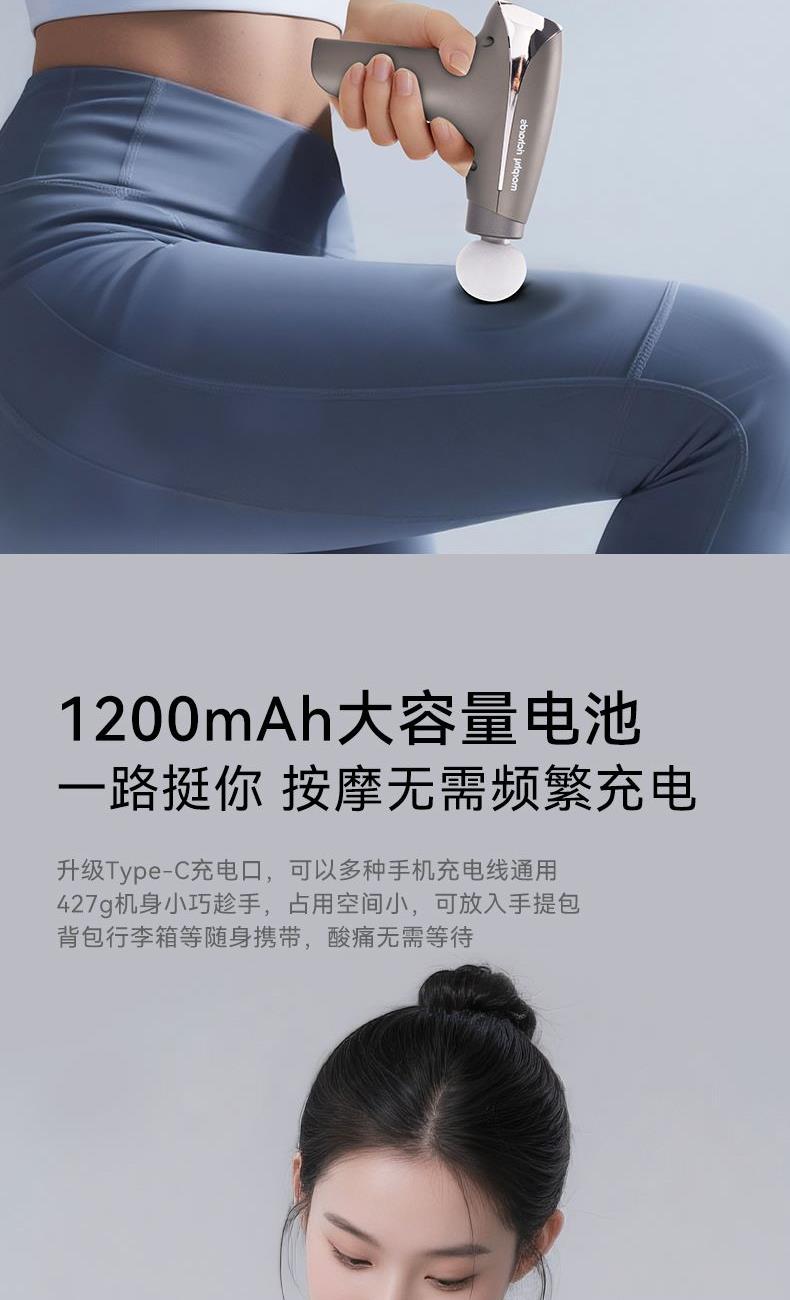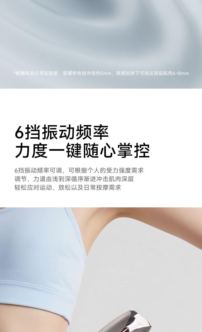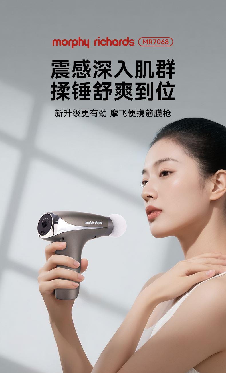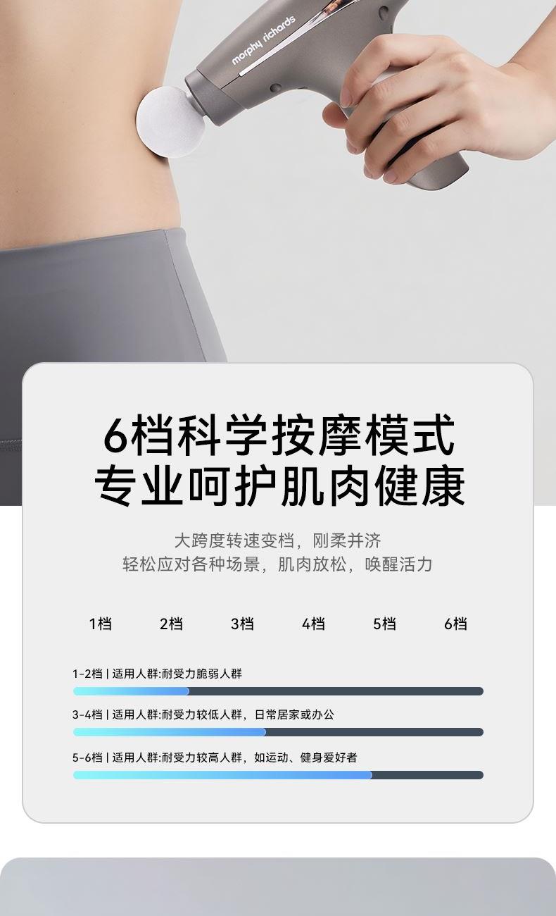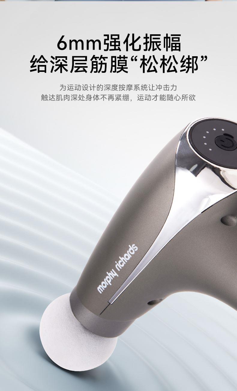 型号 MR7068 产地 浙江金华 净重 427g 毛重 约700g 包装尺寸 21X9X19cm(彩盒) 大箱尺寸 50x44.5X41.5cm 续航: ≈3h 充电时间:2.5小时±0.5小时 充电电压:DC 5V2A 功率:30w 工作电压:7.4V 充电接口:Type-C 电池容量:1200毫安 执行标准:GB31241-2014 配件 主机,按摩头*4,收纳包,充电线 卖点:一件操控、6挡力度调节,满足多样人群需求 30W澎湃动力,直达深层,深入六层肌群 细腻磨砂手感,400g小巧便携 4款高品质按摩头,针对性解决疲劳 45分贝下静音工作 1200mAh锂电池,超长续航