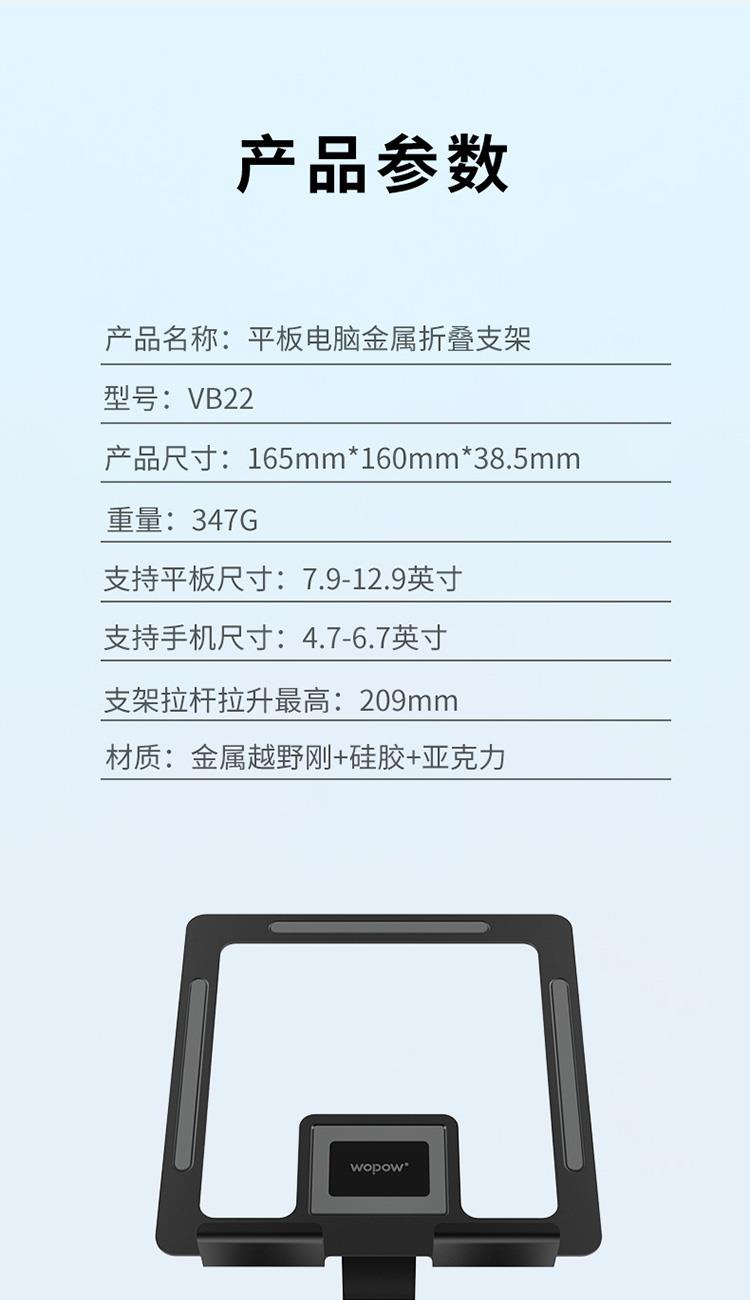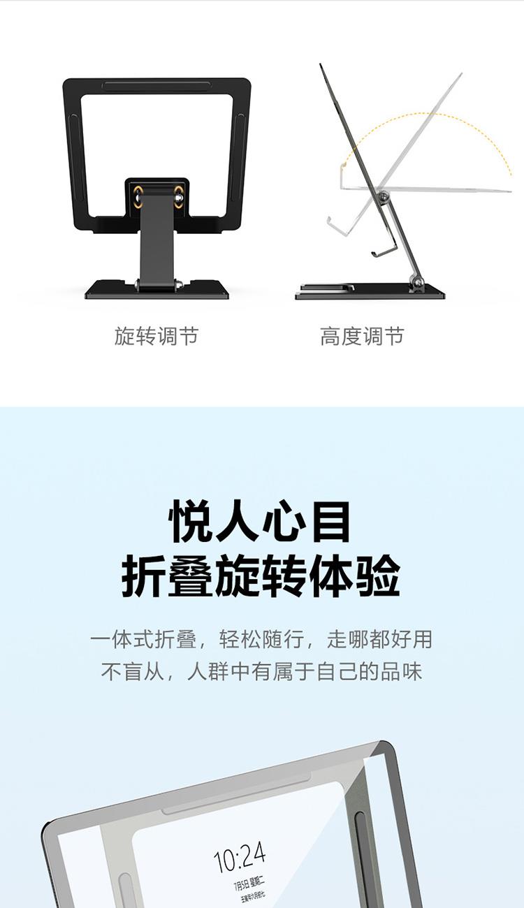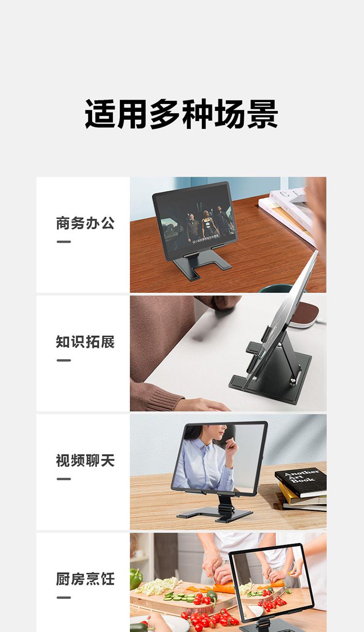 产品尺寸:165*160*38.5mm 包装尺寸: 166*41*169mm 产品重量:347g 支架拉杆拉升高:209mm 支持平板尺寸:7.9-12.9英寸,支持手机尺寸:4.7-6.7英寸 拉升拉杆与水平斜角60°时承受重量:800克 使用环境温度:高温:70℃,低温:-20℃,湿度:95% 25℃ 颜色:锖色 材质:金属越野刚+硅胶+亚克力 适用场景:家用/办公/直播/游戏/观影追剧 可折叠方便携带,多角度调节,强力阻尼, 稳固支撑,喷砂耐氧化,遇水不掉漆,硅胶防滑,4-12.9寸手机平板通用,避线设计边充边玩 凹槽设计不挡字