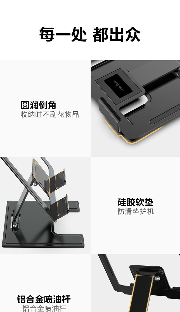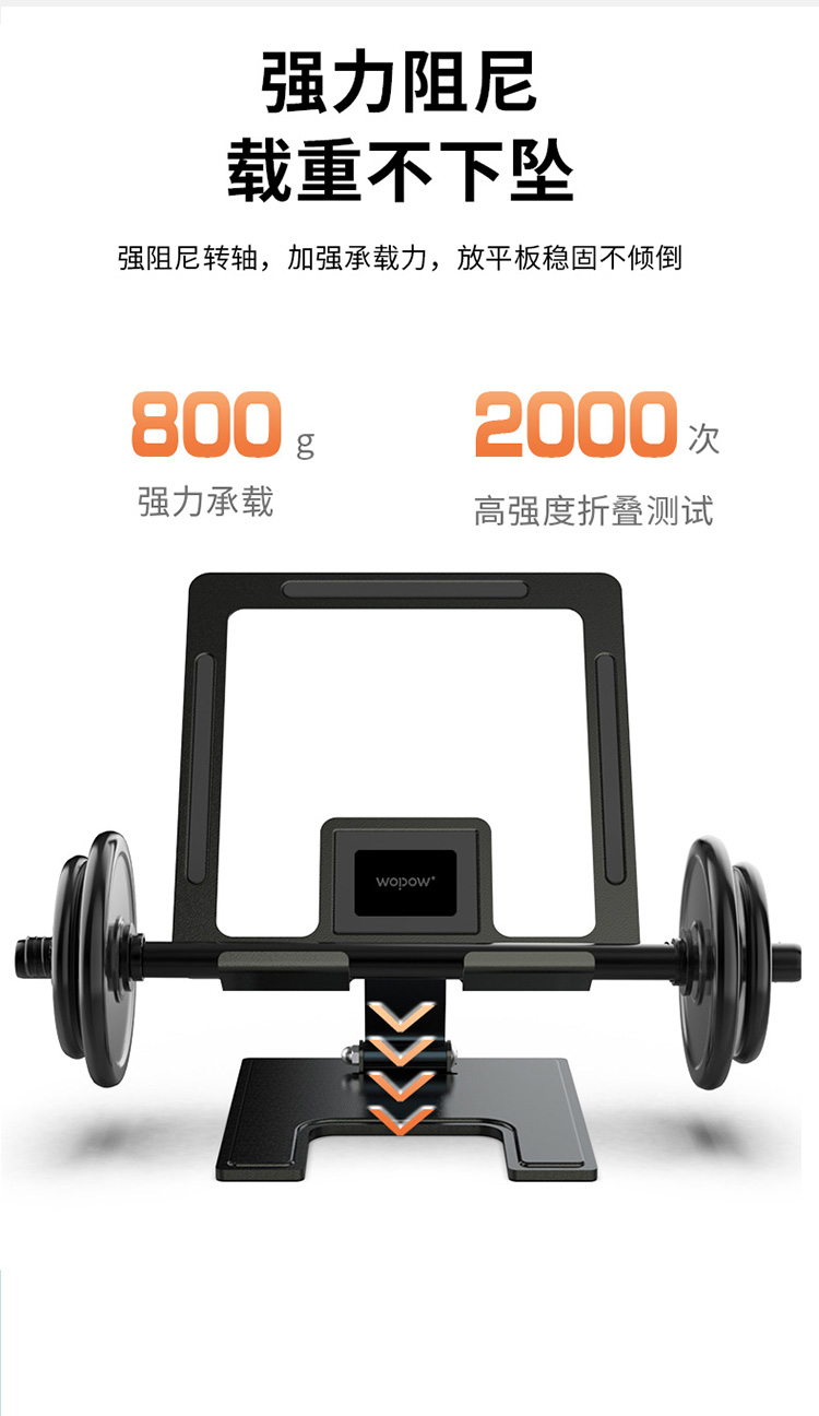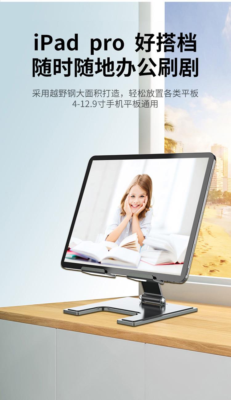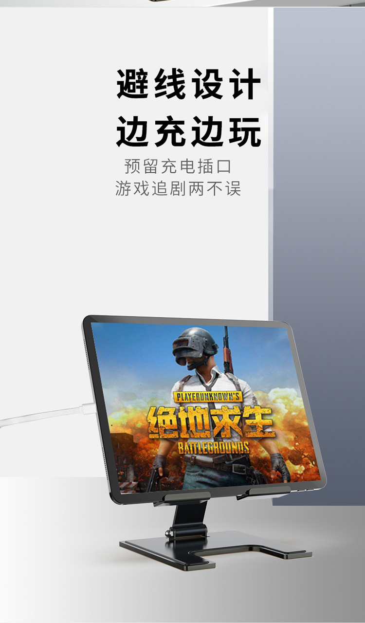 产品尺寸:165*160*38.5mm 包装尺寸: 166*41*169mm 产品重量:347g 支架拉杆拉升高:209mm 支持平板尺寸:7.9-12.9英寸,支持手机尺寸:4.7-6.7英寸 拉升拉杆与水平斜角60°时承受重量:800克 使用环境温度:高温:70℃,低温:-20℃,湿度:95% 25℃ 颜色:锖色 材质:金属越野刚+硅胶+亚克力 适用场景:家用/办公/直播/游戏/观影追剧 可折叠方便携带,多角度调节,强力阻尼, 稳固支撑,喷砂耐氧化,遇水不掉漆,硅胶防滑,4-12.9寸手机平板通用,避线设计边充边玩 凹槽设计不挡字