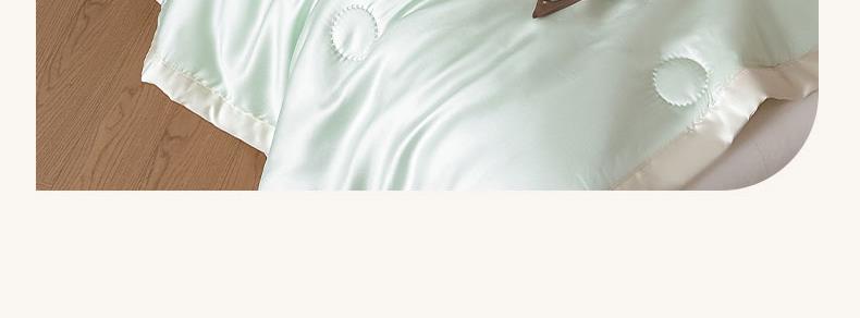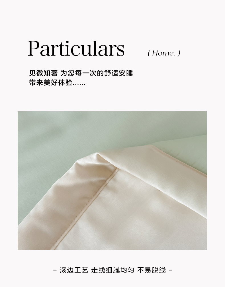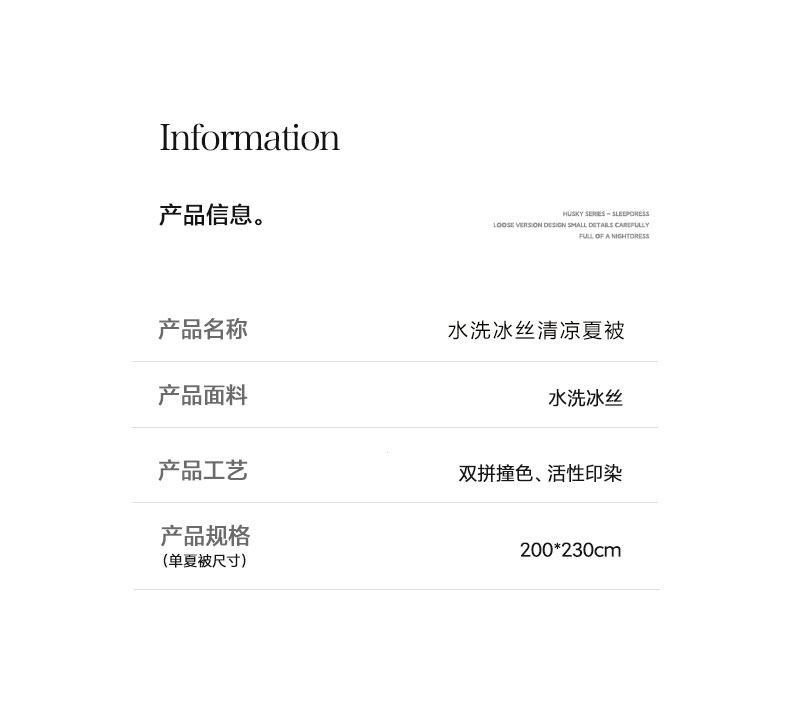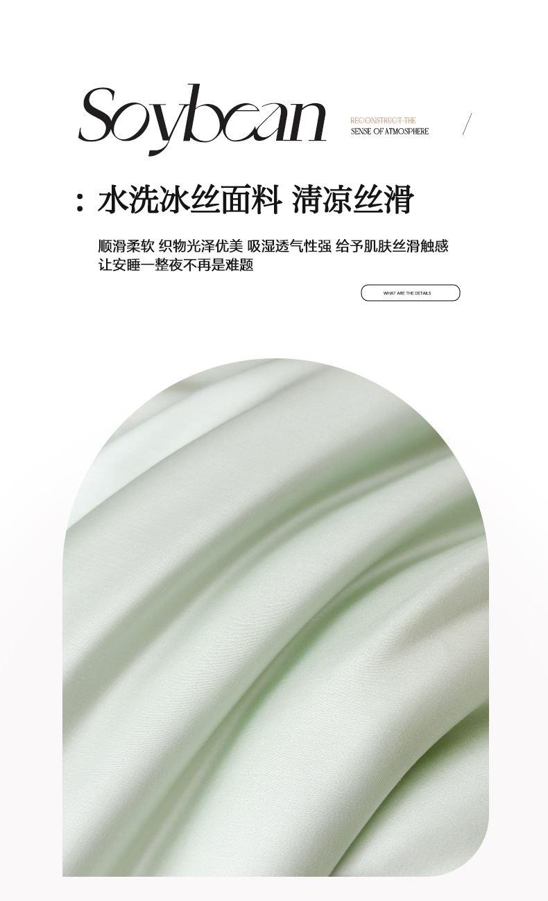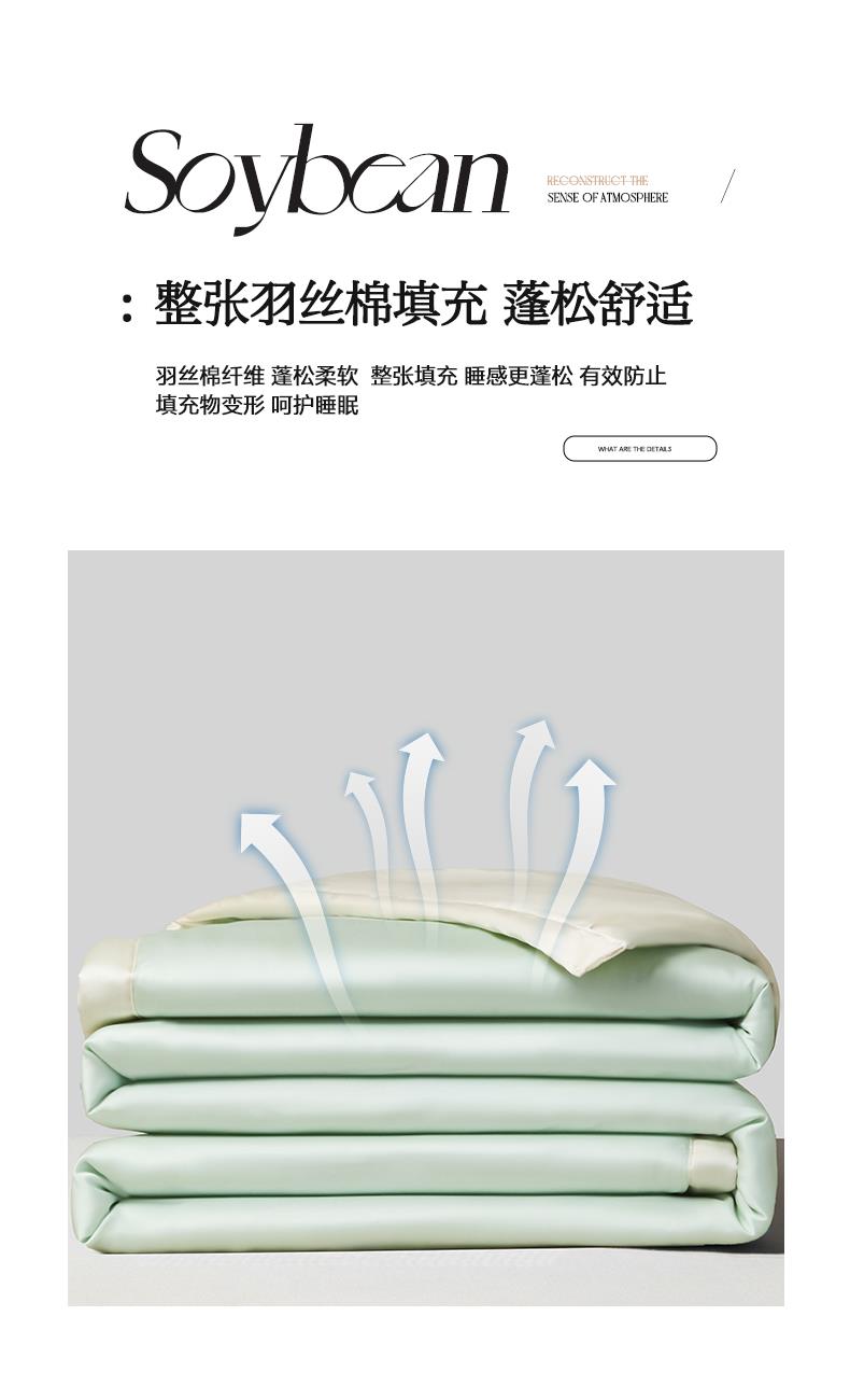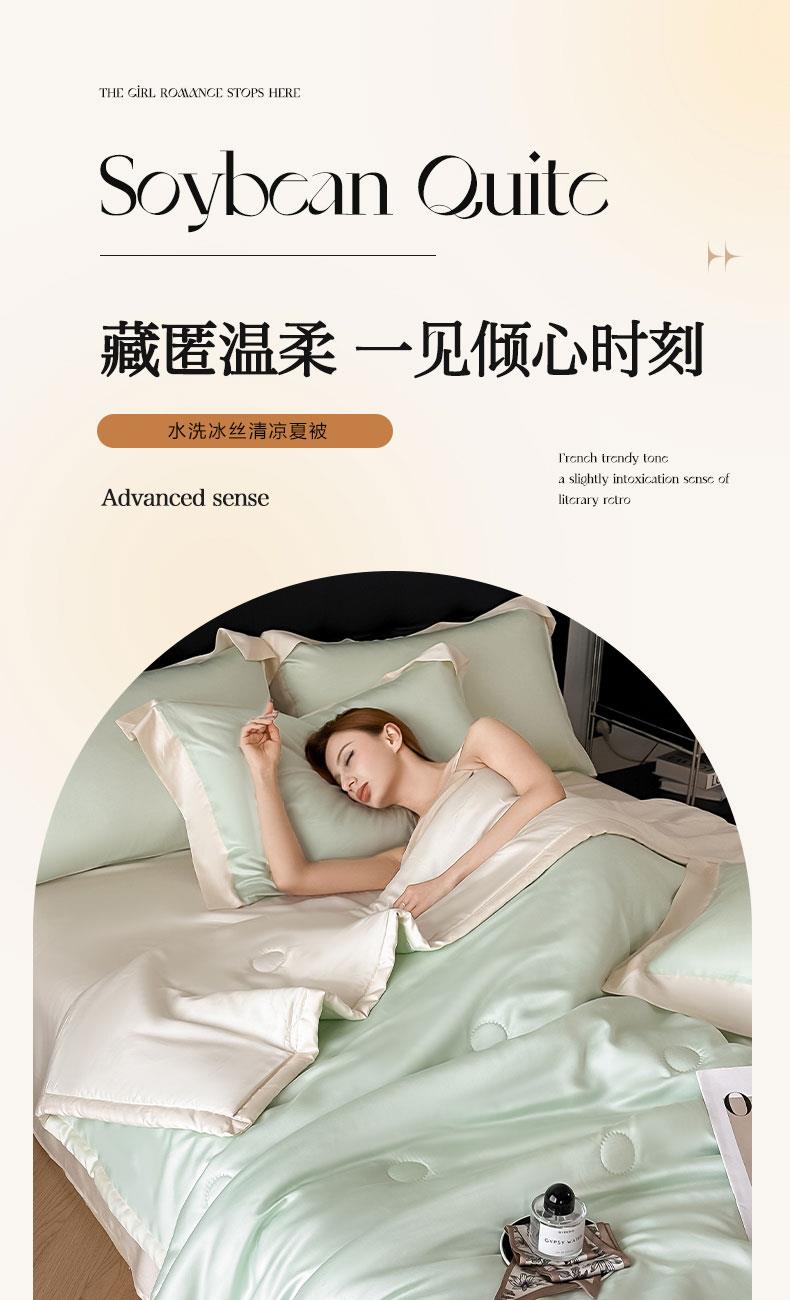 面料:水洗冰丝(聚酯纤维) 填充:聚酯纤维(整张棉) 规格:200cm*230cm 水洗冰丝面料,凉滑触感,曼妙柔滑媲美真丝质地,肌肤沉浸式奢柔呵护。顺滑柔软织物光泽优美吸湿透气性强给予肌肤丝滑触感,呵护整夜睡眠。