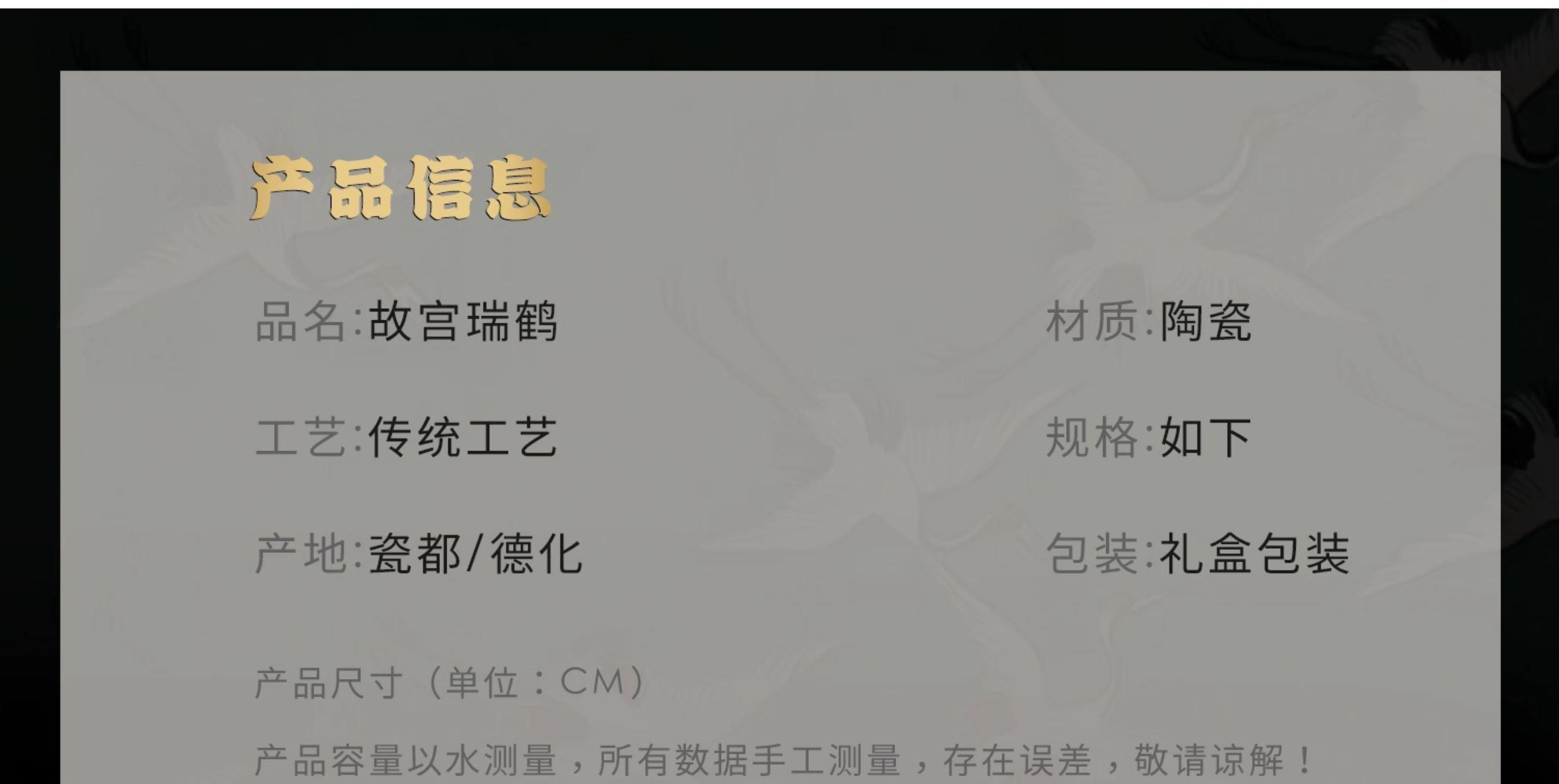 配置:提梁壶*1,茶杯*4,干泡盘*1,茶炉*1. 尺寸: 提梁壶直径10.5CM 高度15.6CM容量300ML, 茶杯直径6.8CM高度5.4CM容量90ML, 茶炉直径11.7CM 高度7CM, 茶盘长度27CM宽度12.5CM高度1.5CM, 礼盒长度36CM宽度13CM高度25.6CM。