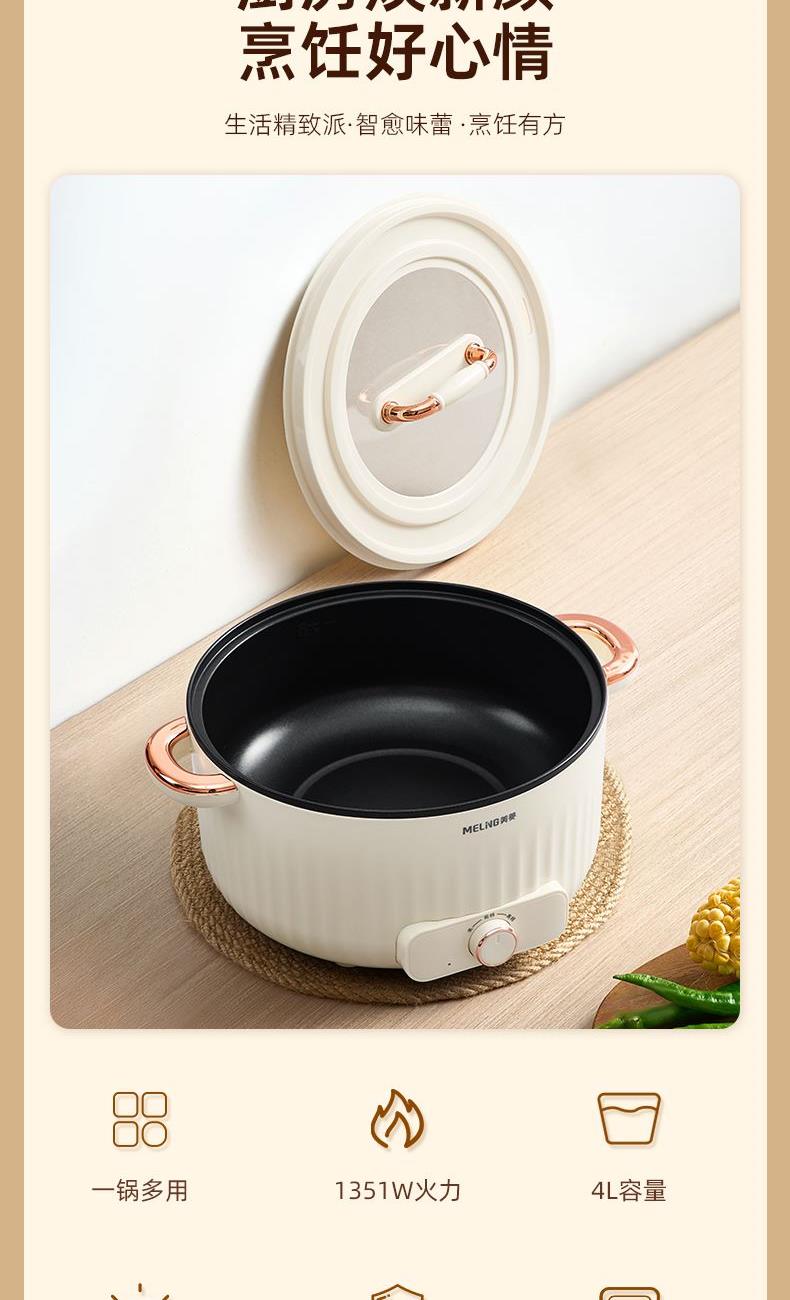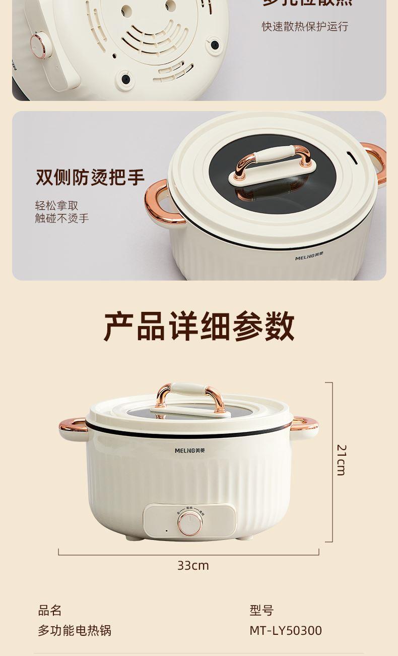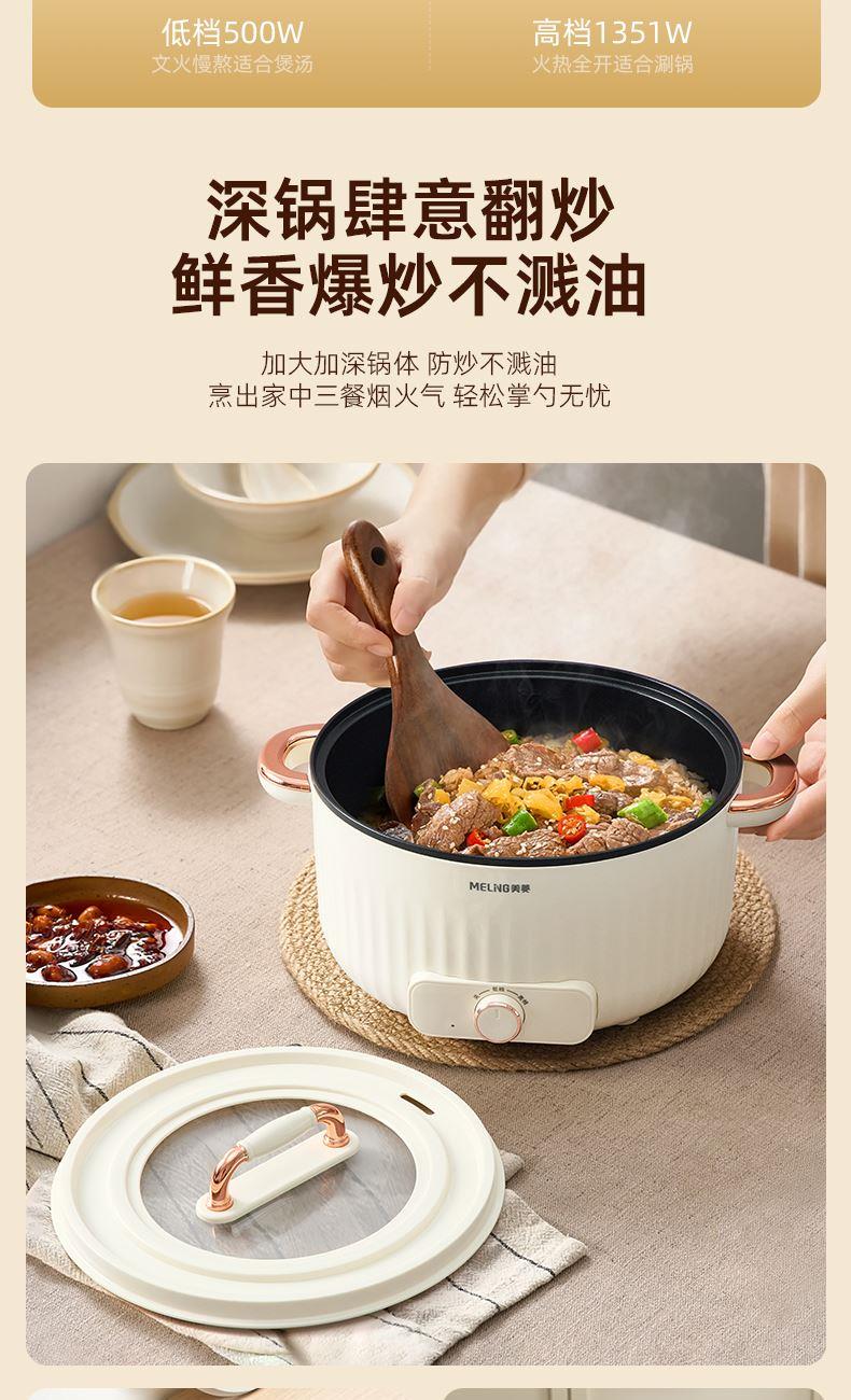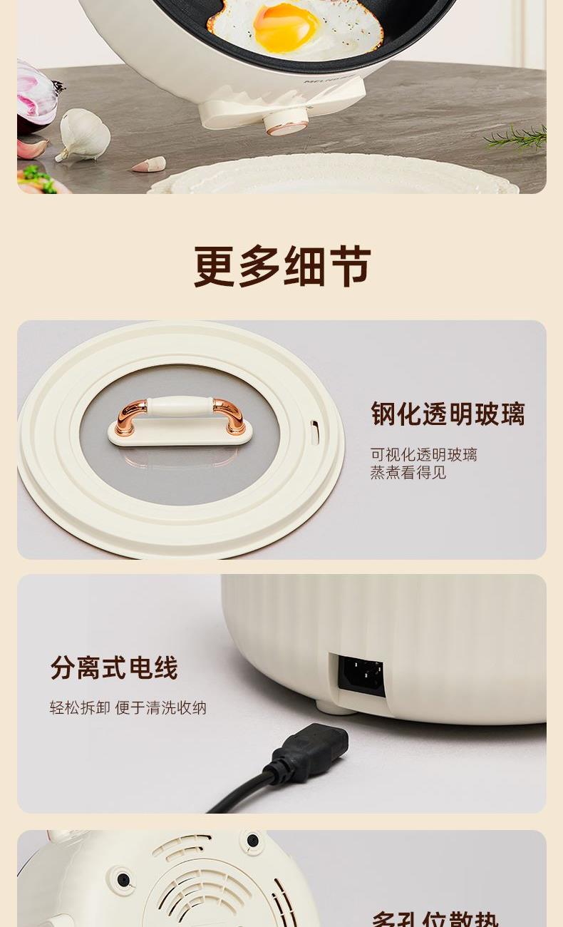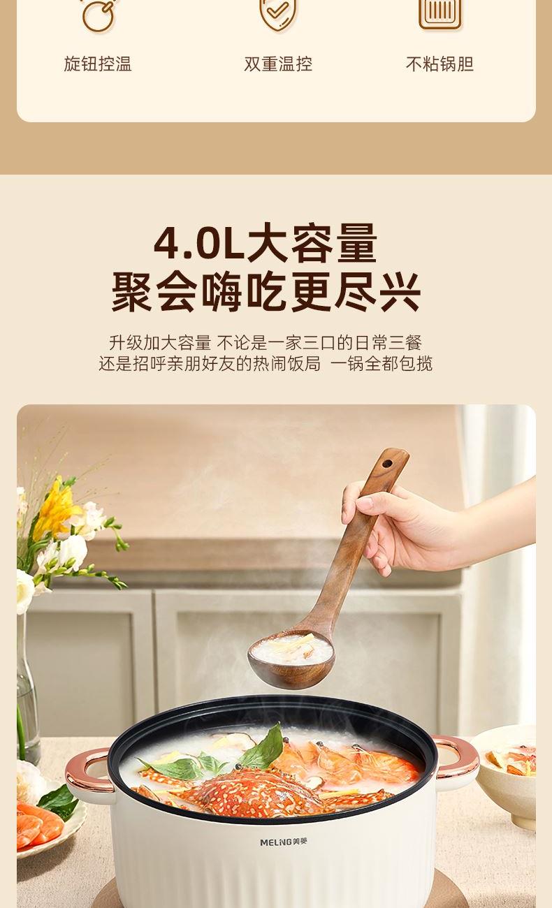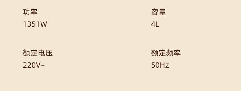 产品参数 额定功率:1350W 额定频率:50Hz 容量:4L 净重/毛重:1.4kg/1.68kg 额定电压:220V~ 条形码:6936897560997 1.4.0L大容量 2.花样功能 蒸、煮、涮、煲 3.钢化透明玻璃盖,蒸煮看得见 4.双重温控保护,安全放心 5.耐腐蚀 食品级材质 6.防烫舒适手柄,人体工程学设计, 握感舒适 7.分体式结构 提锅即断电,使用放心