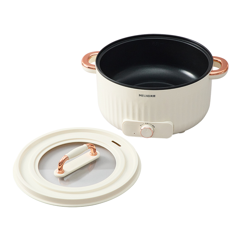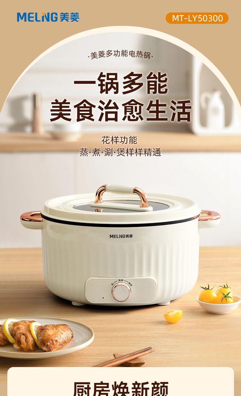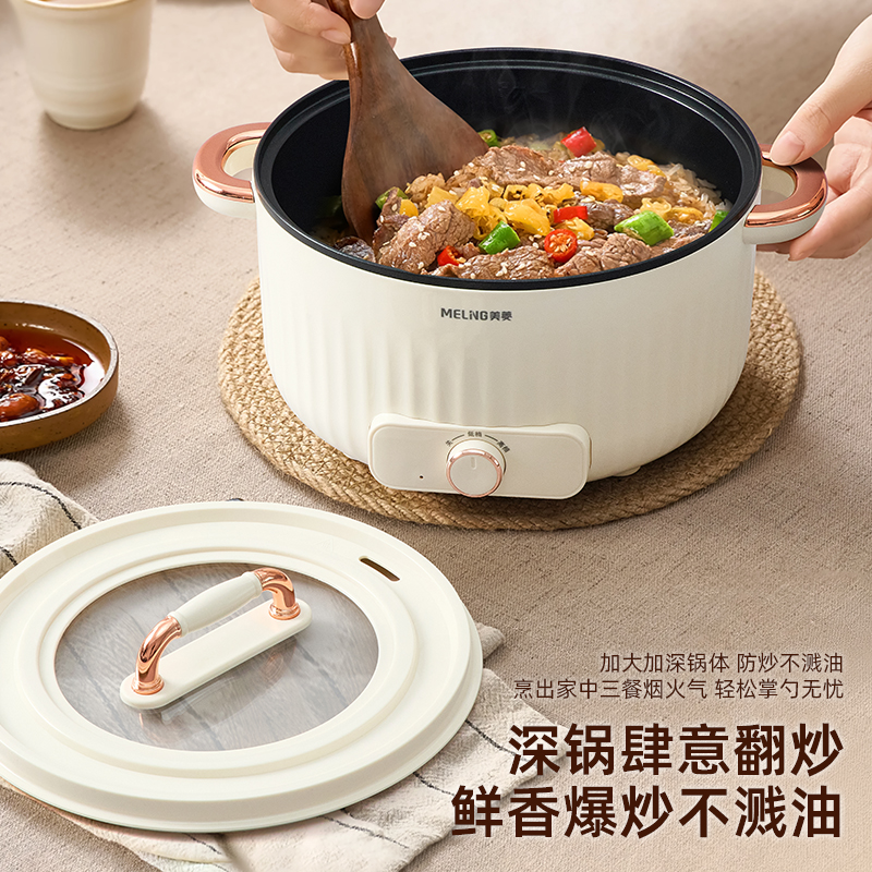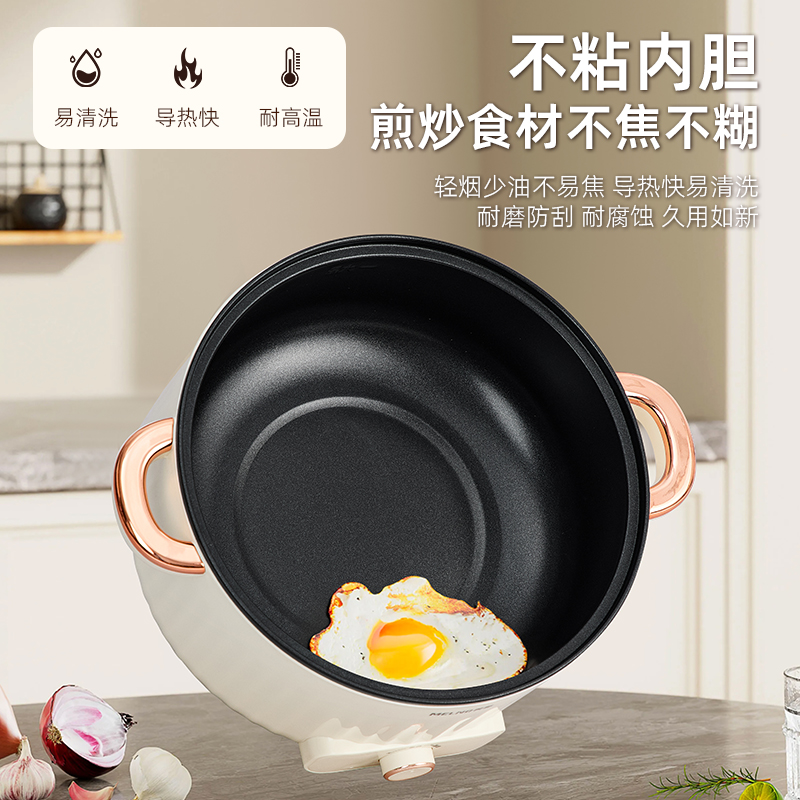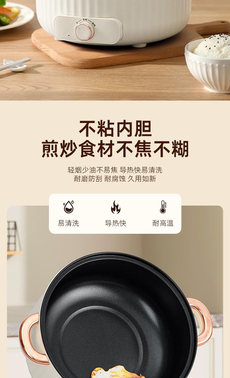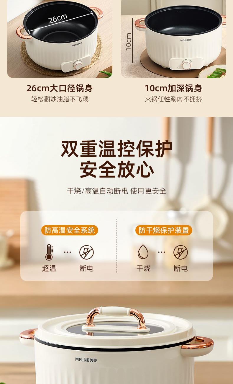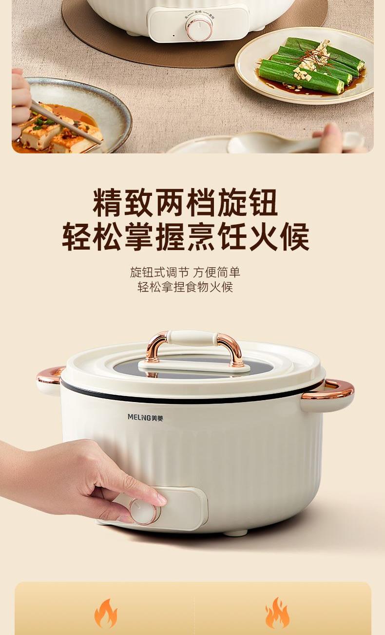 产品参数 额定功率:1350W 额定频率:50Hz 容量:4L 净重/毛重:1.4kg/1.68kg 额定电压:220V~ 条形码:6936897560997 1.4.0L大容量 2.花样功能 蒸、煮、涮、煲 3.钢化透明玻璃盖,蒸煮看得见 4.双重温控保护,安全放心 5.耐腐蚀 食品级材质 6.防烫舒适手柄,人体工程学设计, 握感舒适 7.分体式结构 提锅即断电,使用放心