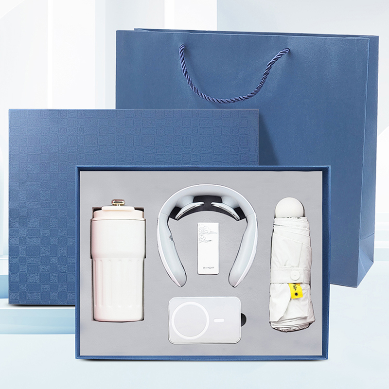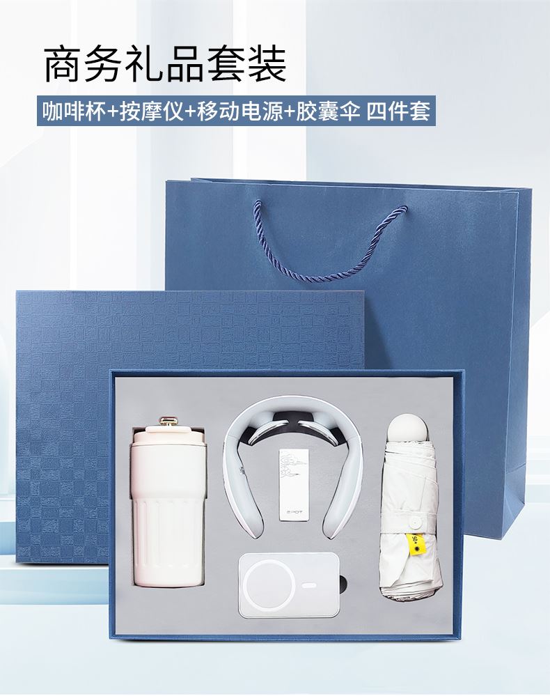 礼盒配置: 1、316内胆温显咖啡杯 2、颈部按摩仪(加热,脉冲) 3、21寸5折6骨钢胶囊伞(高密度碰击黑胶布) 4、10000毫安磁吸快充移动电源 5、蓝色包装盒尺寸:350x270x106mm 6、蓝色手提袋尺寸:360x300x116mm 7、重量:20kg/箱