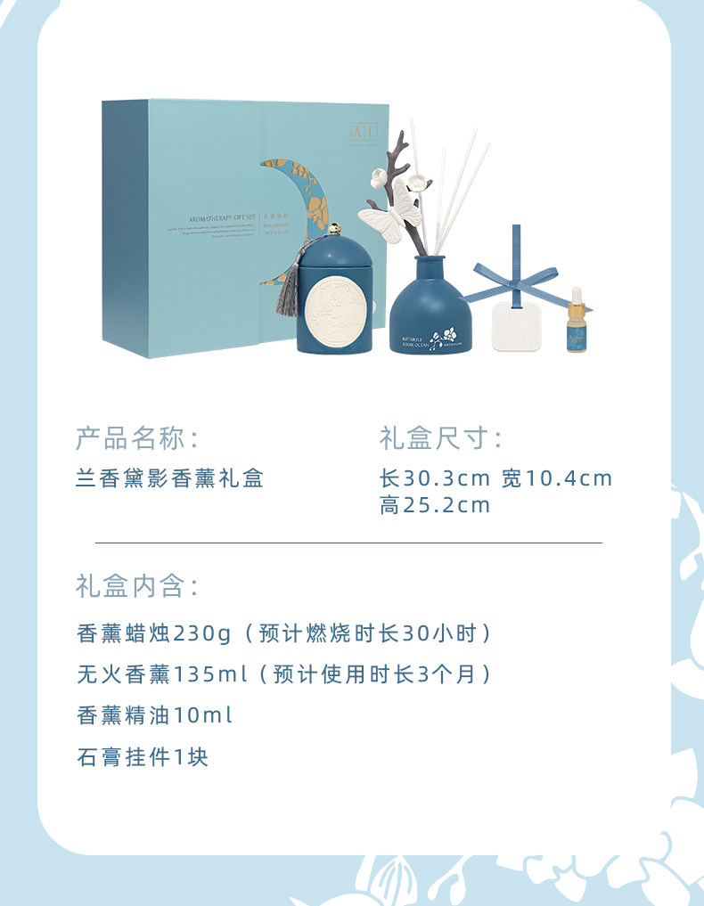 香薰蜡烛230g、无火香薰135m1 香薰精油10m、石膏挂件1块 礼盒尺寸:30.3*10.4*25.2cm
