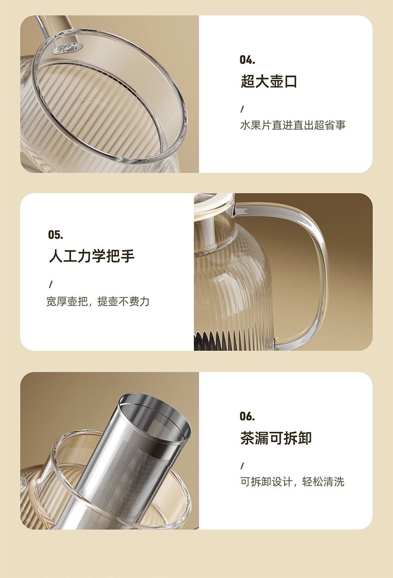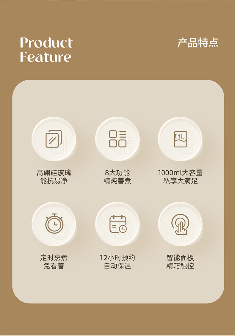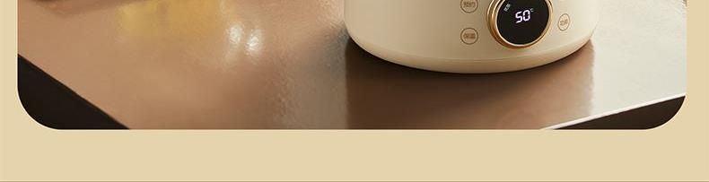 主要材质:高硼硅玻璃 电压:220V 功率:530W 容量:1L 颜色:里米尼白 1、数显触摸控制,8大功能菜单 2、高硼硅玻璃材质,耐冷热不开裂 4、分体式设计,玻璃壶体易清洗 5、自动保温,暖胃热饮在手边 6、轻音炖煮,工作养生互不打扰 7、12H预约功能,美味无需等待 8、智能提壶记忆,告别重设调温